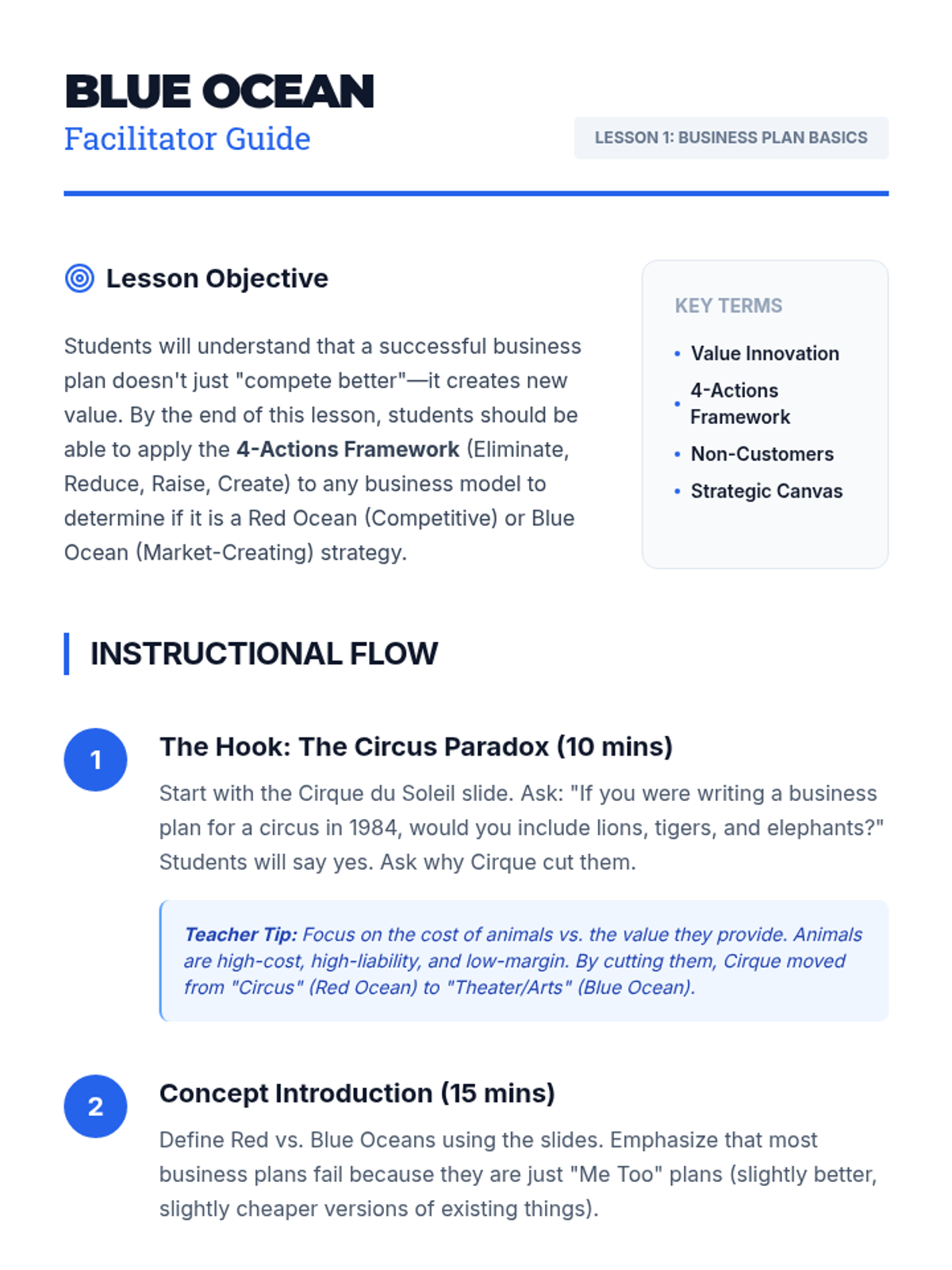 A lesson focused on business storytelling and pitch deck structure. Students learn to frame their marketing campaign as a problem-solving narrative using the 10-Slide Rule and 'invisible' design principles.