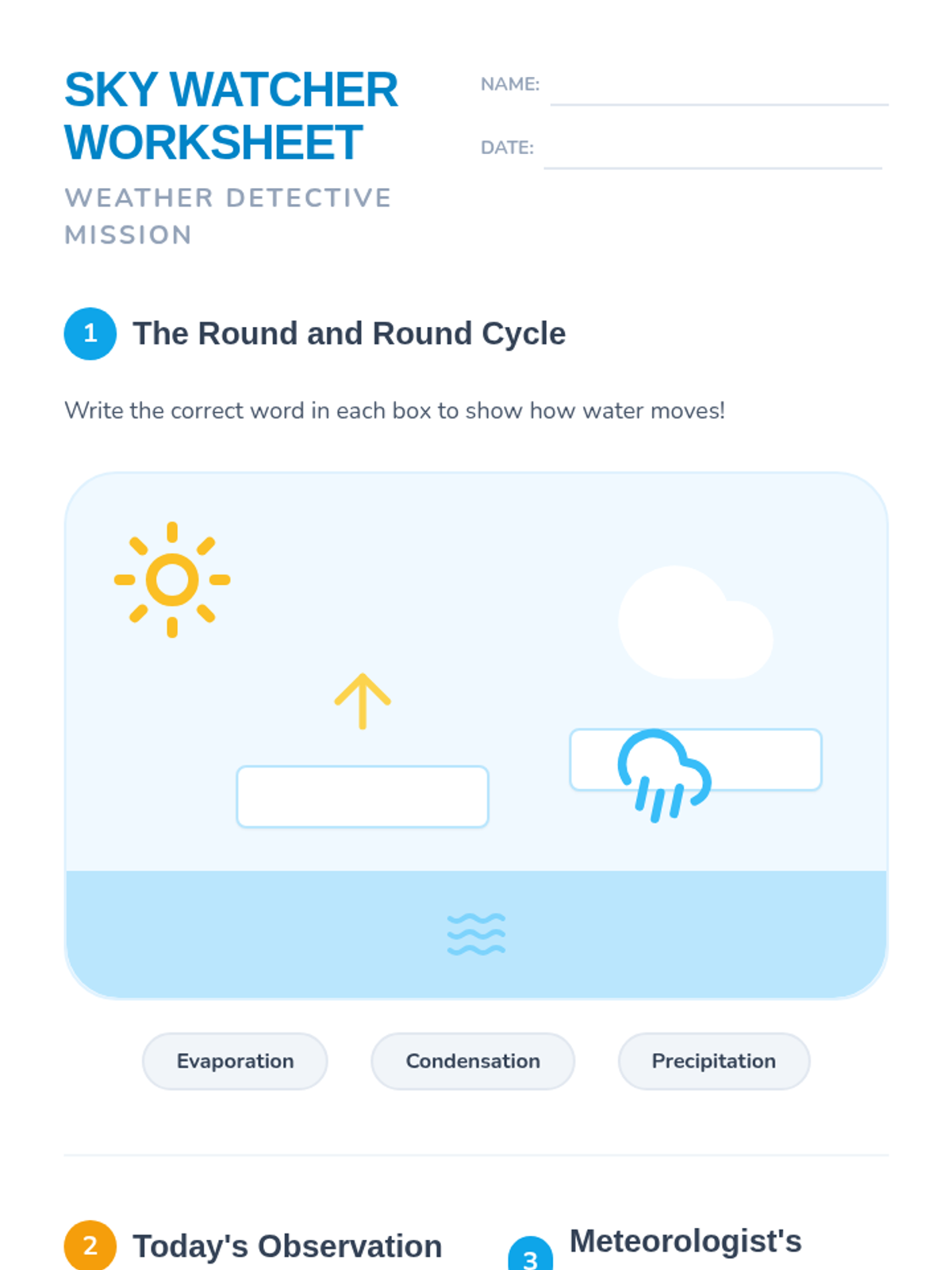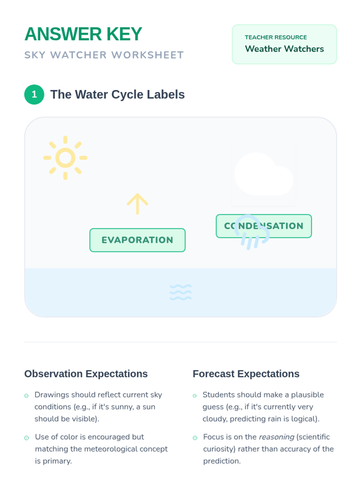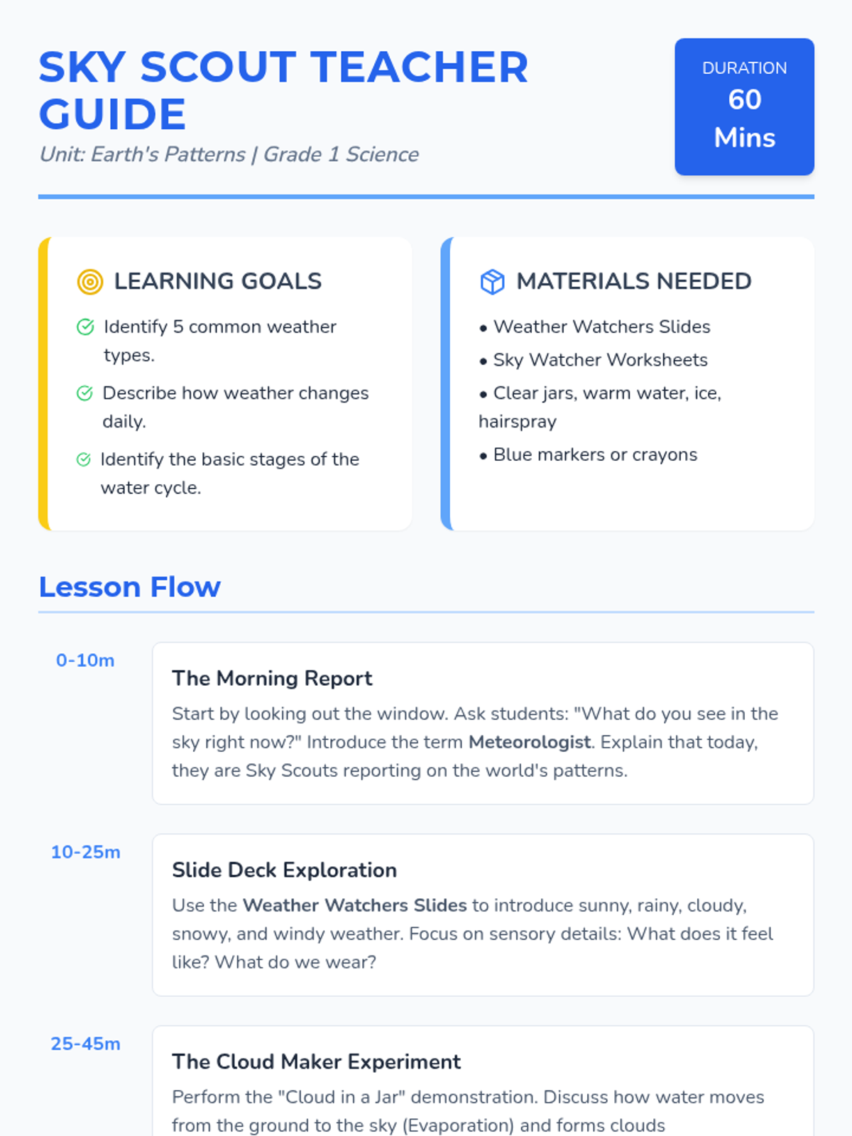 An introductory weather lesson for 1st graders focusing on observation, the water cycle, and basic forecasting through hands-on activities and visual learning.