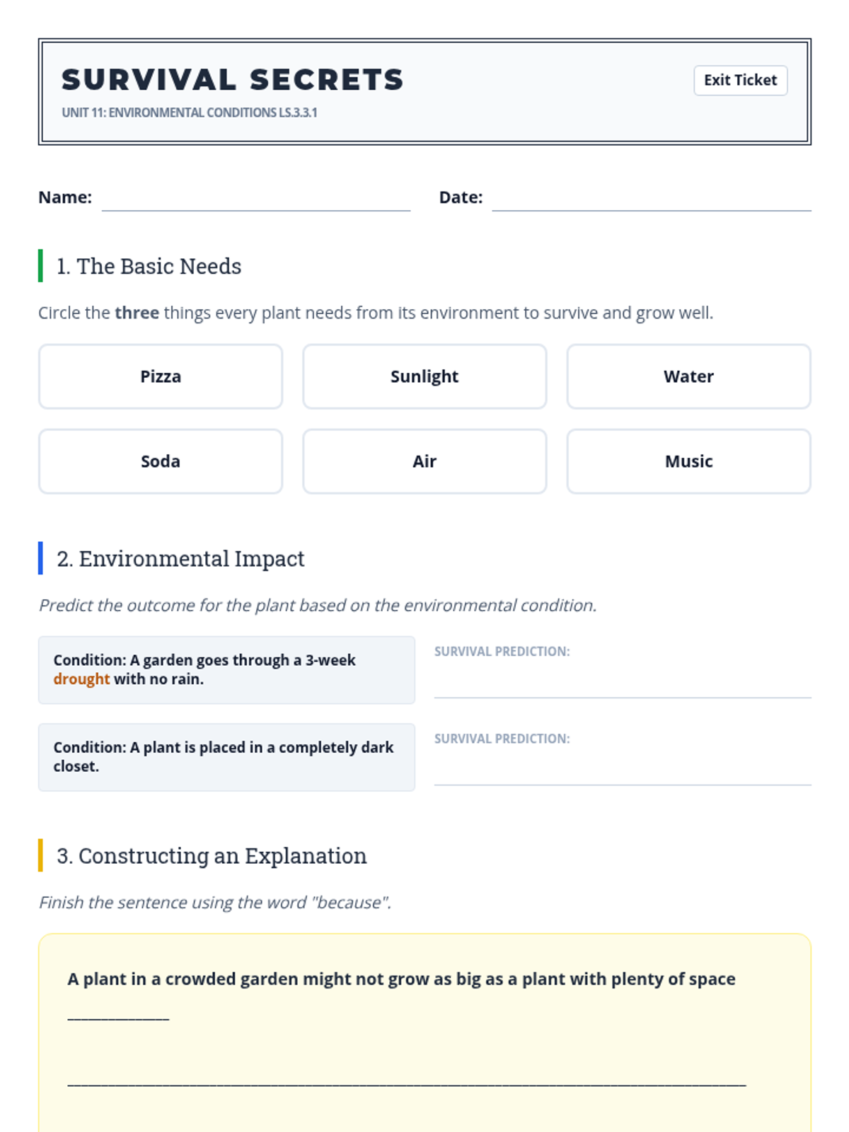 Students synthesize their knowledge by investigating how plant structures adapt to different environments for survival.