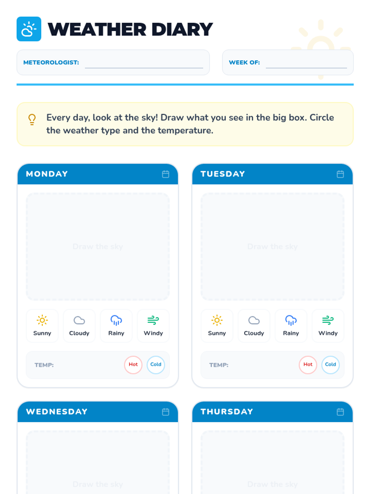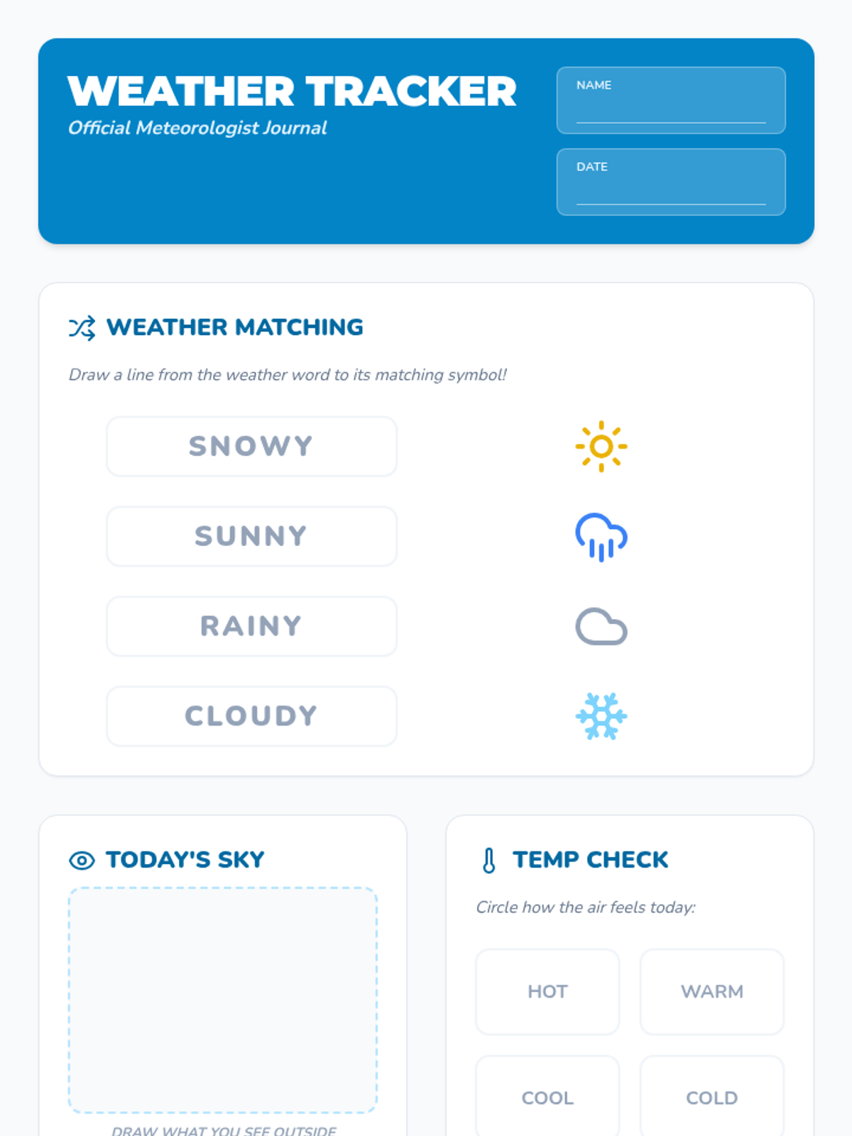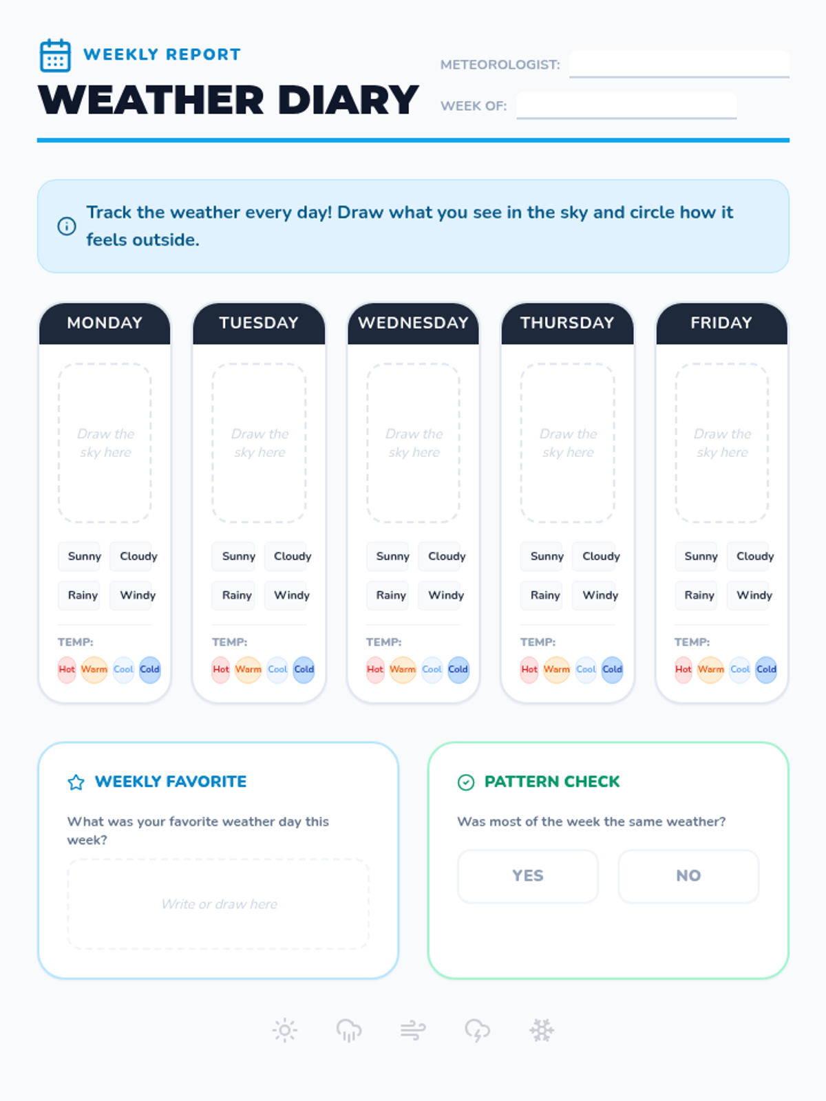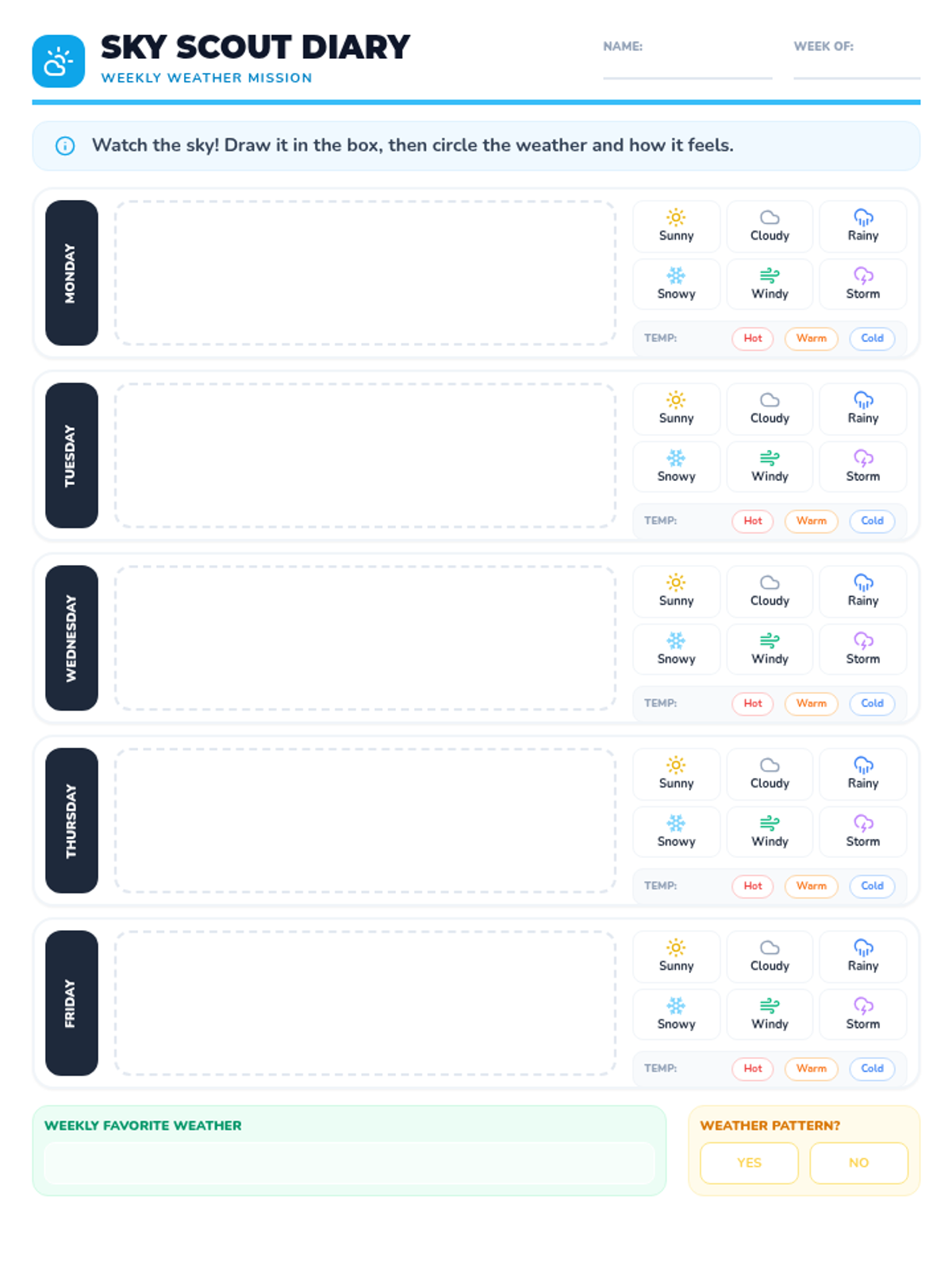 A vibrant introduction to weather patterns for Kindergarteners, focusing on observation and daily tracking. Students explore different types of weather through visual aids, movement, and a weekly weather journal.