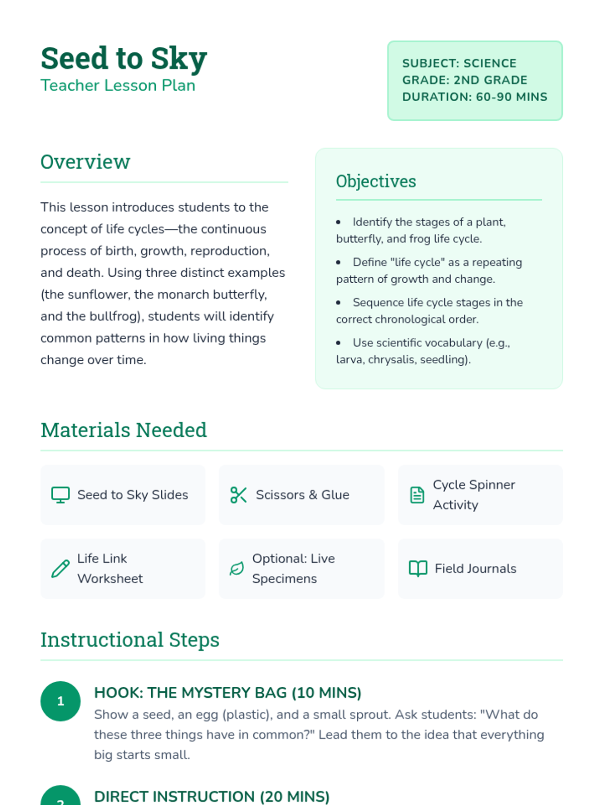 A comprehensive 2-week science lesson for 3rd grade focusing on plant structures, their functions, survival needs, and the complete life cycle of seed plants. Students will investigate how plants interact with their environment and soil to thrive.
