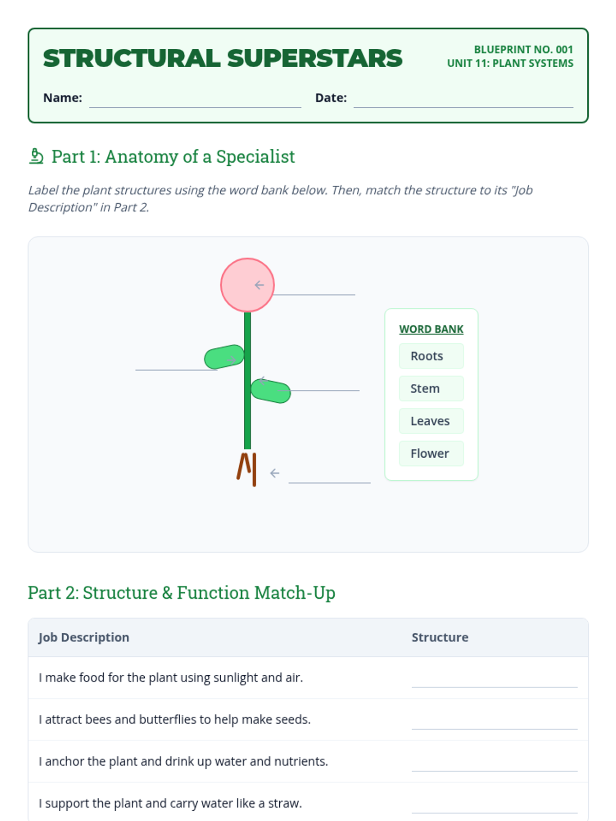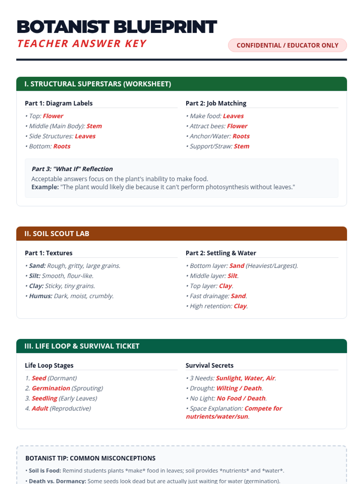 A concise, 5-day science unit covering plant structures, life cycles, environmental needs, and soil types designed for 20-minute instructional blocks.