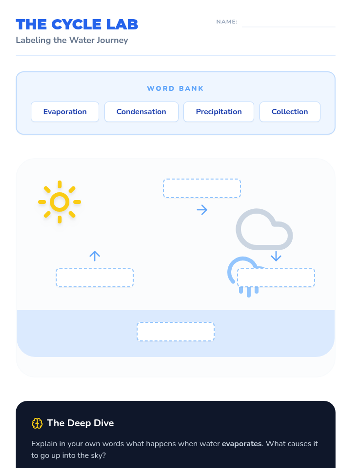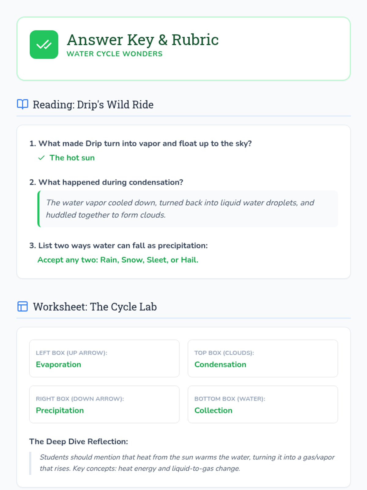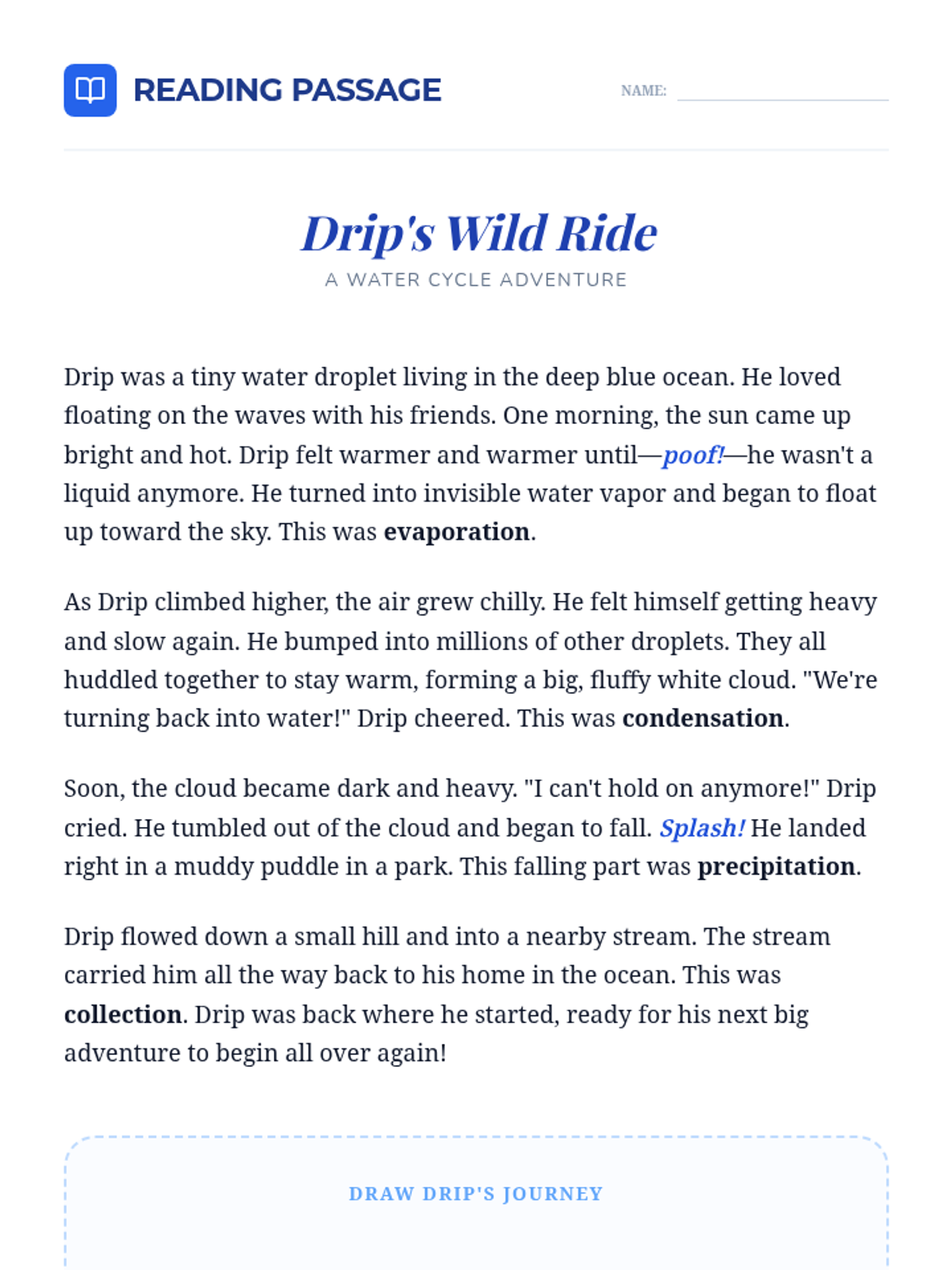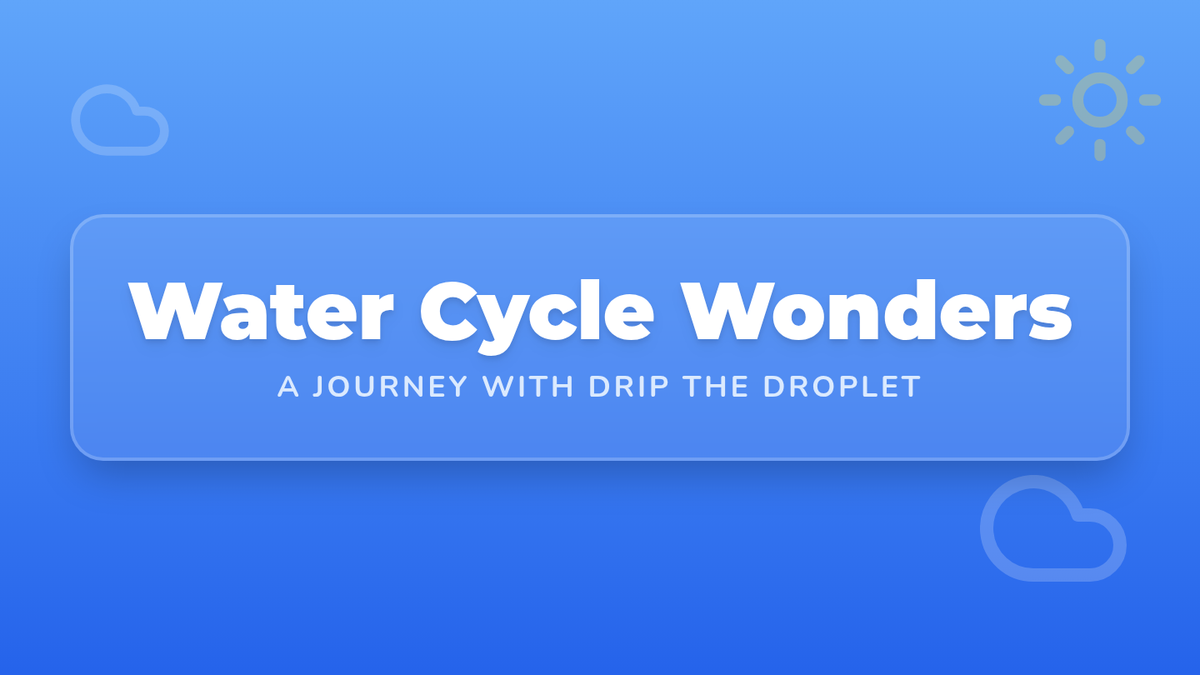An engaging introduction to the water cycle for 2nd graders, featuring a hands-on experiment, a narrative story about a water droplet, and visual aids to explain evaporation, condensation, and precipitation.