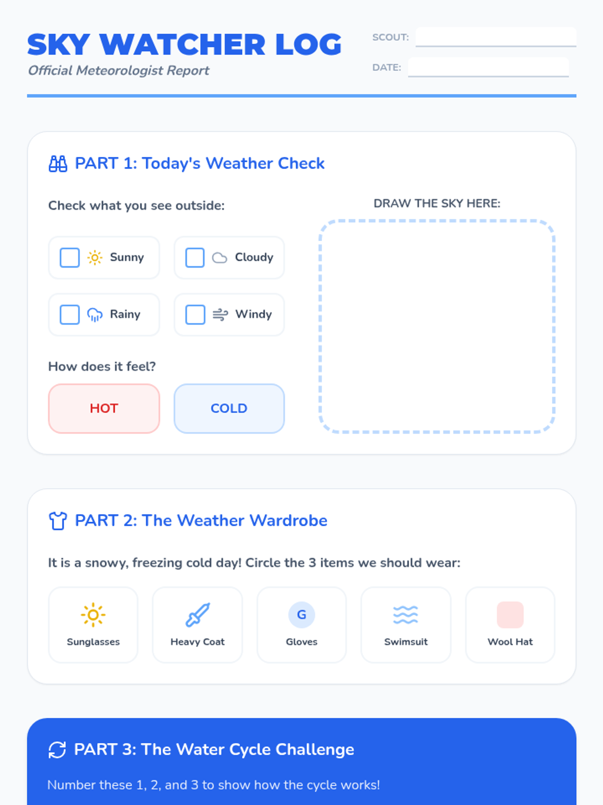 An introductory weather lesson for 1st graders focusing on observation, basic patterns, and the water cycle. Students act as meteorologists to identify weather types and track daily changes.
