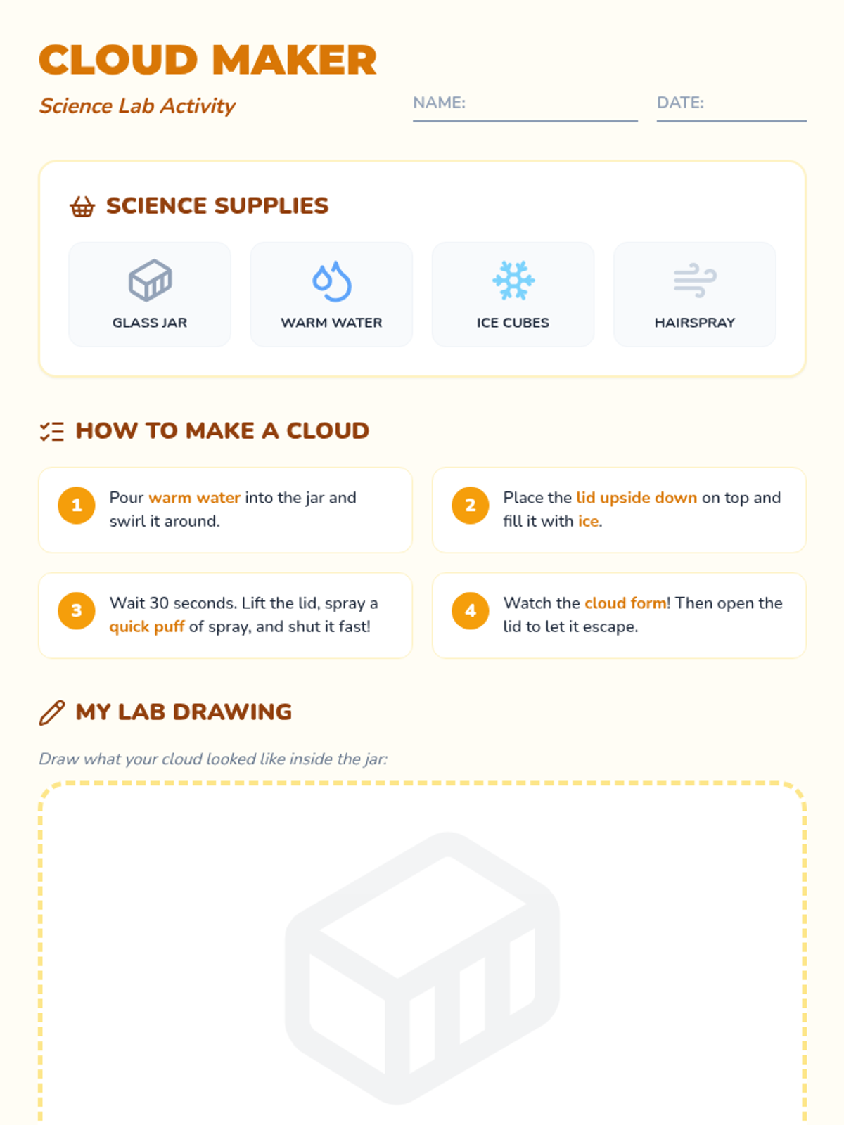 Introduces students to basic weather types (sunny, rainy, cloudy) through visual observation and a hands-on 'rain cloud in a jar' experiment.