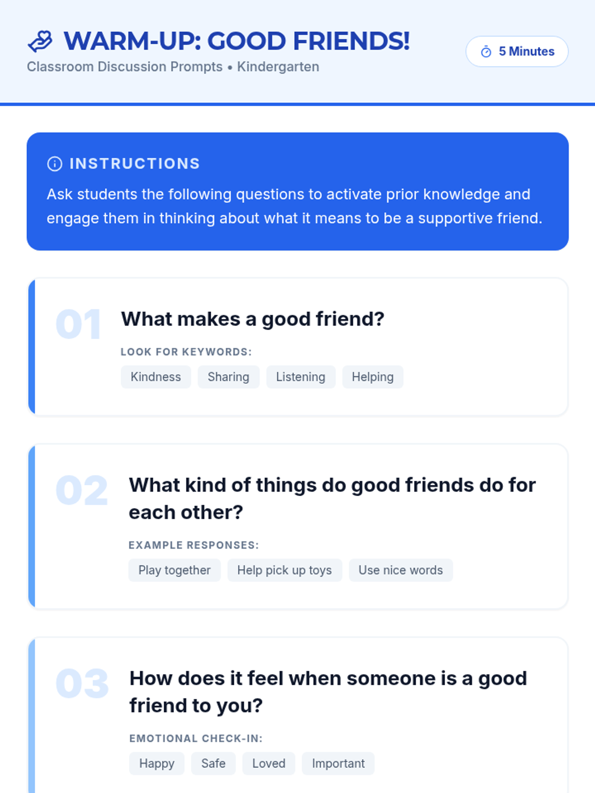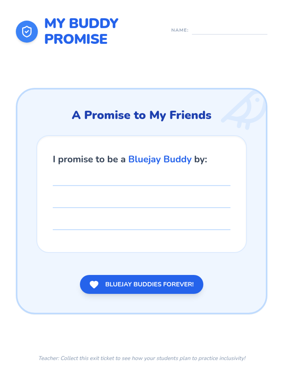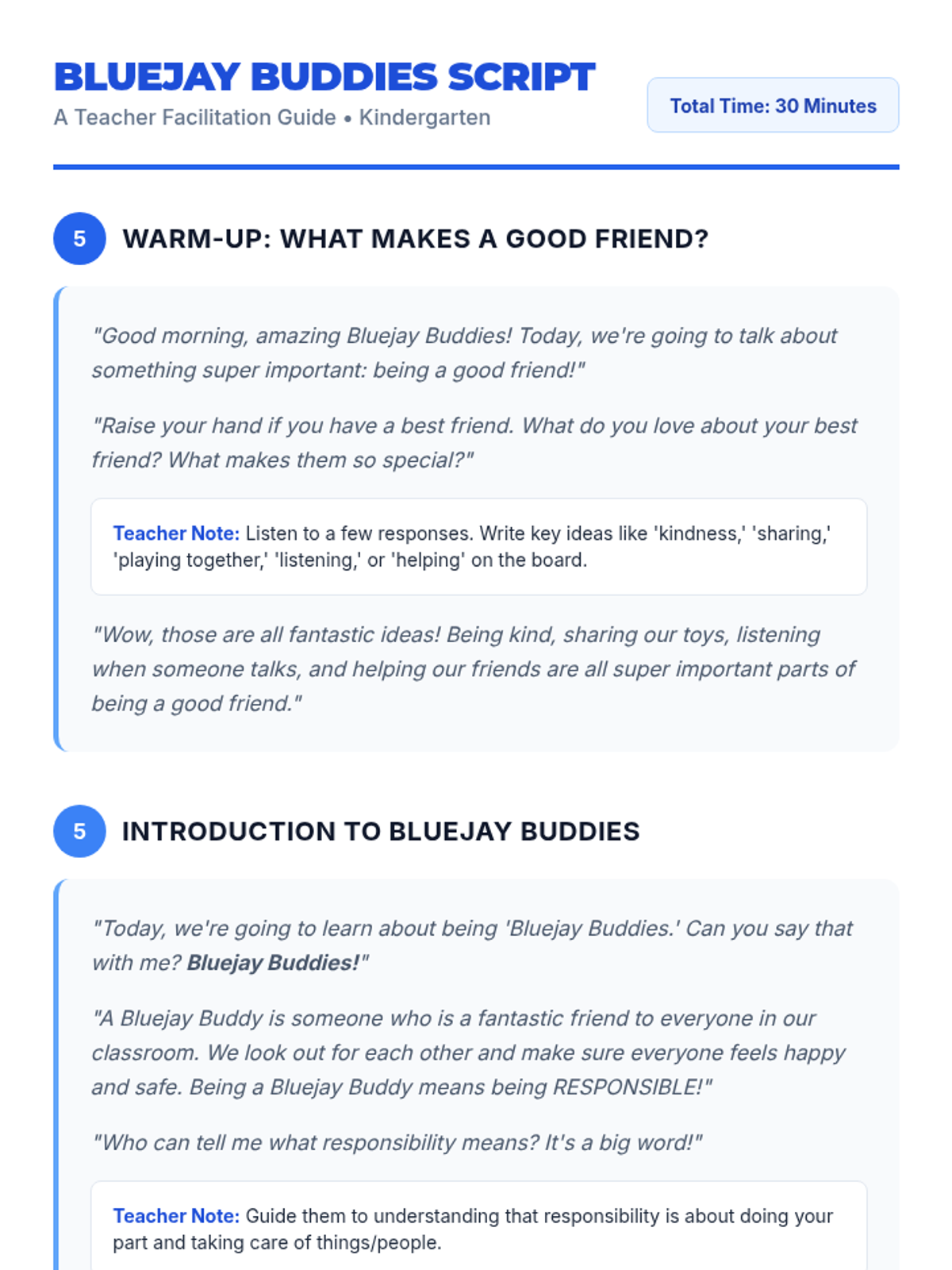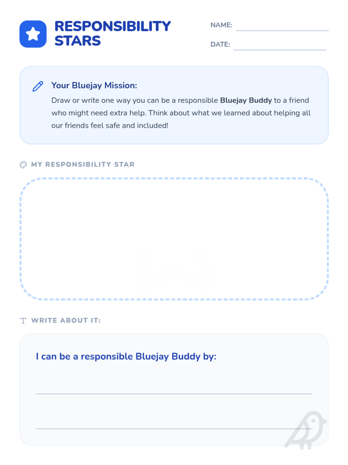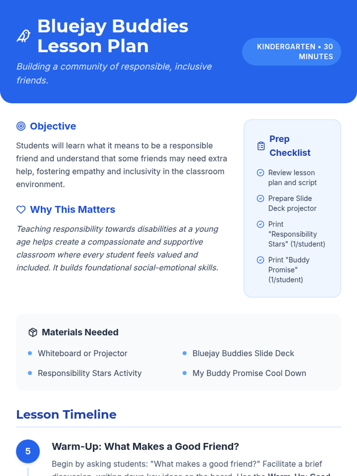 A 30-minute Kindergarten lesson on responsibility and inclusivity, teaching students how to be supportive 'Bluejay Buddies' to classmates with disabilities.