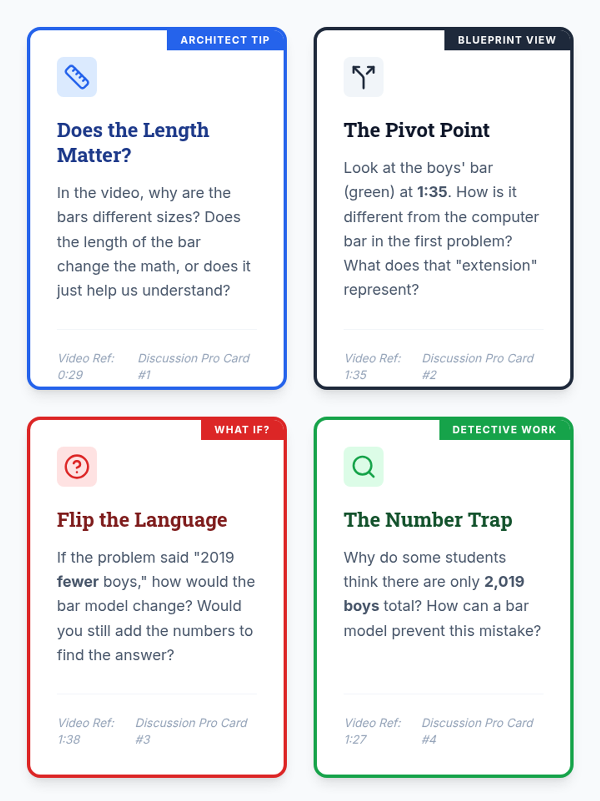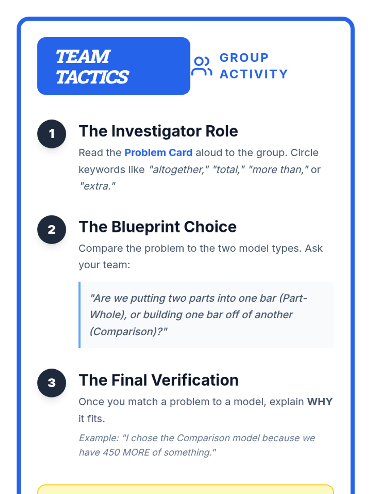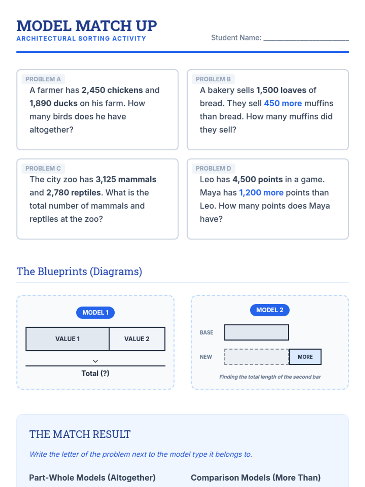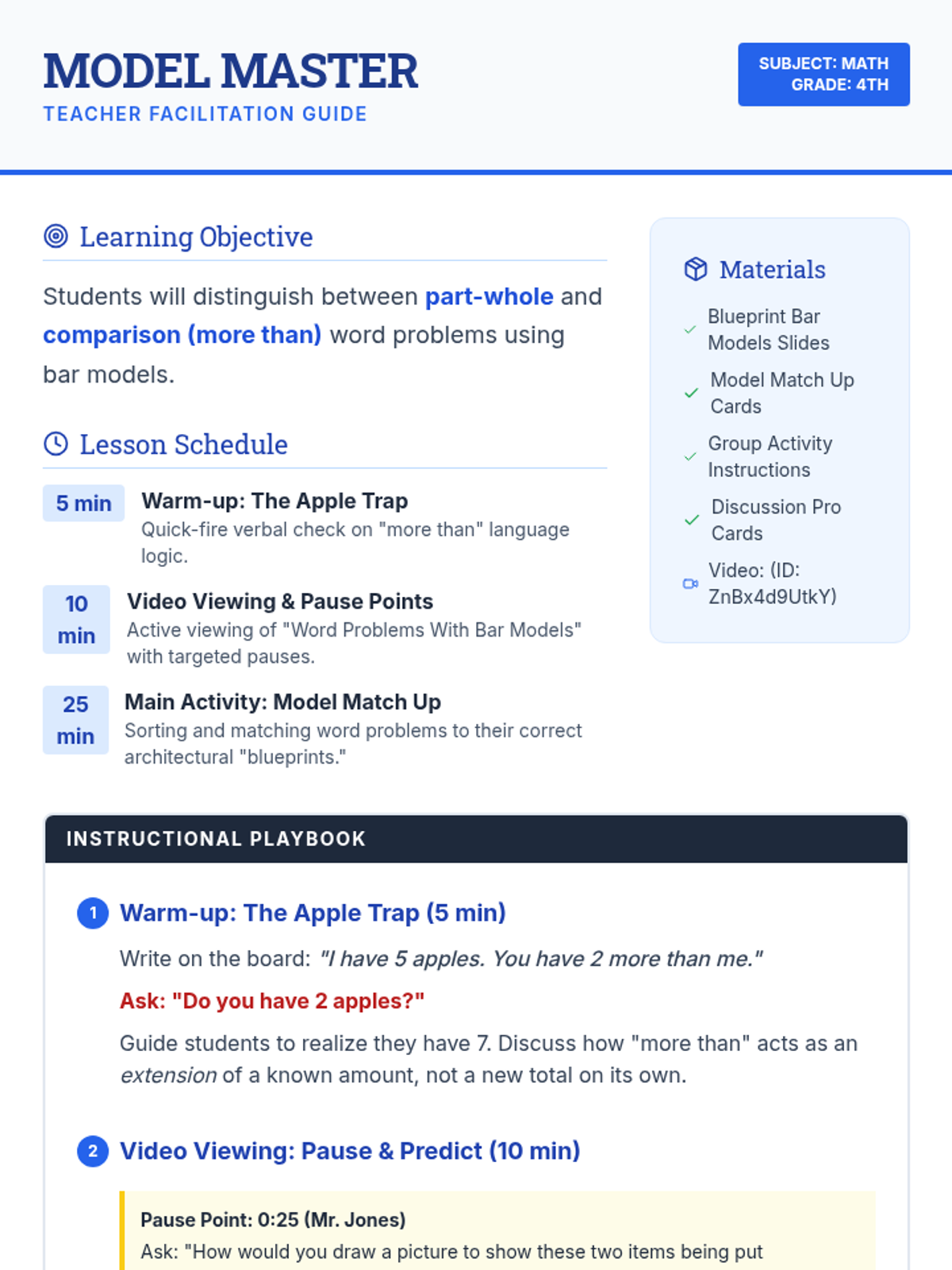 A 4th-grade math lesson focused on distinguishing between part-whole and comparison (more than) word problems using bar models, featuring a guided video analysis and a matching activity.