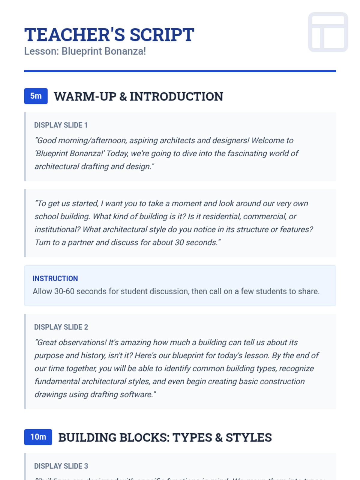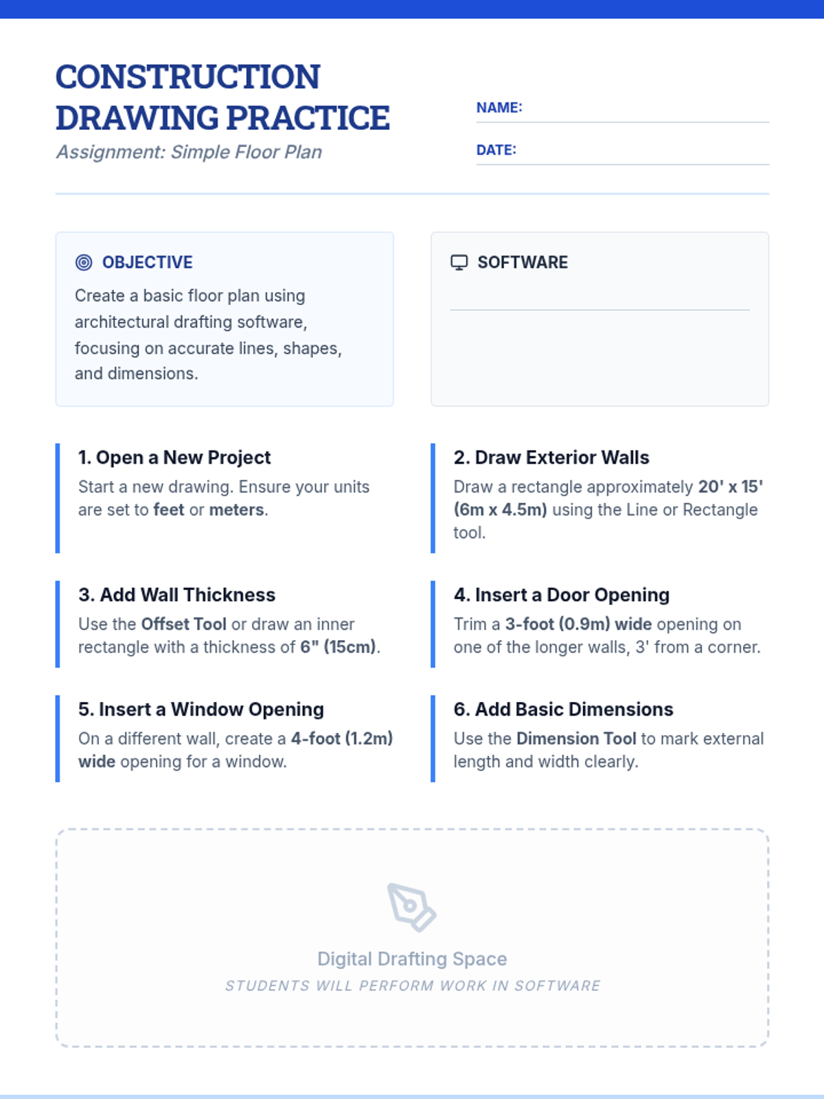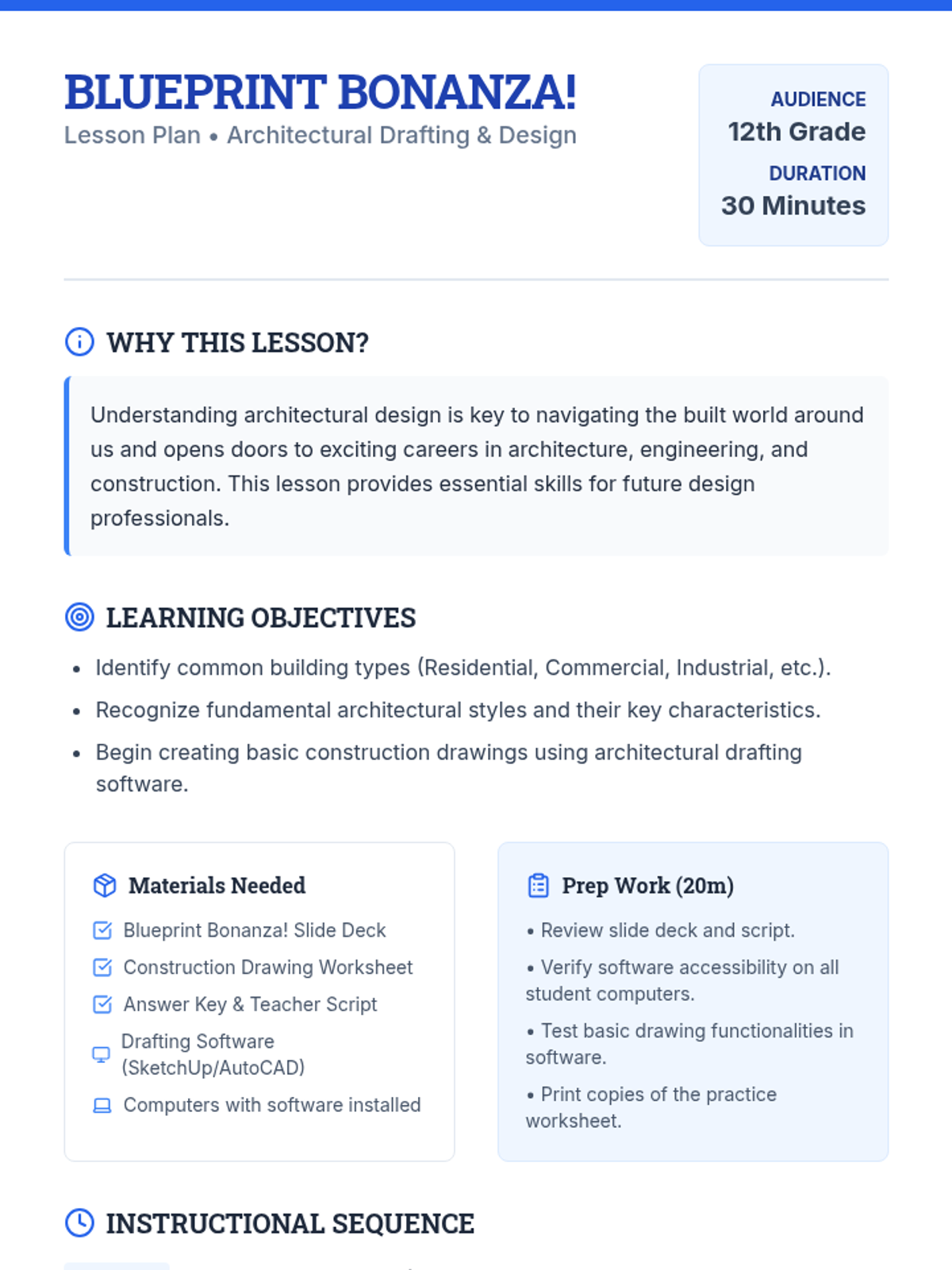This 30-minute introductory lesson for 12th graders explores architectural building types and styles before diving into hands-on experience with digital drafting software to create basic construction drawings.