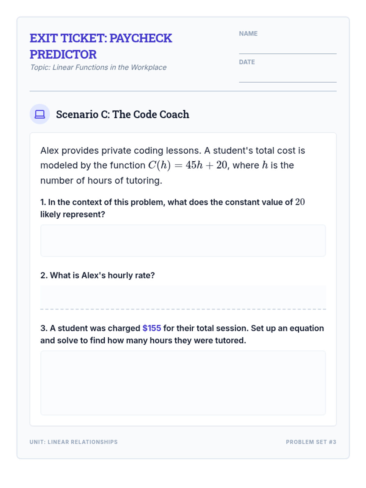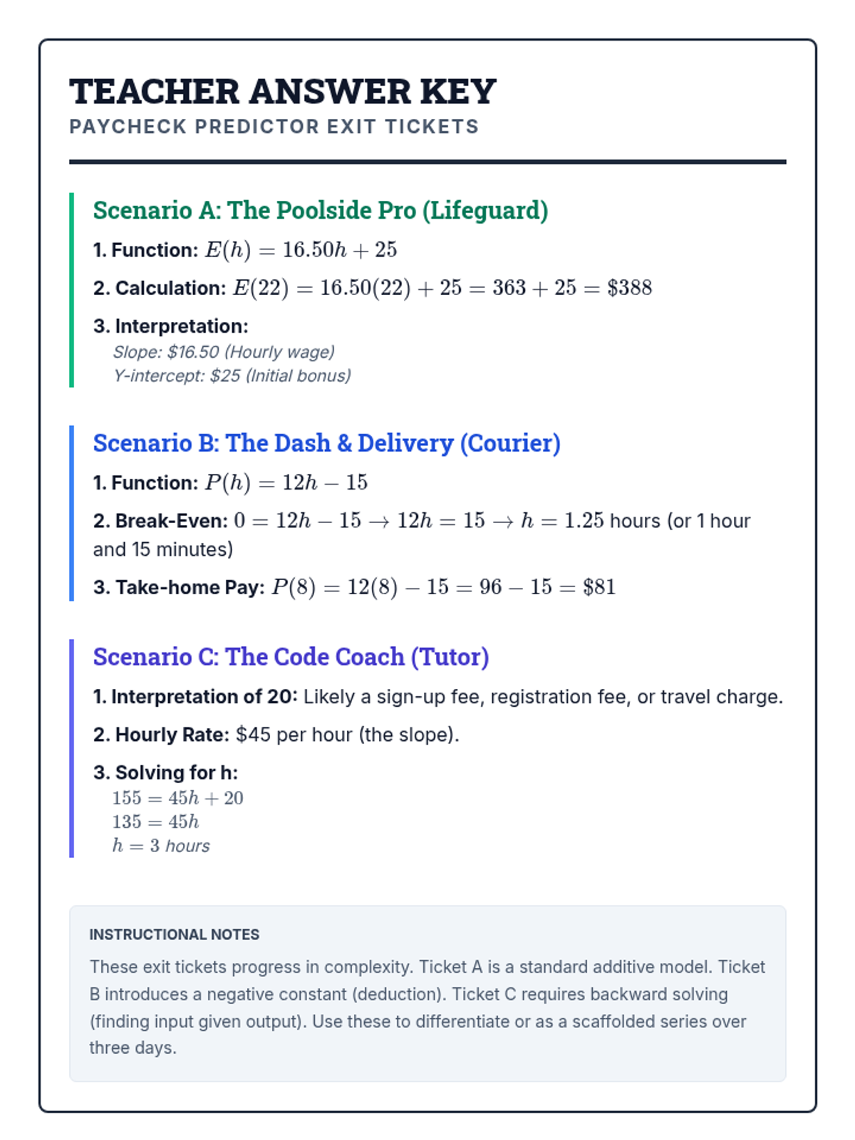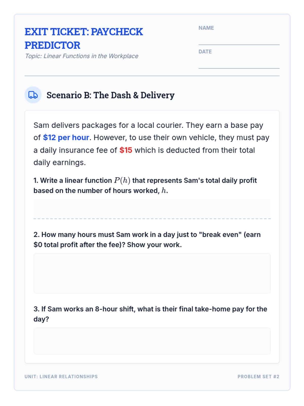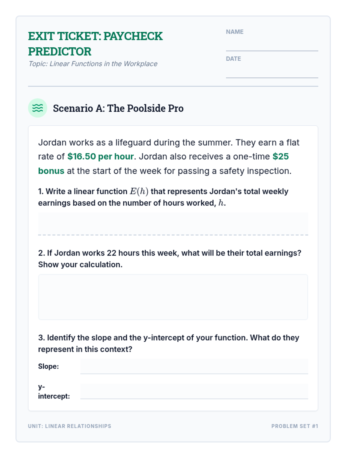 A collection of real-world application problems focused on linear functions through the lens of hourly wages, base pay, and total earnings. Students practice modeling situations with the equation y = mx + b.