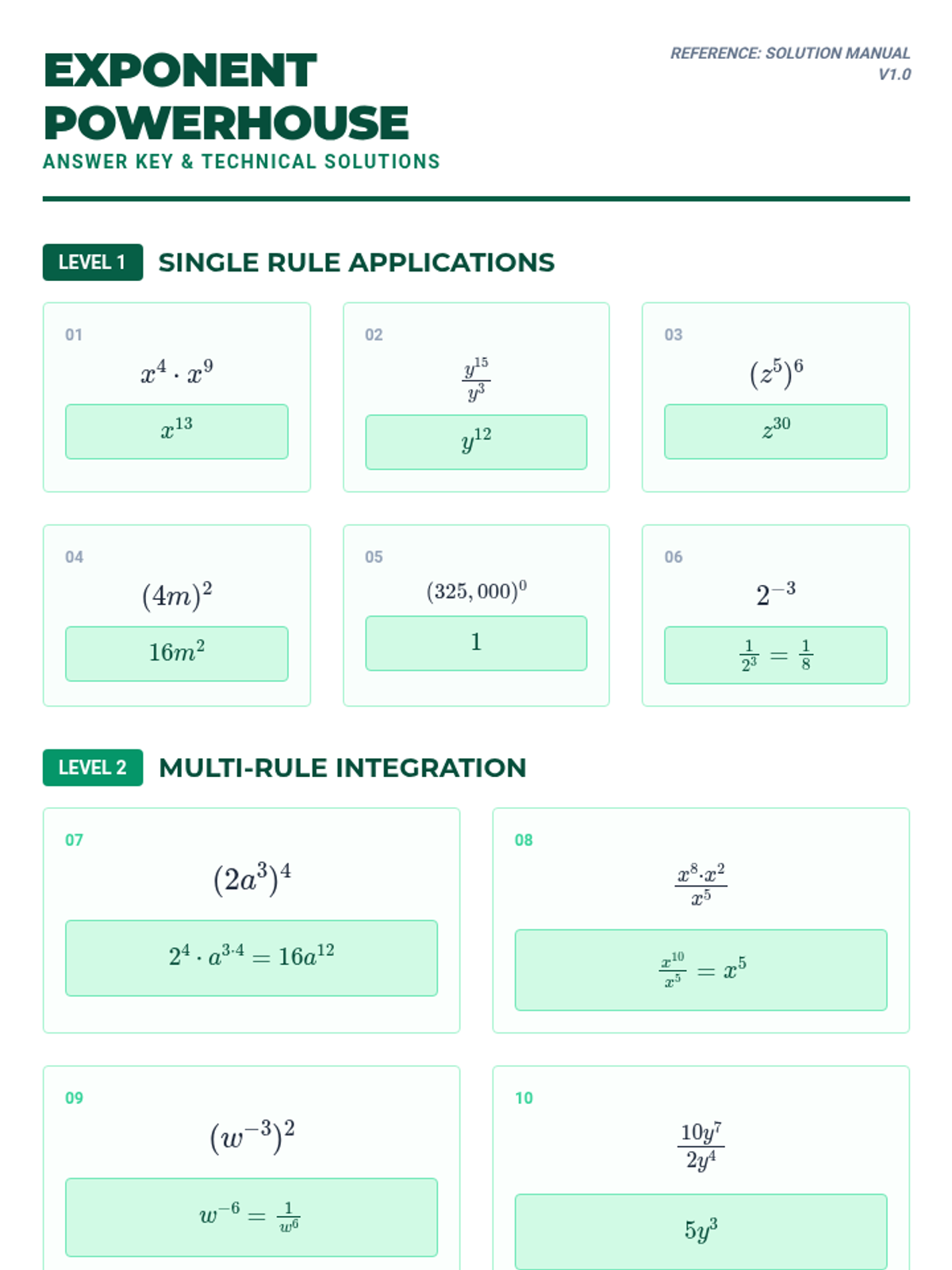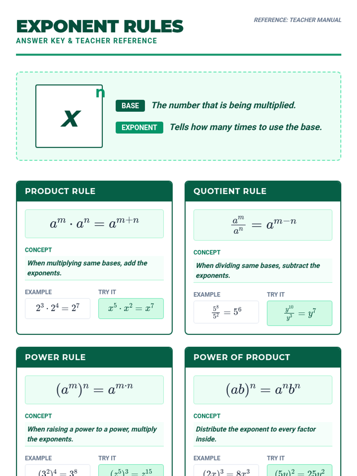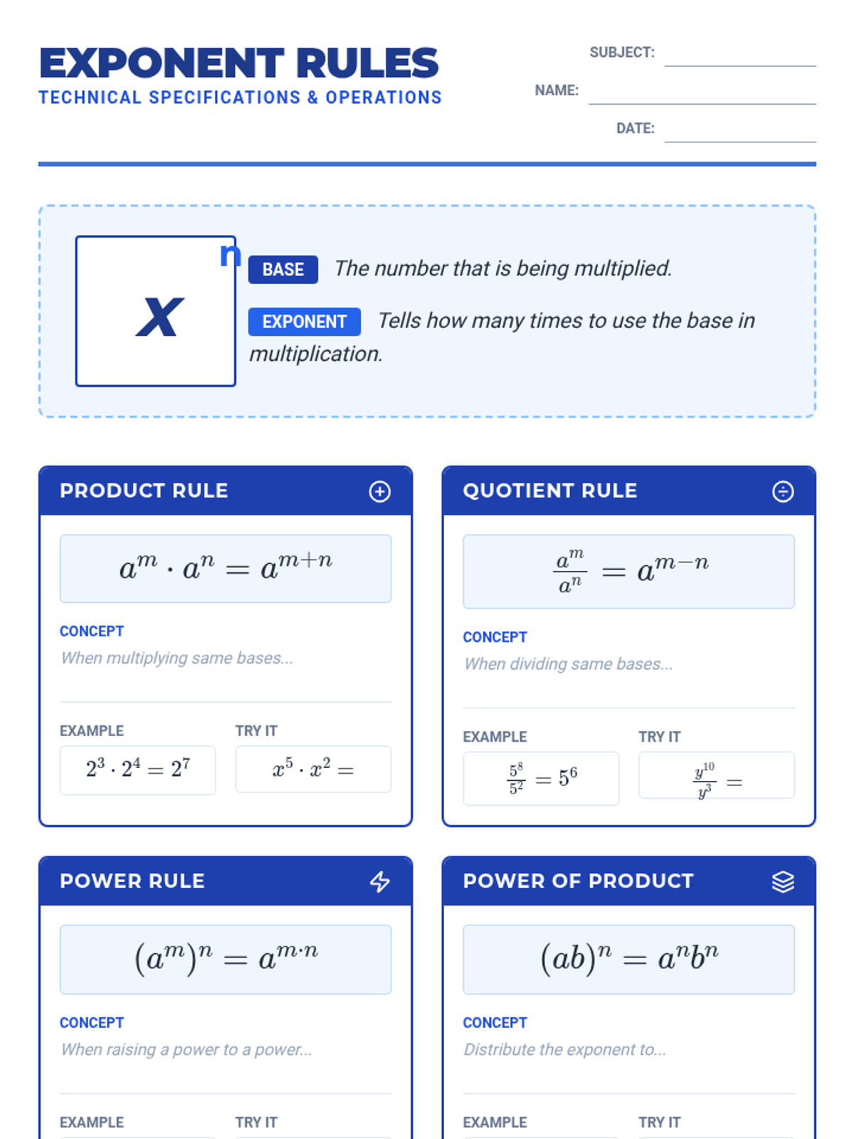 A comprehensive guide to mastering exponent rules, including product, quotient, power, zero, negative, and fractional (rational) exponents through technical organizers and tiered practice.
