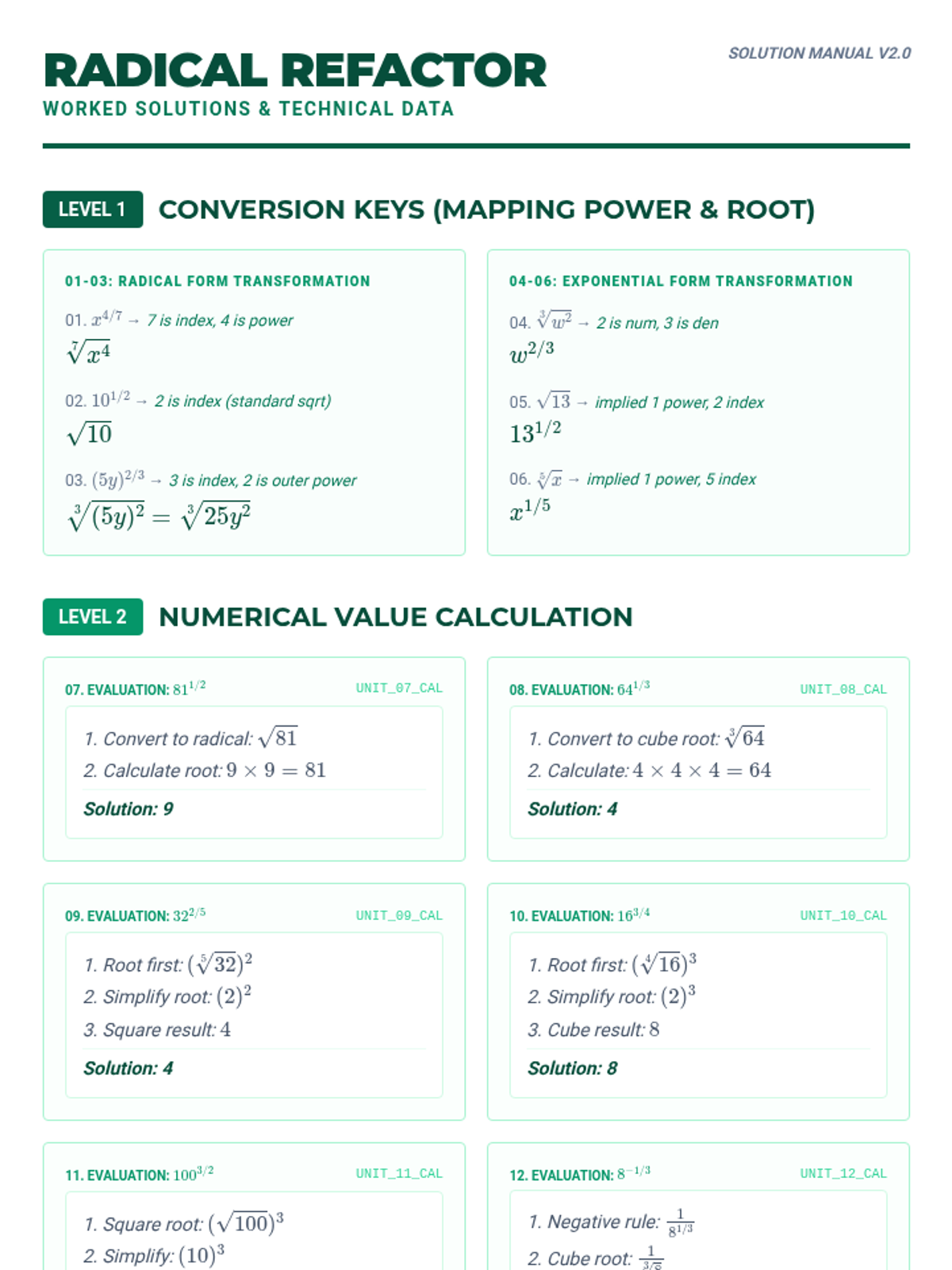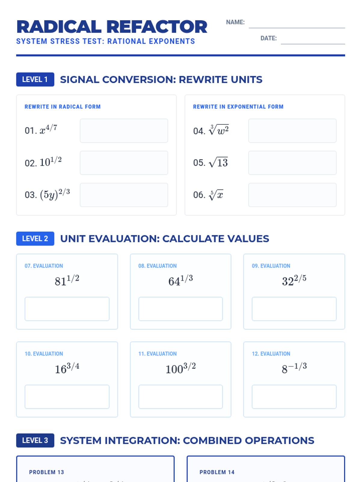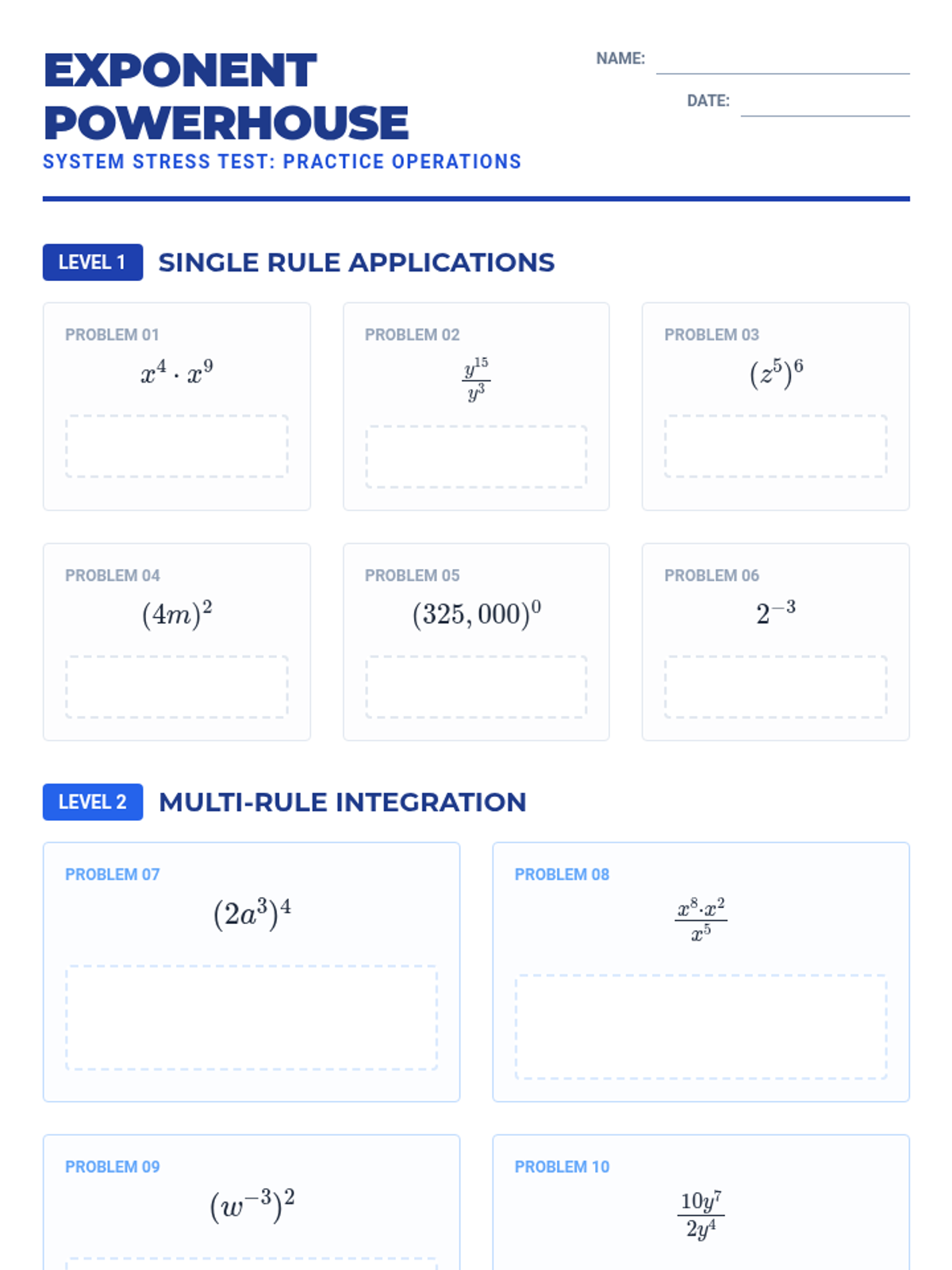 A comprehensive guide to mastering exponent rules, including product, quotient, power, zero, negative, and fractional (rational) exponents through technical organizers and tiered practice.