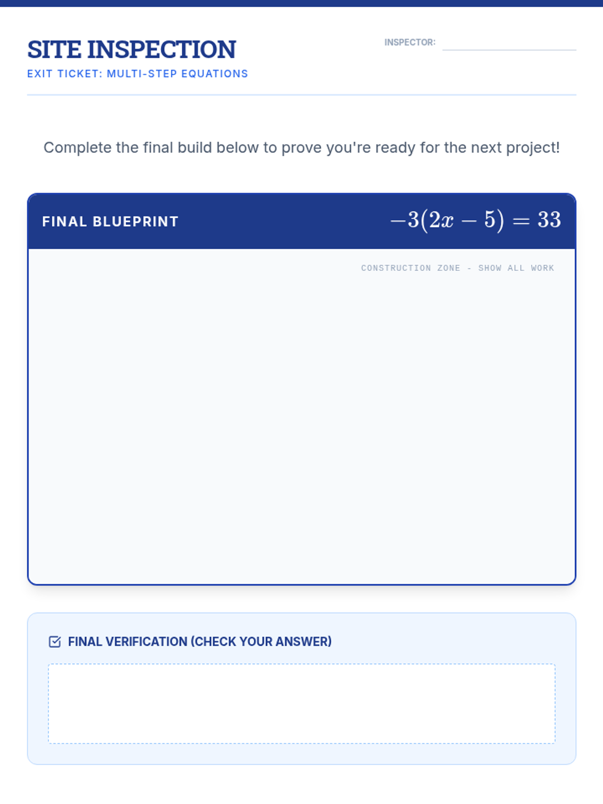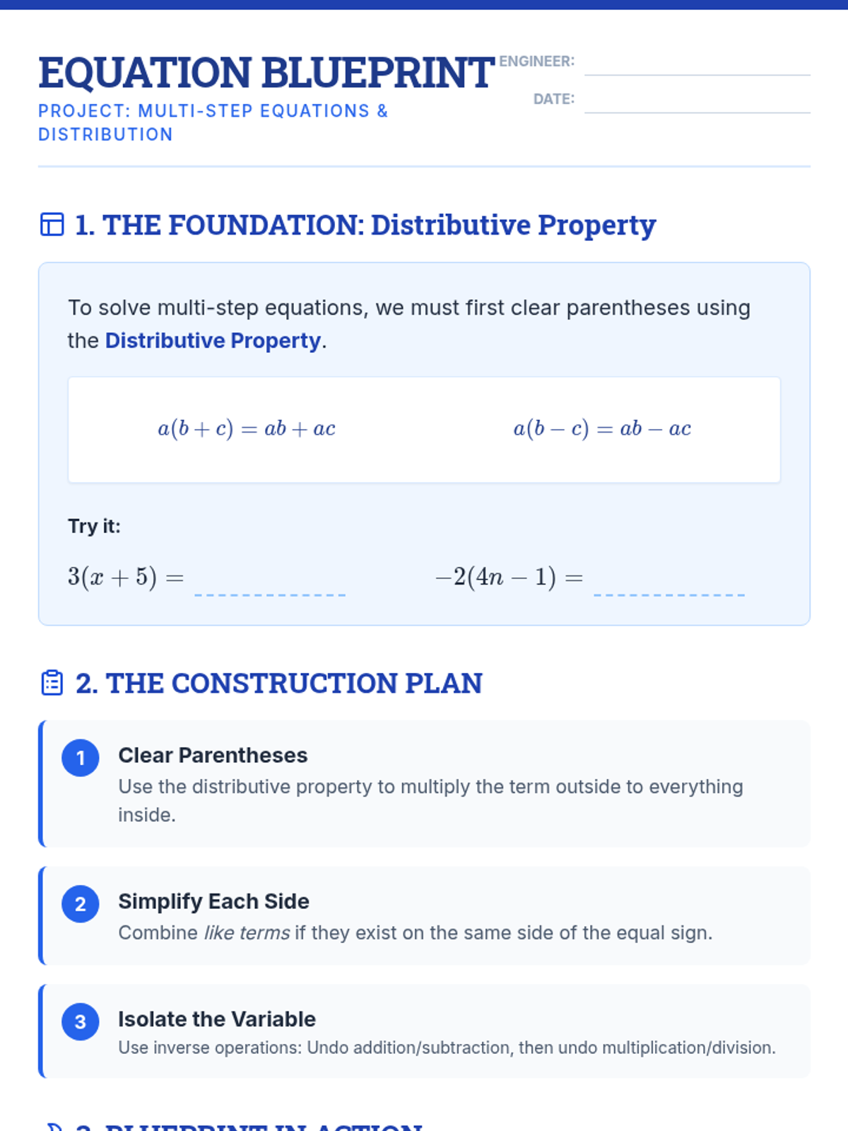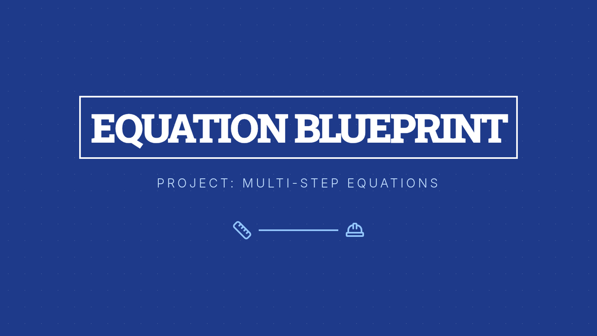 A lesson focused on solving multi-step equations using the distributive property, featuring a structured 'blueprint' approach to algebraic construction.