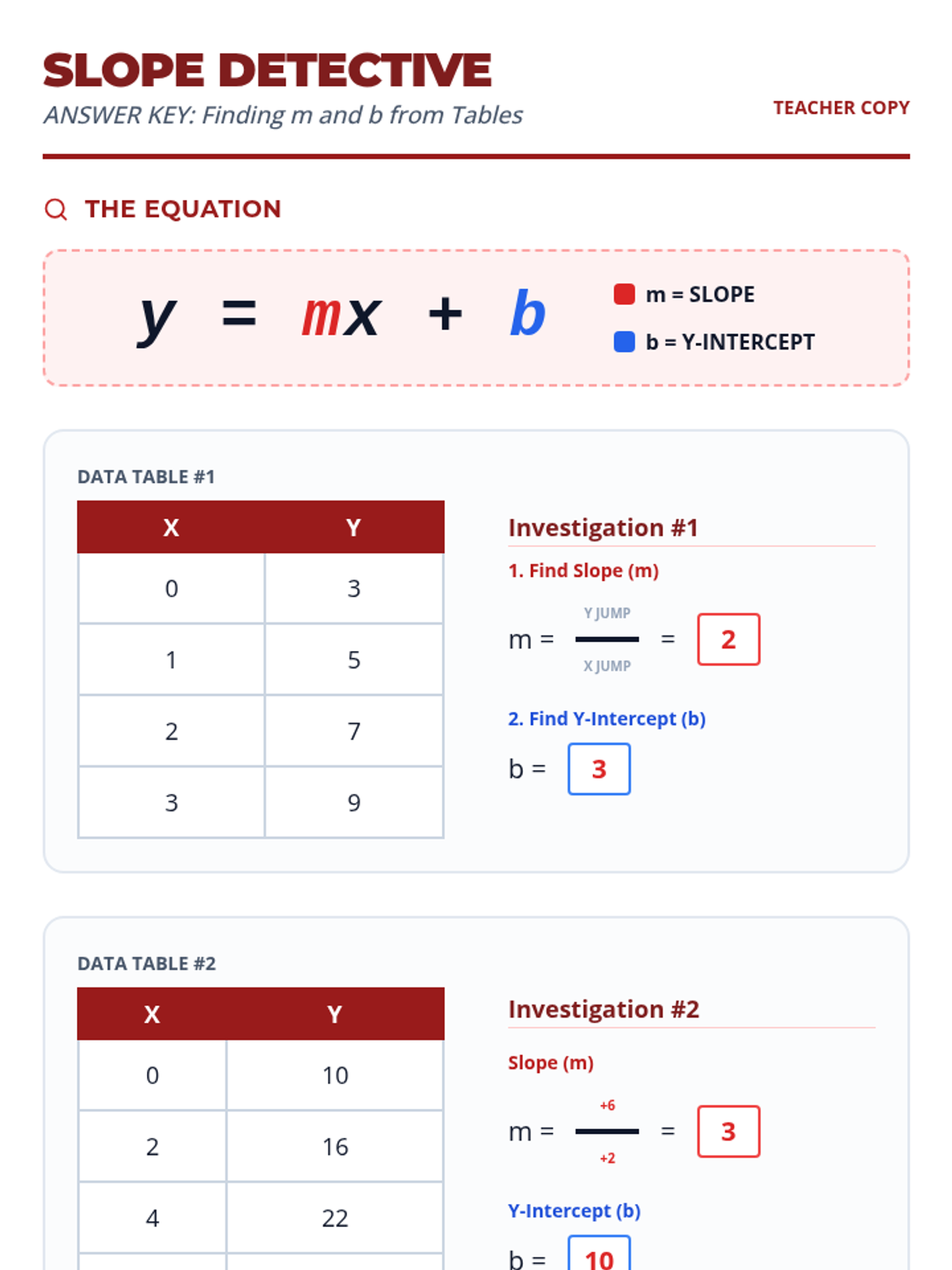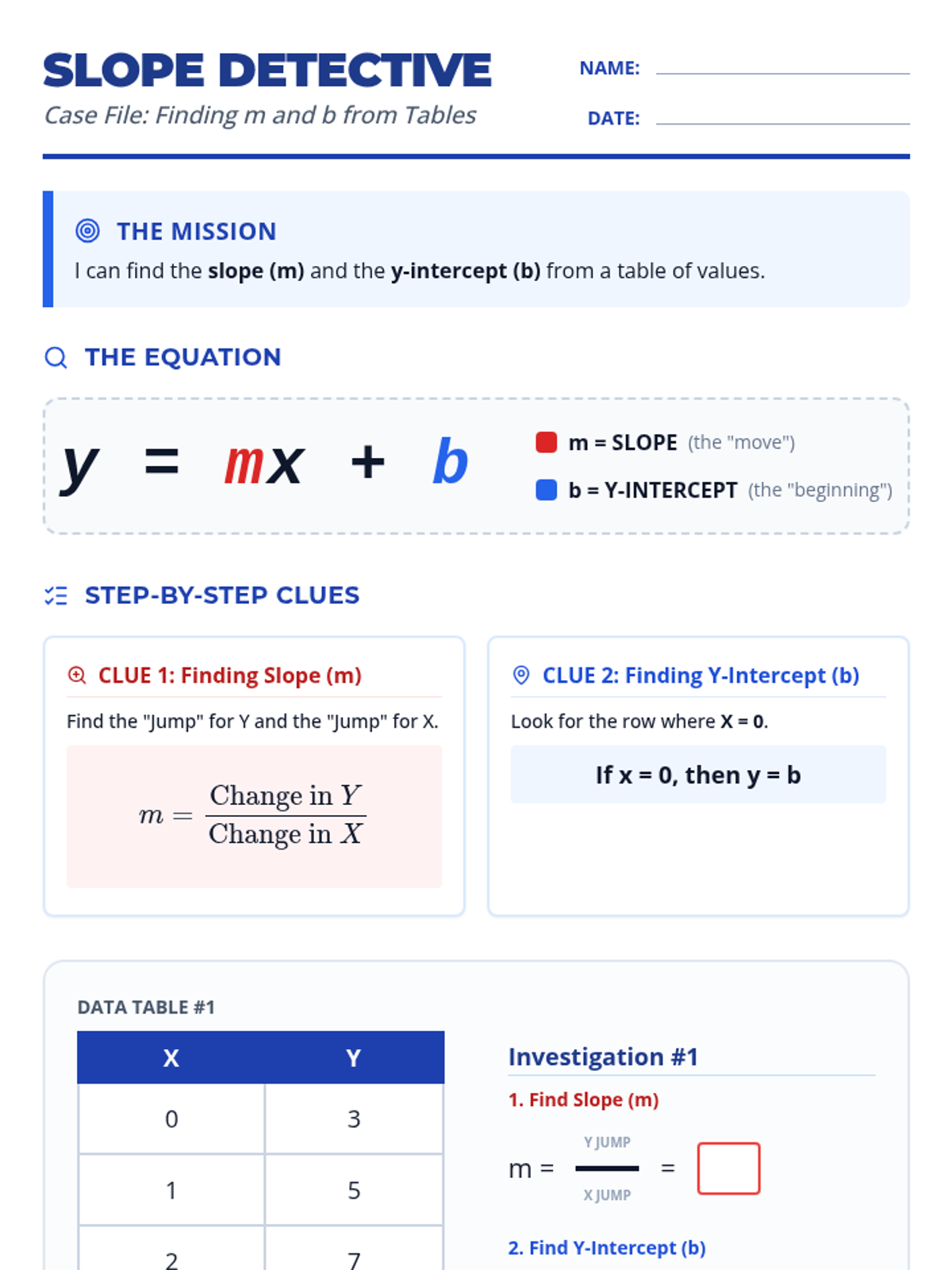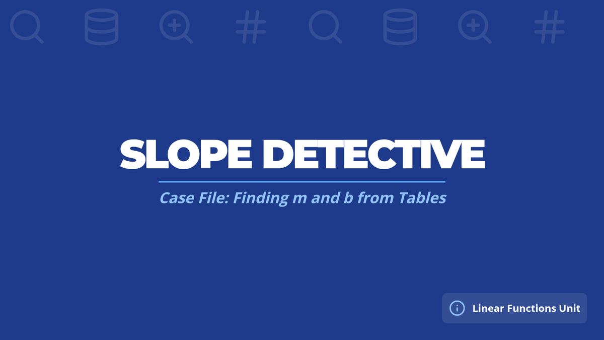 A scaffolded lesson on finding slope and y-intercept from tables using a detective-themed discovery approach, perfect for students requiring structured support and visual aids.