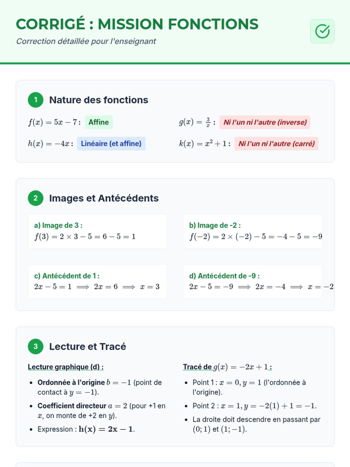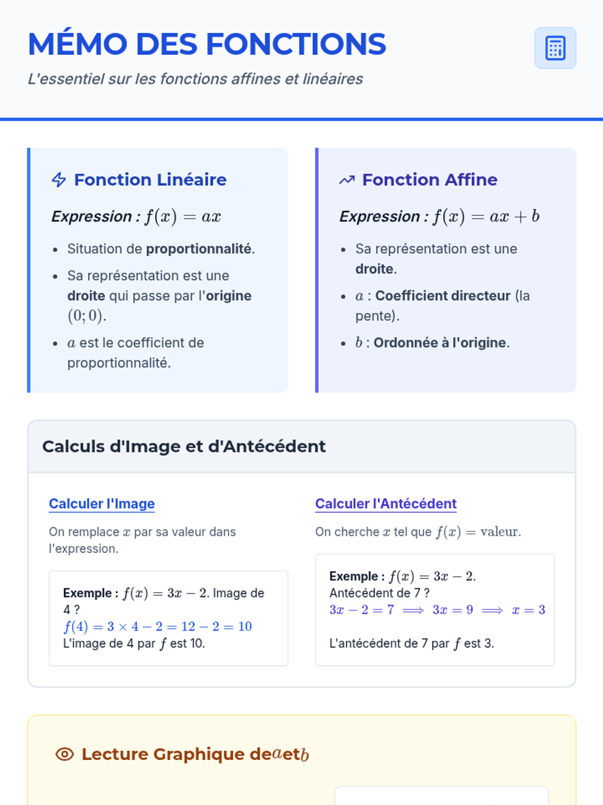 Une leçon complète sur les bases des fonctions linéaires et affines, incluant des rappels de cours et des exercices pratiques de calcul et de lecture graphique.