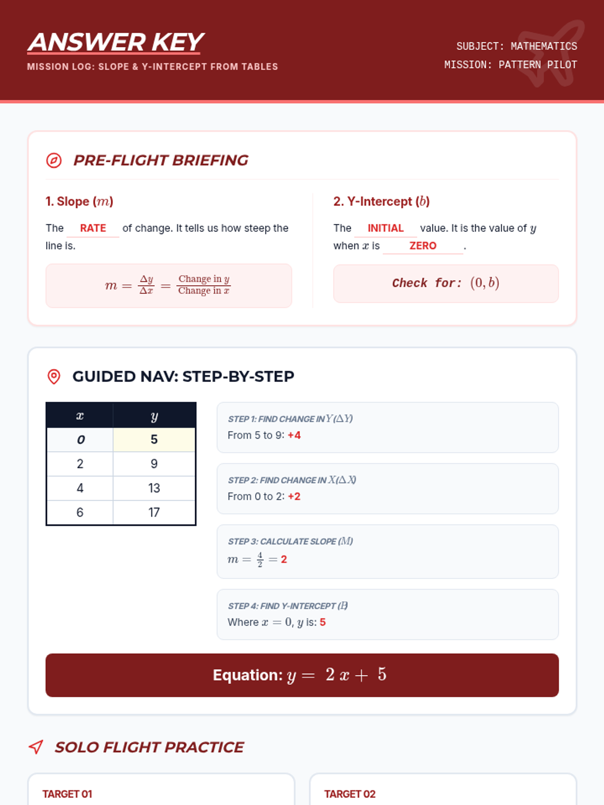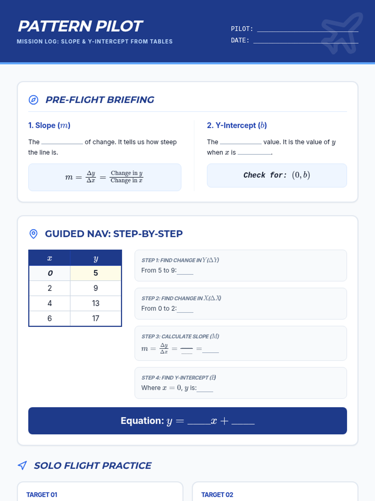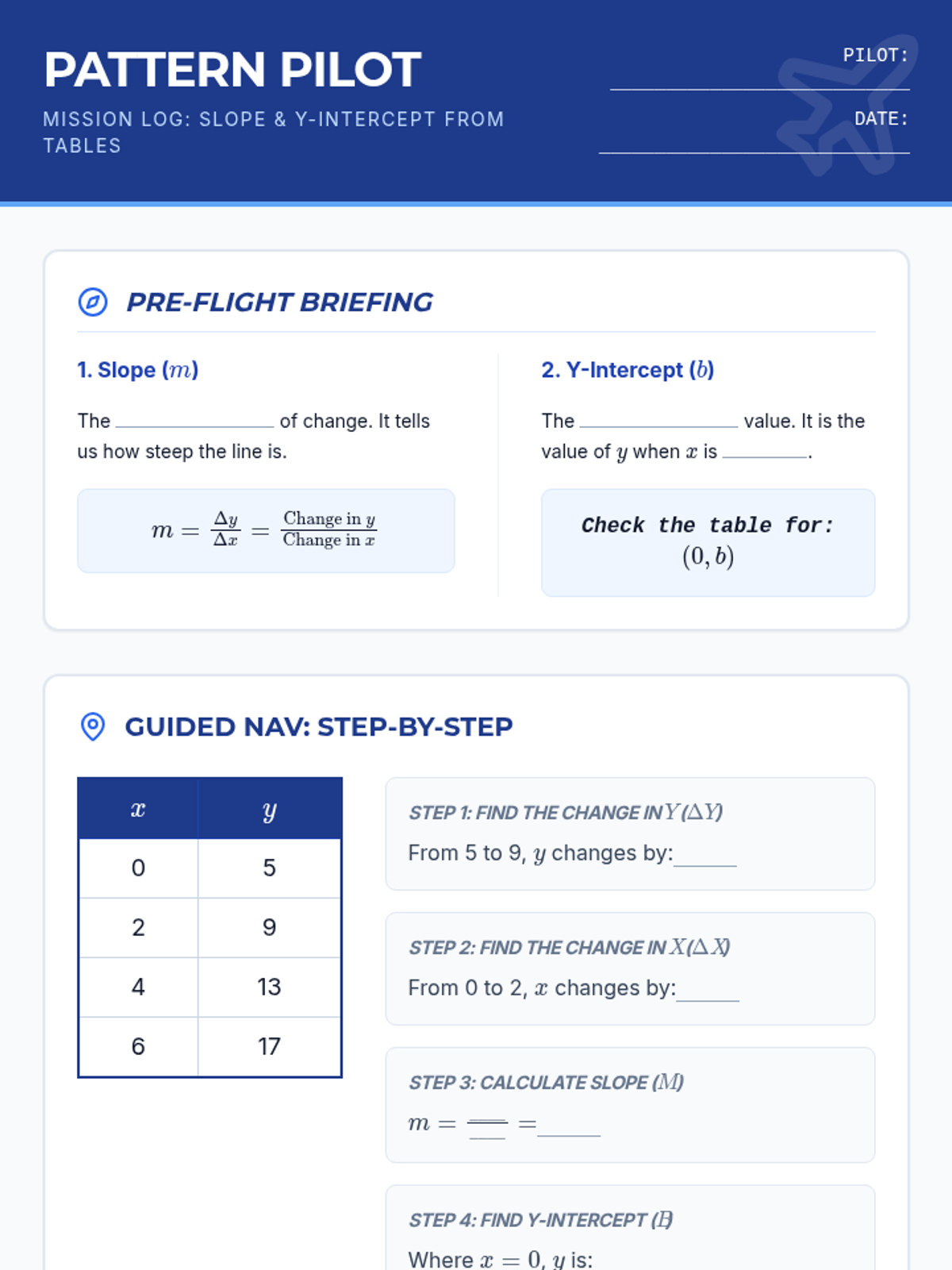 A focused 30-minute lesson on identifying the rate of change (slope) and initial value (y-intercept) from linear tables using the 'Pattern Pilot' navigation theme.