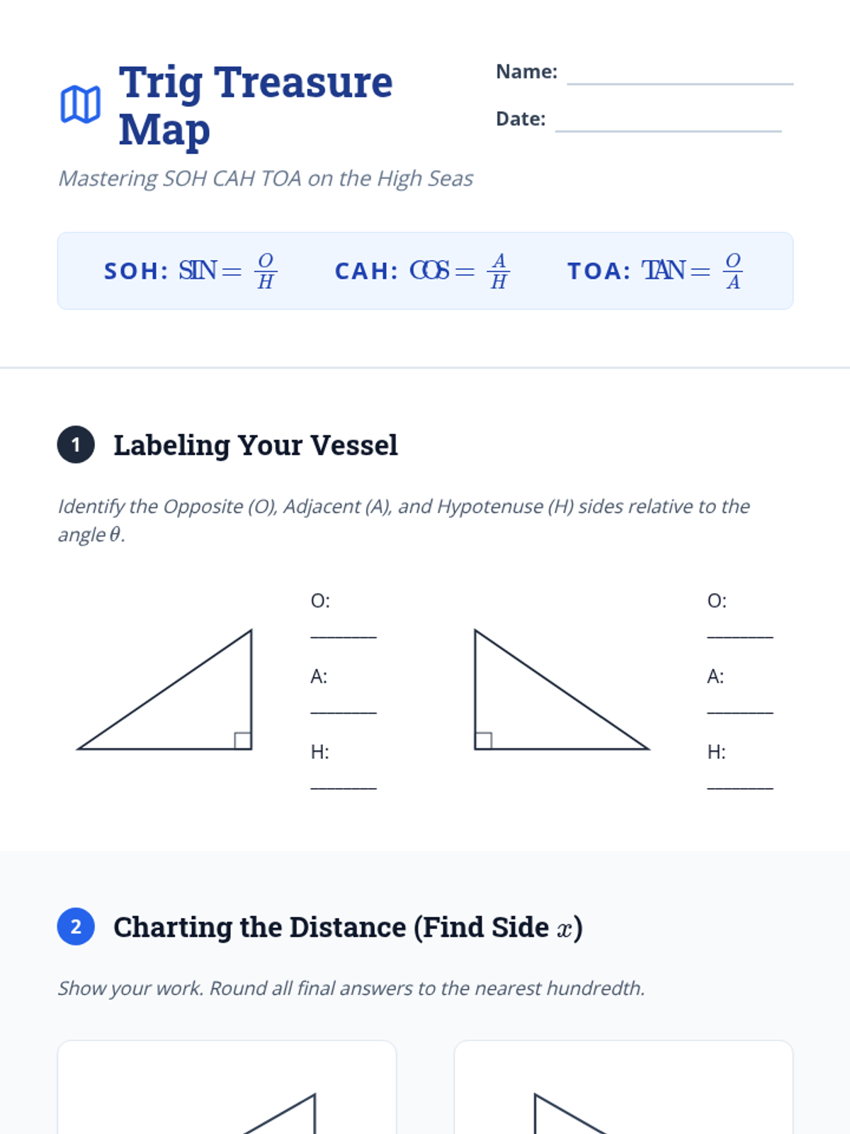 An introduction to right triangle trigonometry using Sine, Cosine, and Tangent (SOH CAH TOA) to solve for missing side lengths and angles in real-world nautical contexts.