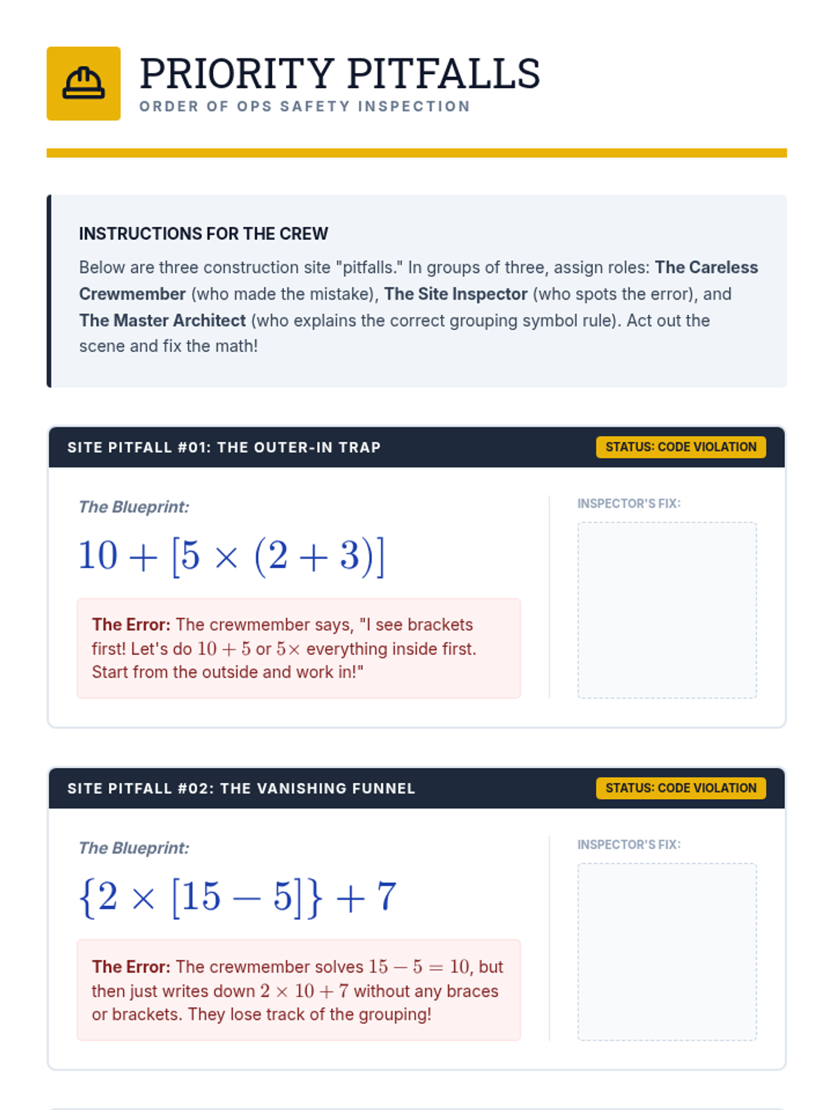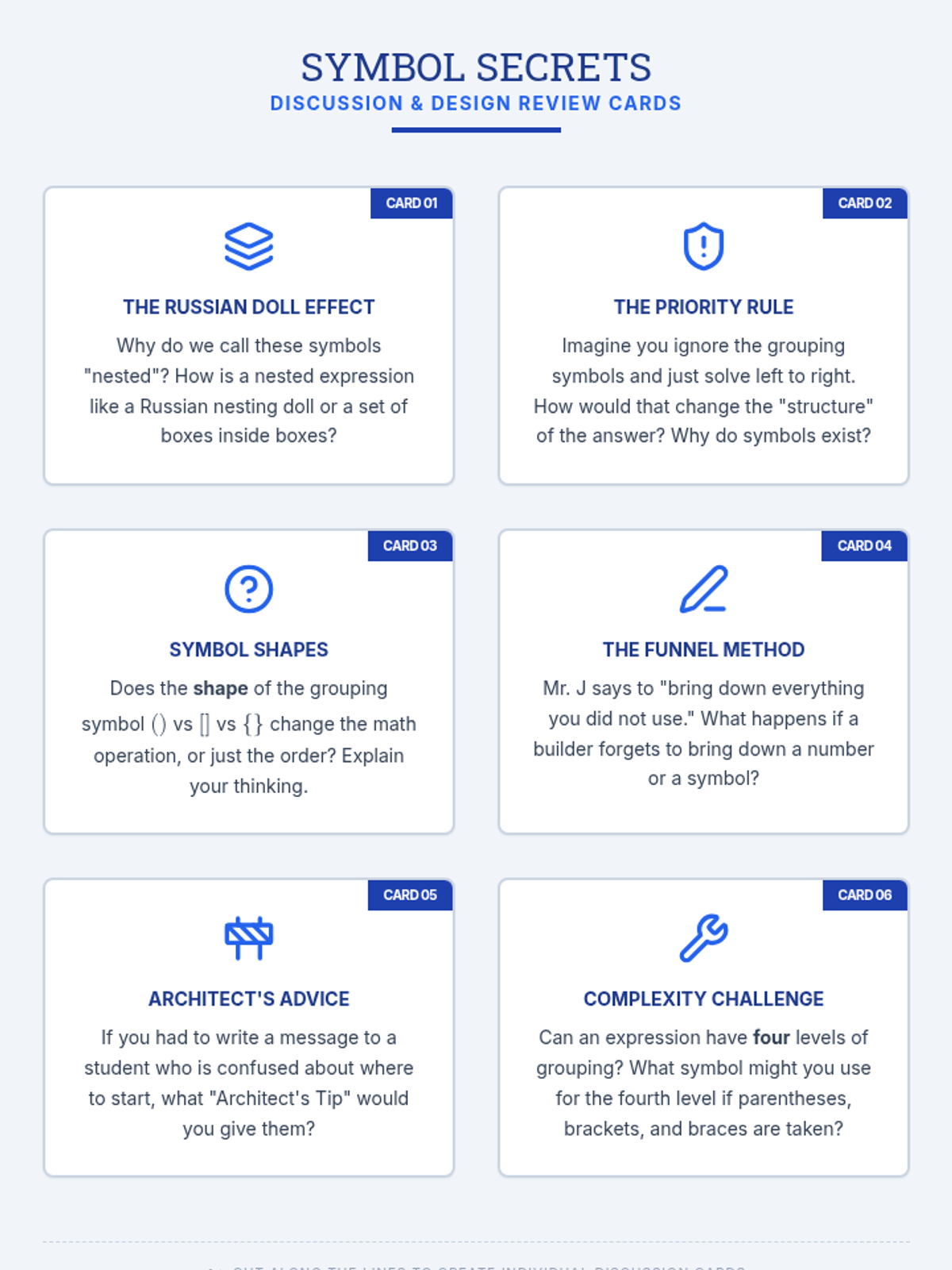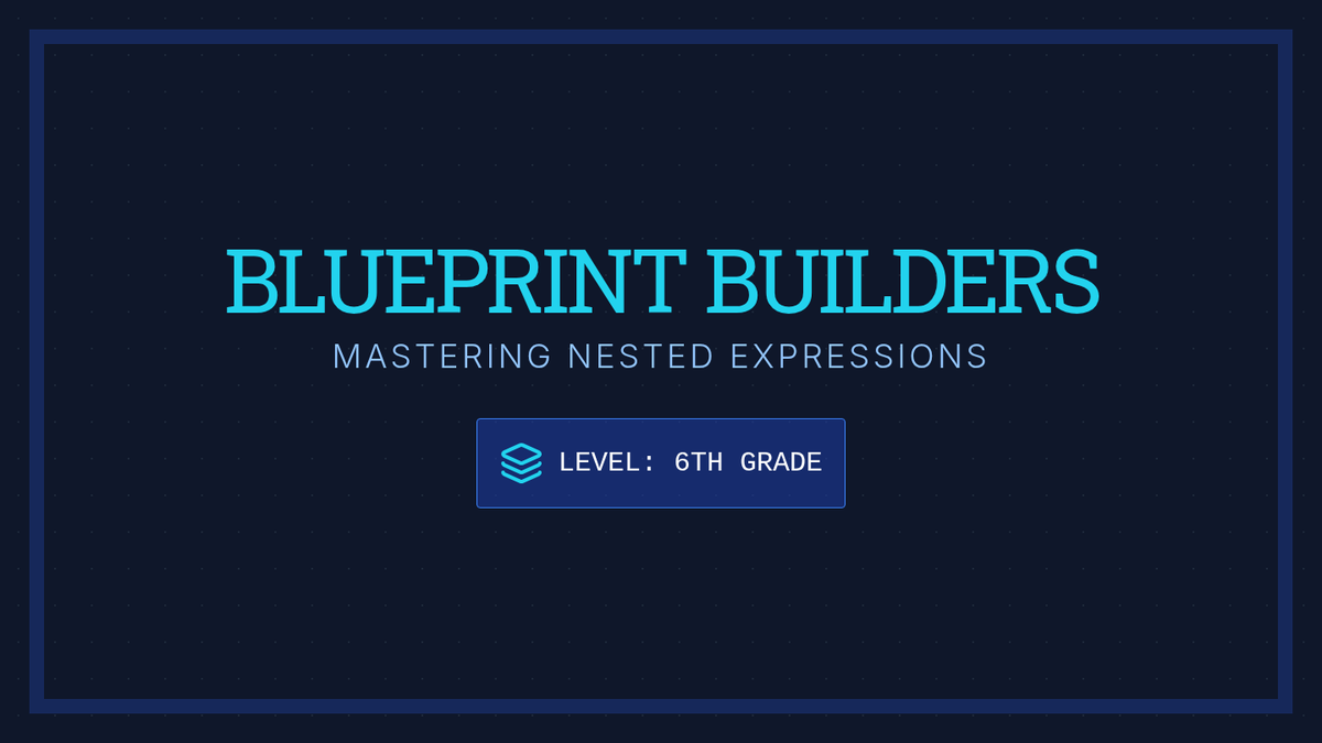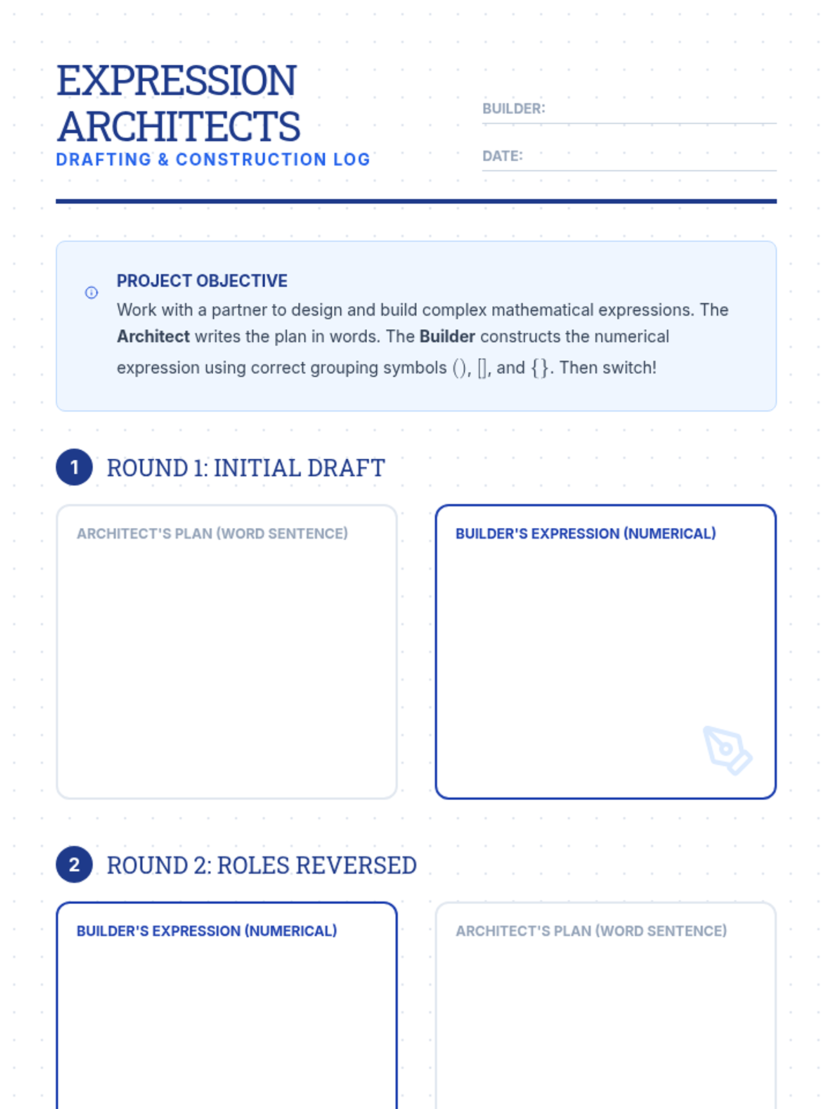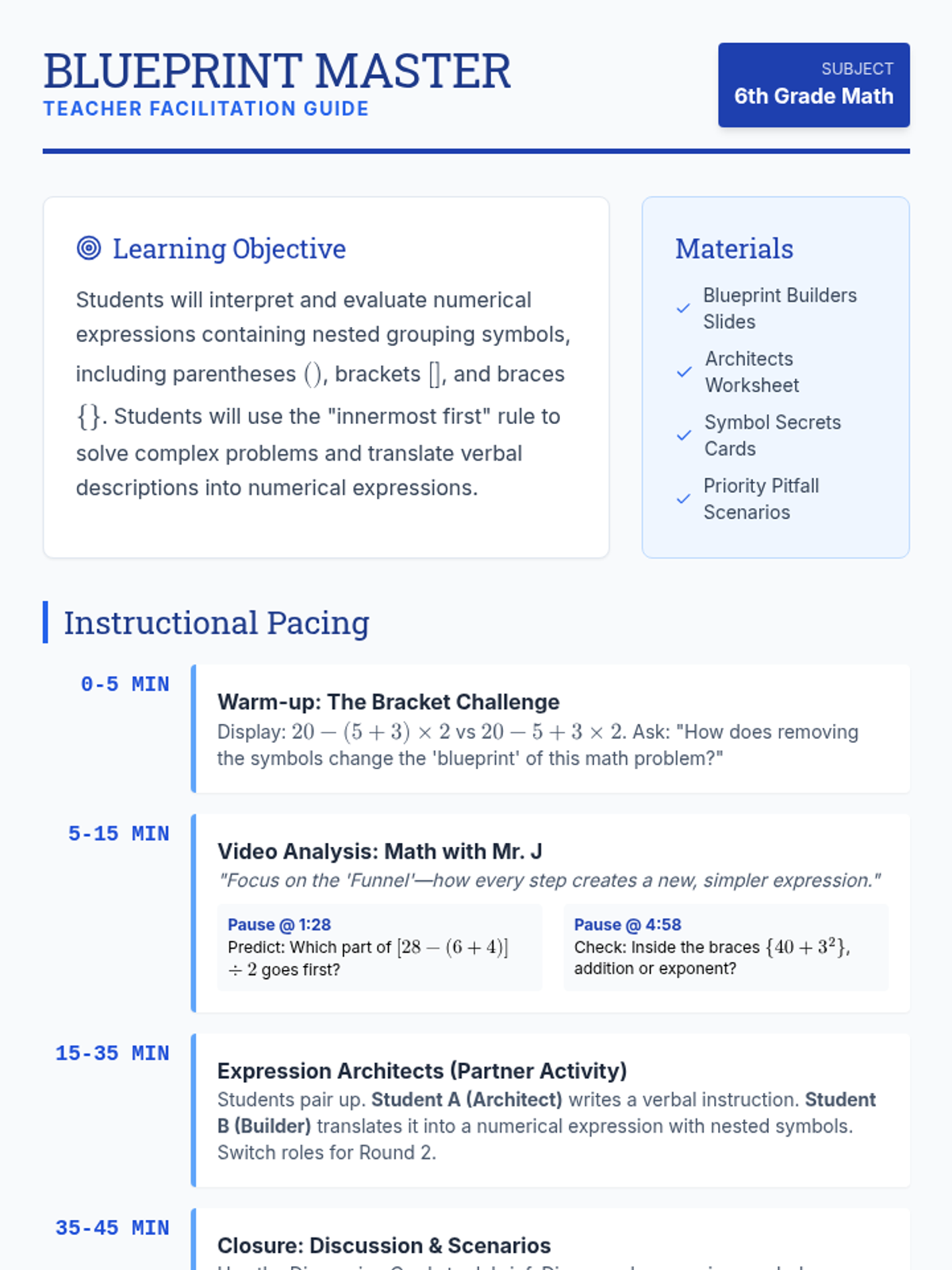 Students will learn to interpret and evaluate expressions with nested grouping symbols (parentheses, brackets, and braces) through a blueprint-themed lesson featuring video analysis and a collaborative design activity.