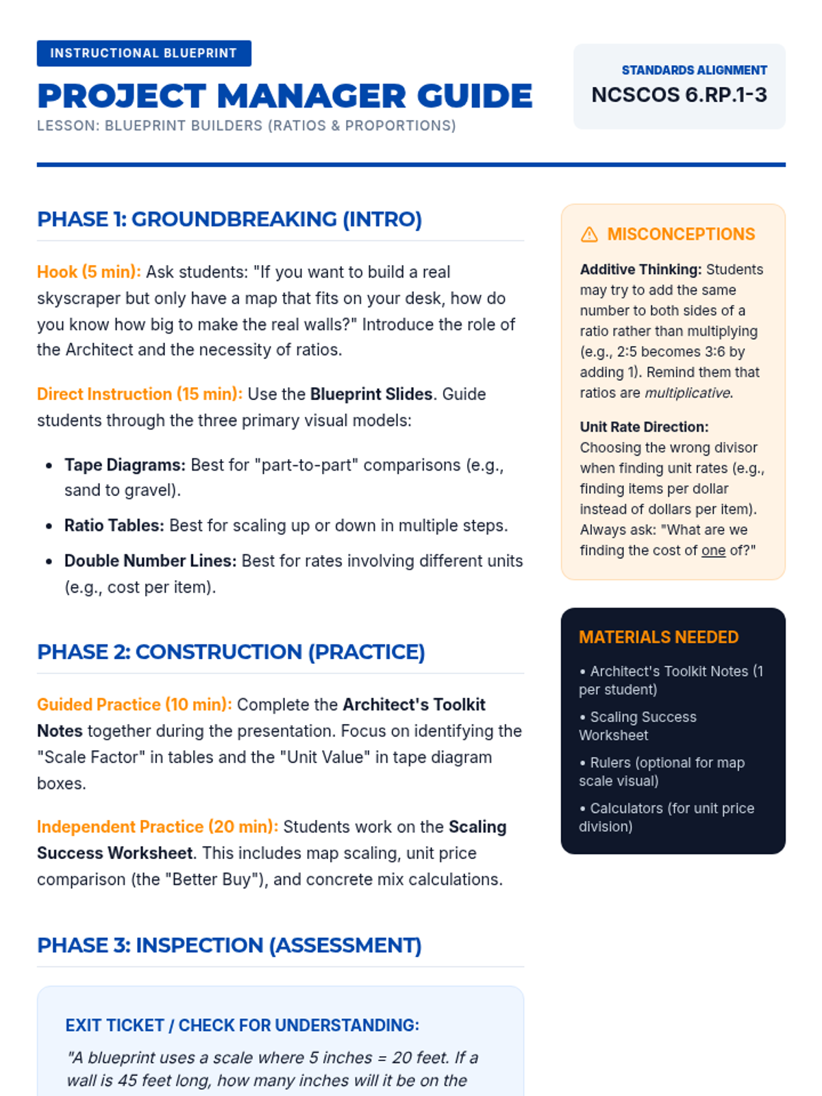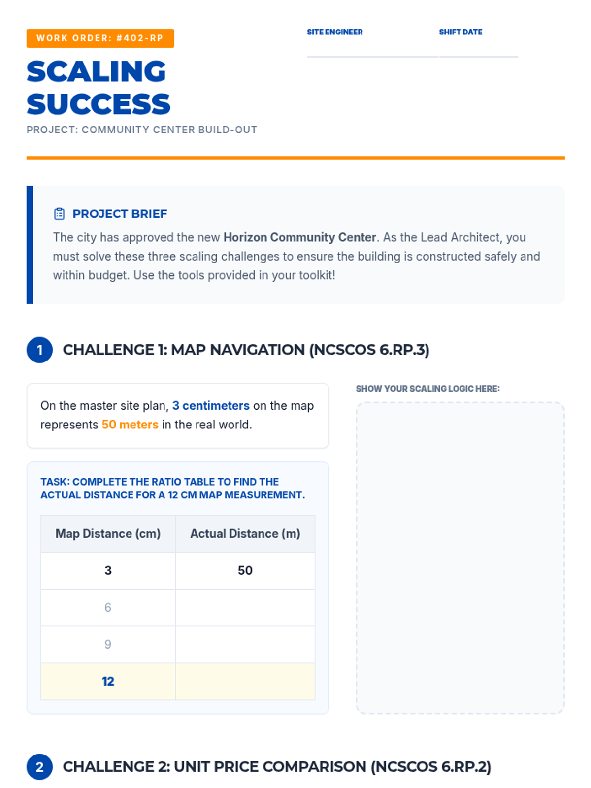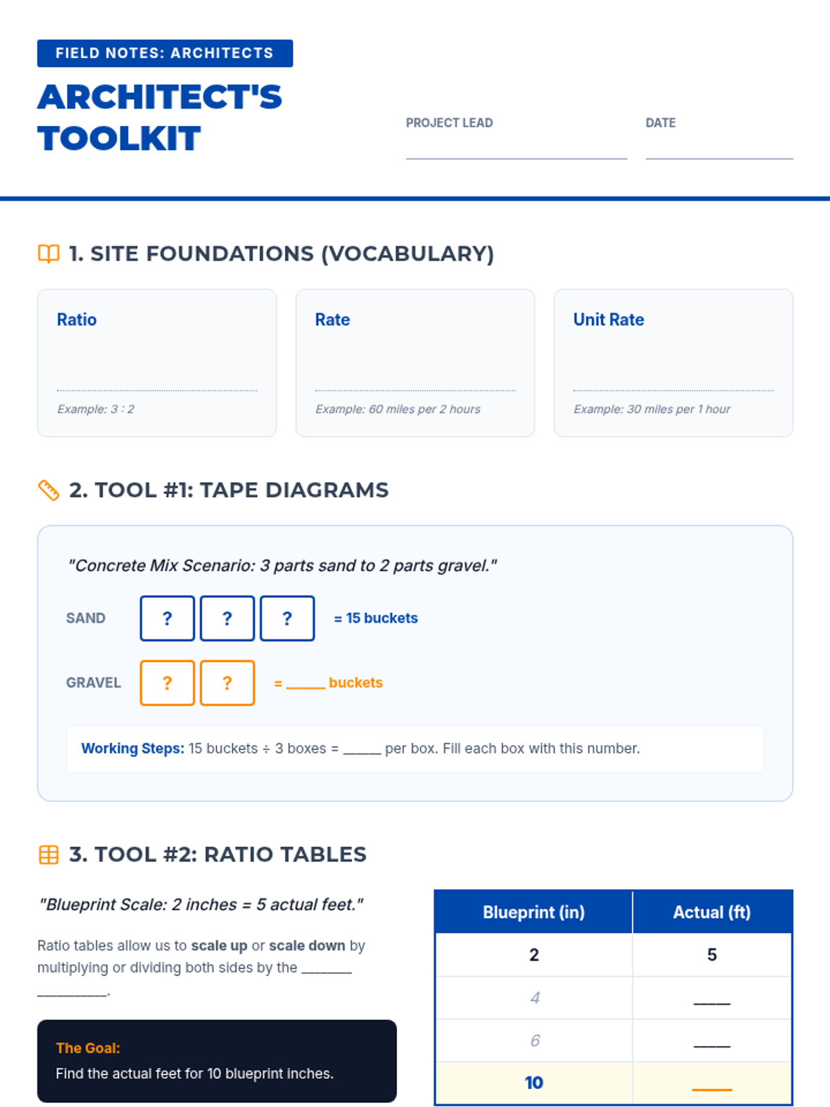 A hands-on exploration of ratios and proportional relationships where students act as architects to scale designs, compare unit prices for materials, and navigate maps using ratio tables and diagrams.