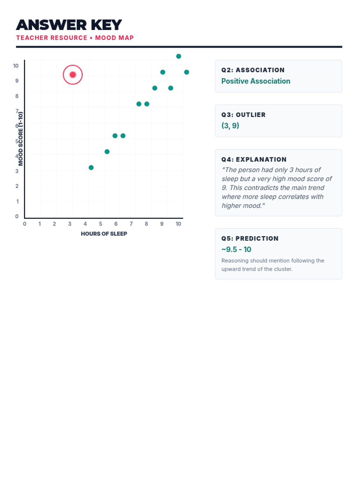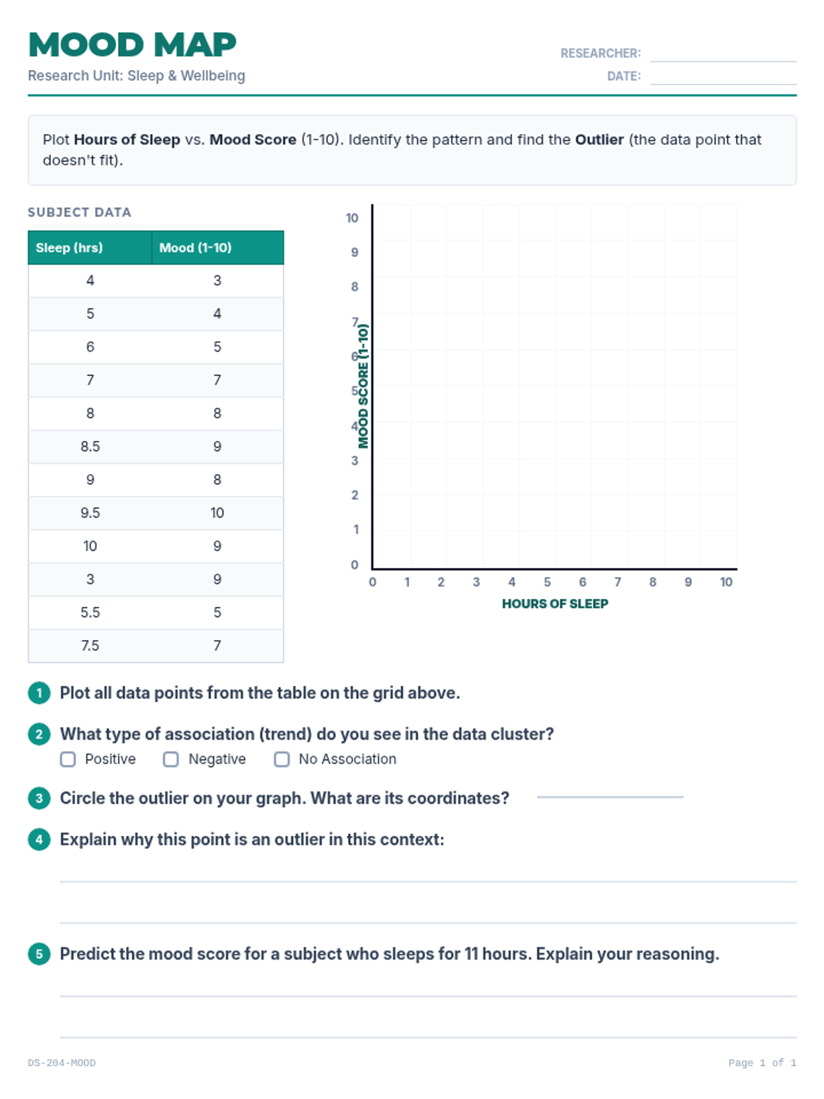 Students learn to plot bivariate data, identify trends, and spot outliers using a real-world scenario of sleep and mood.