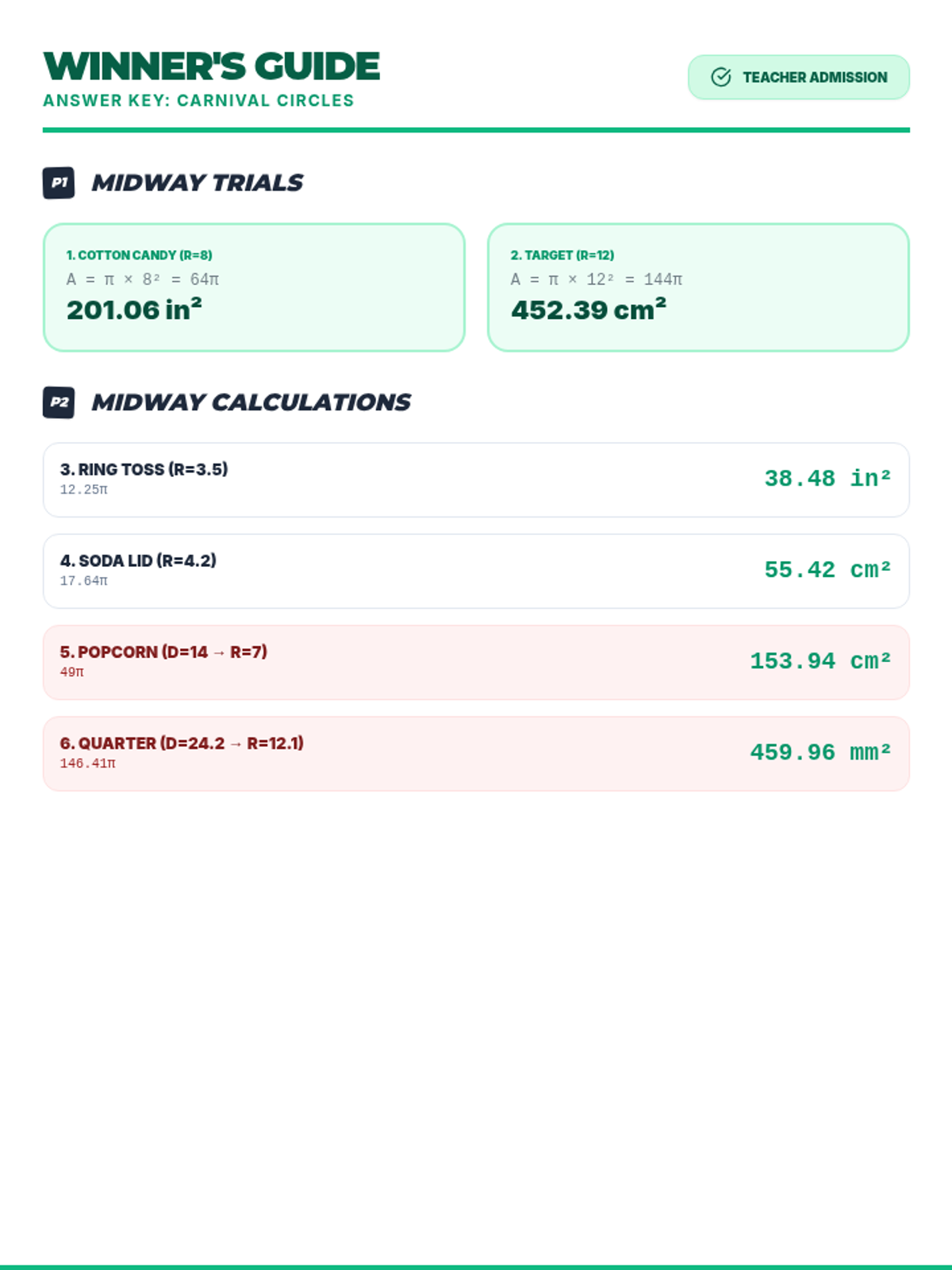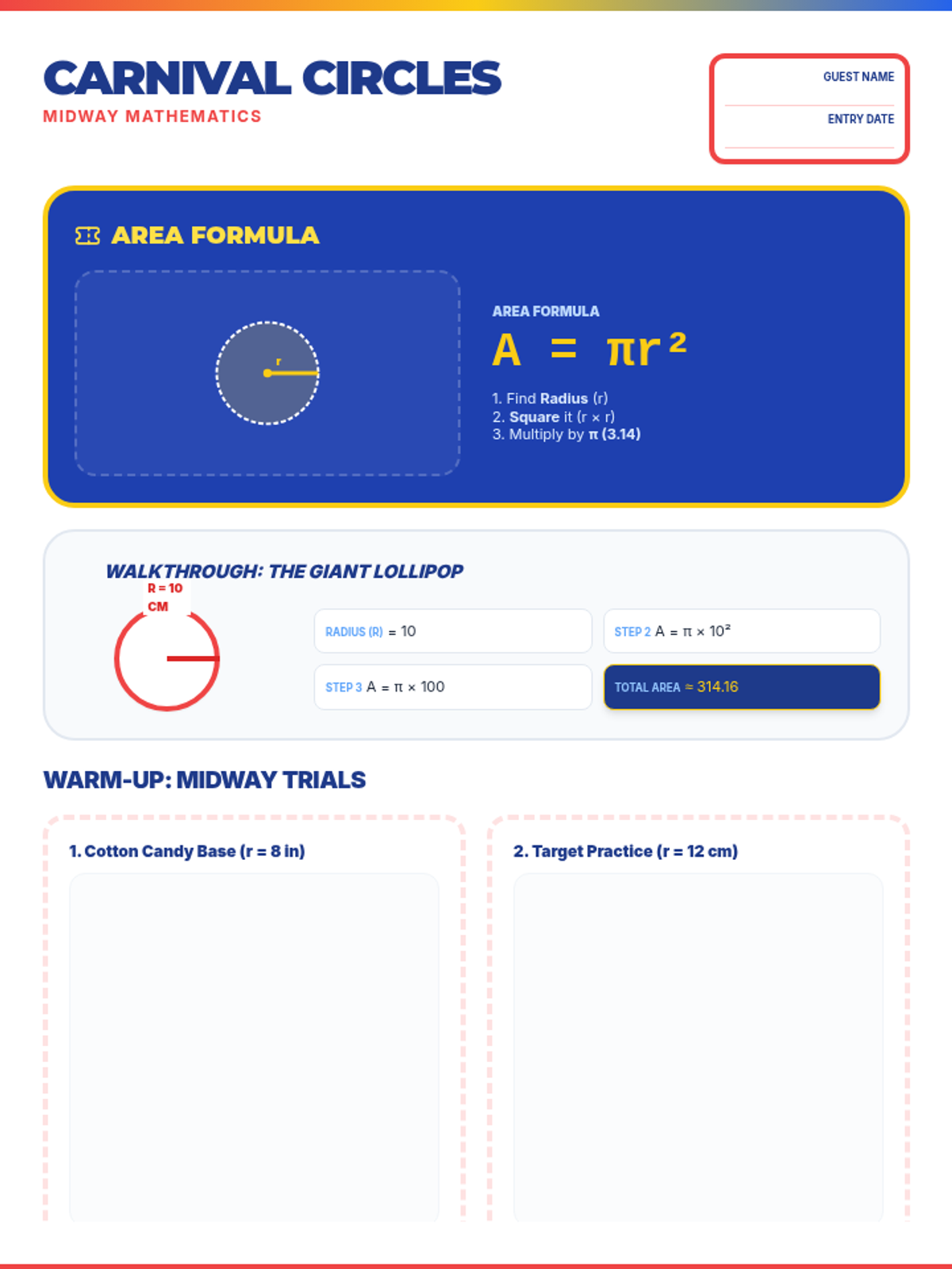 A high-energy, amusement park-themed packet for calculating the area of a circle. Students explore the Midway and Thrill Rides while solving radius and diameter problems using visual aids and calculators.