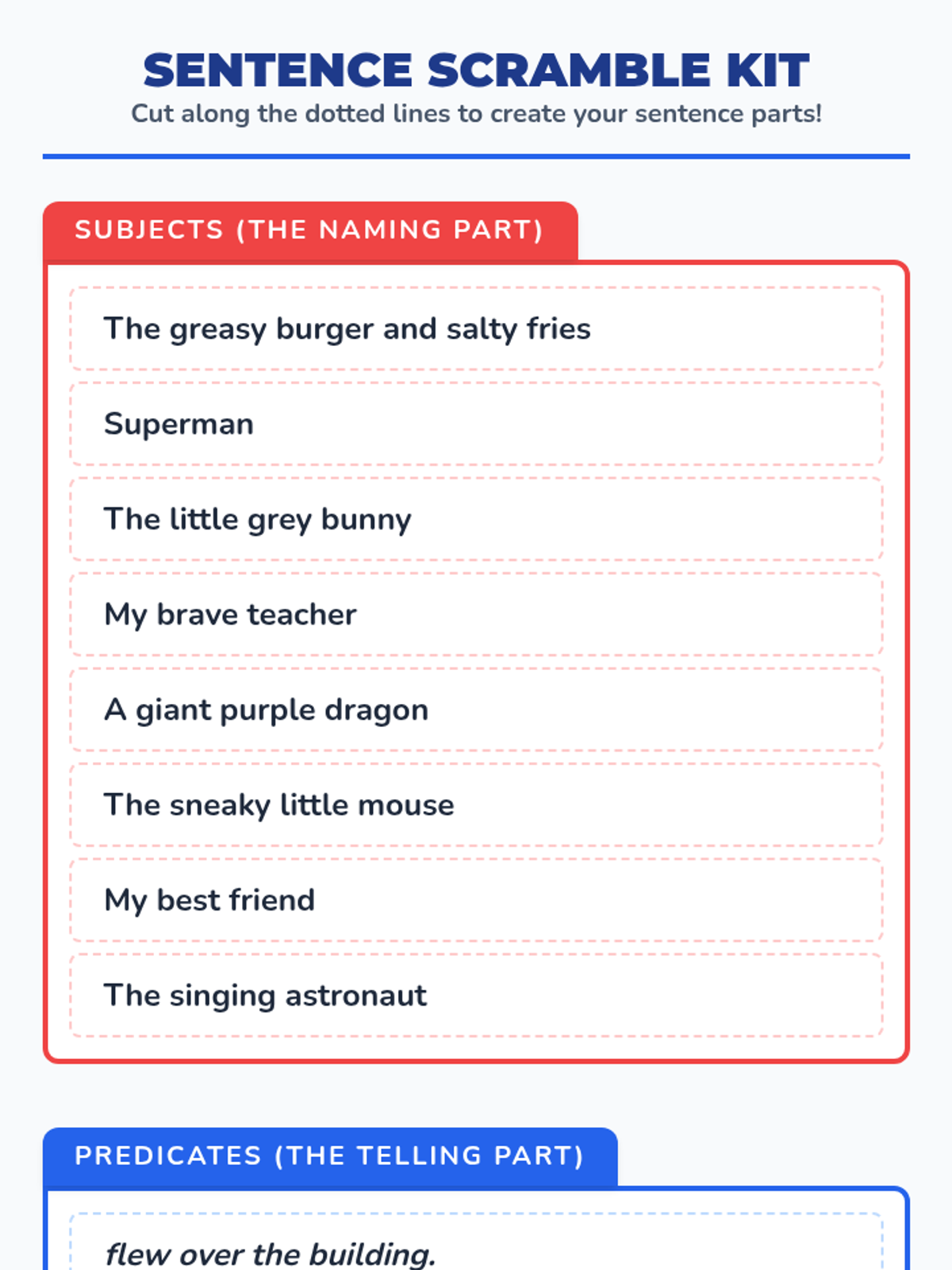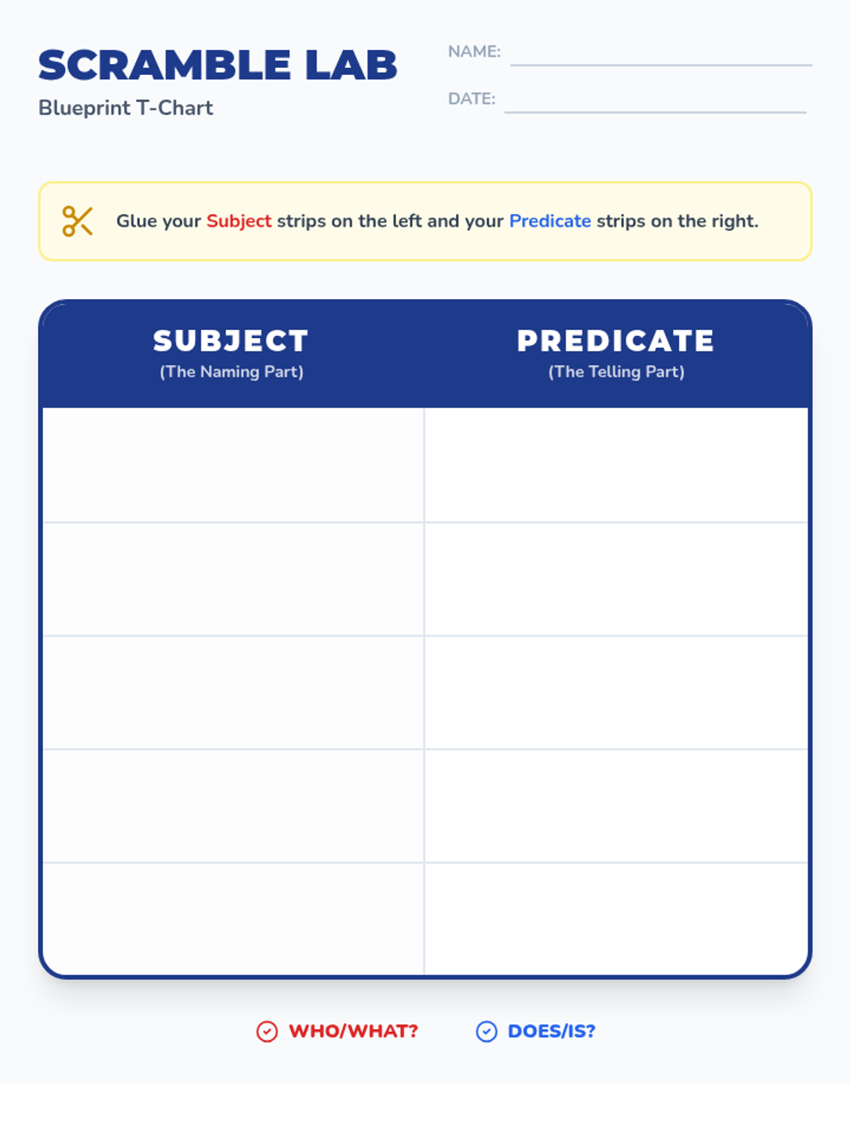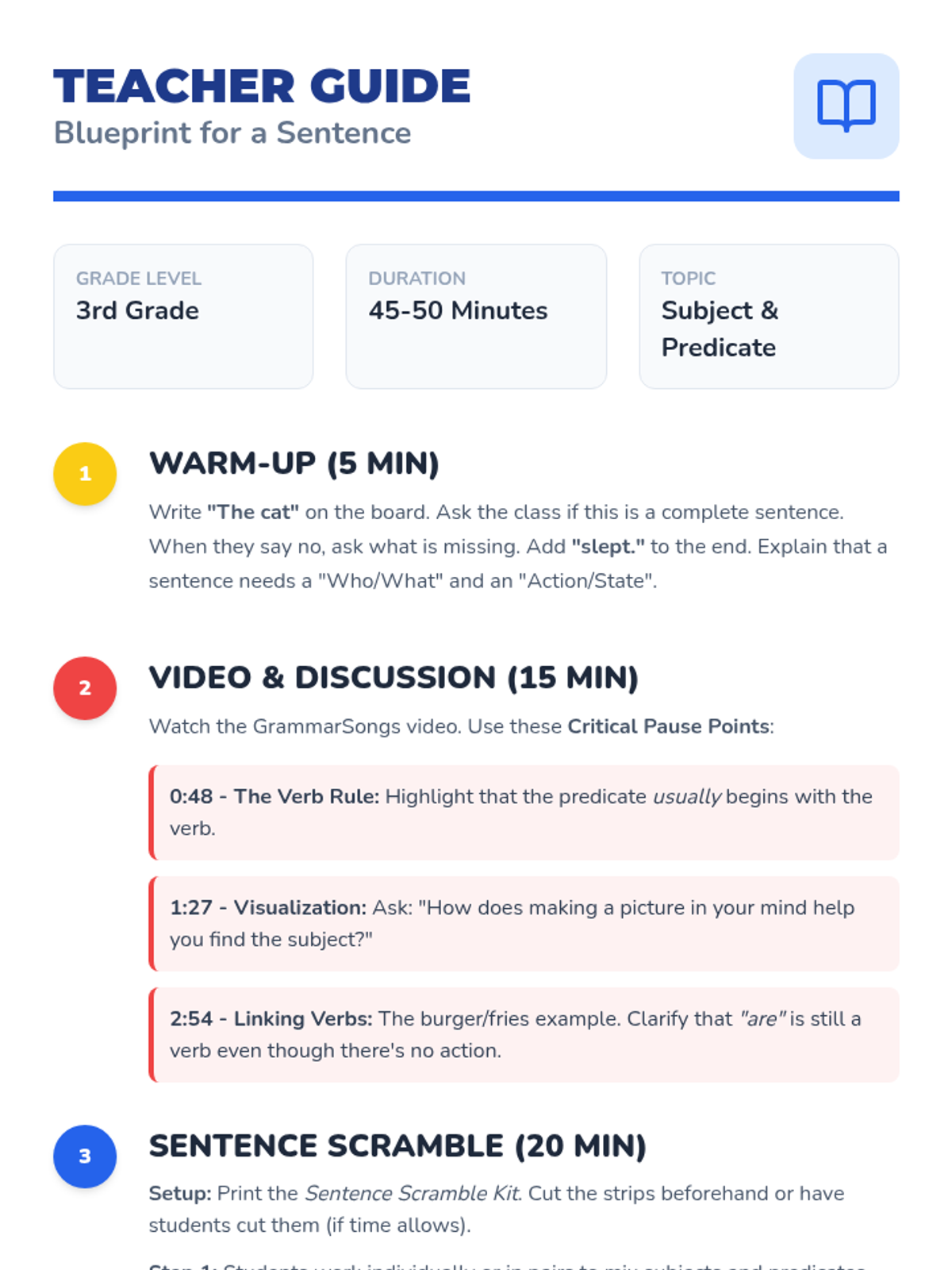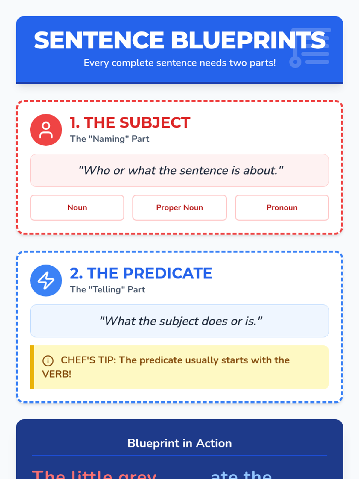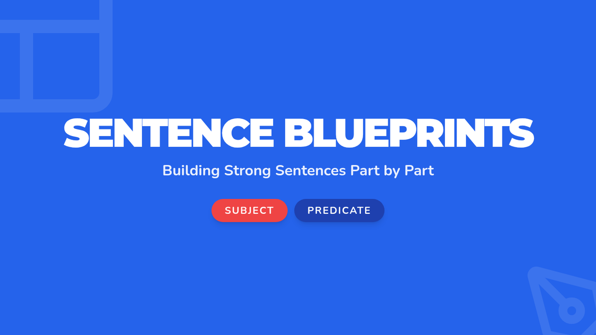 A lesson introducing 3rd-grade students to subjects and predicates using a "Blueprint" theme, featuring a video and a hands-on sentence-scrambling activity.