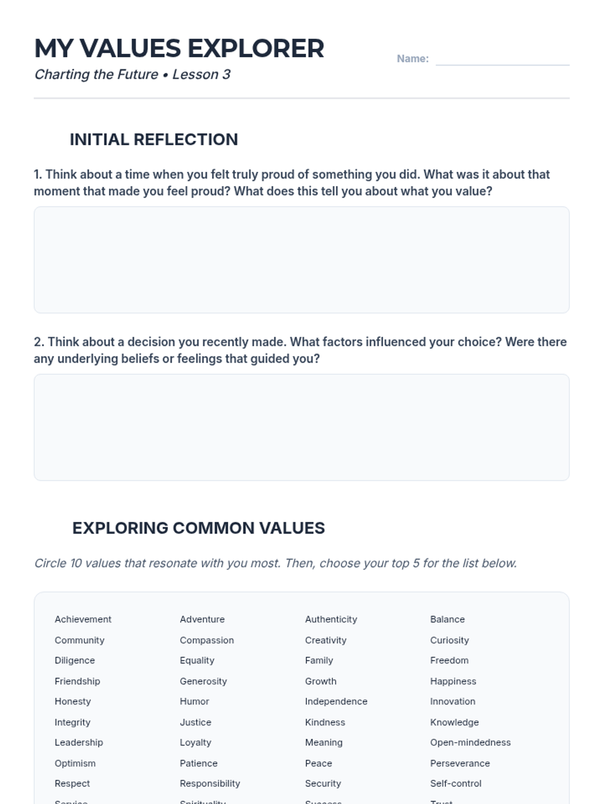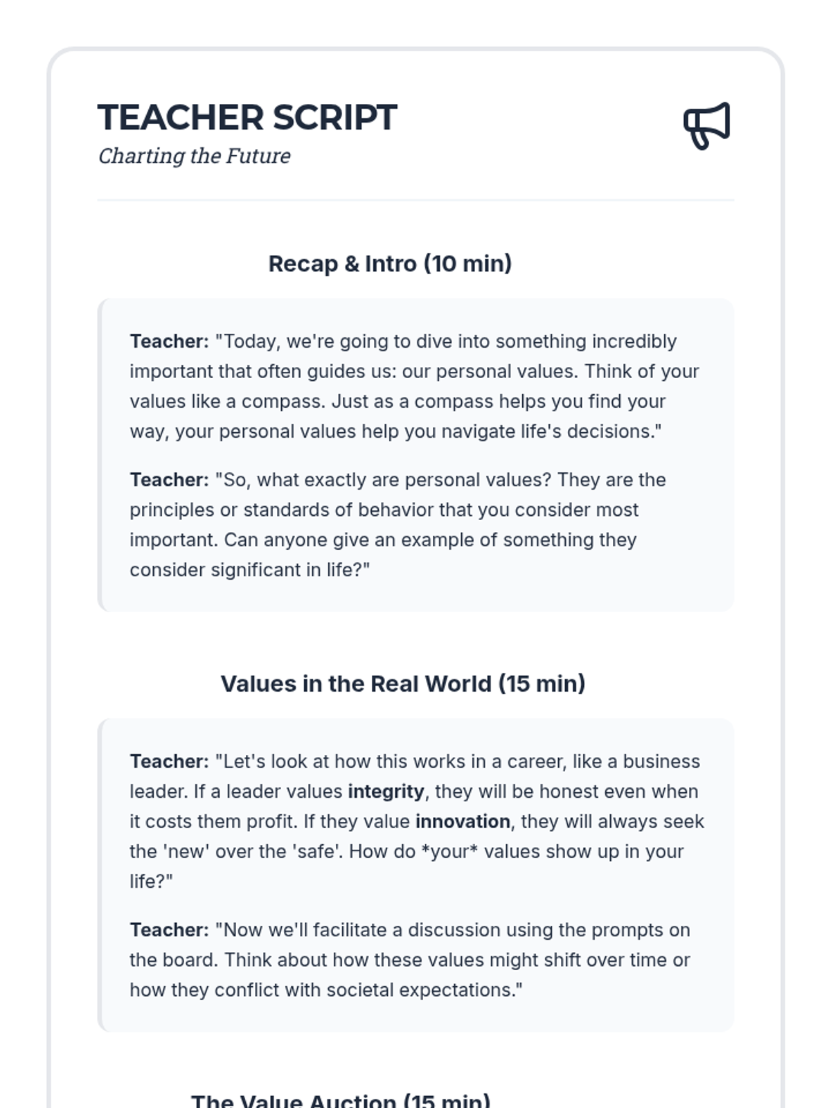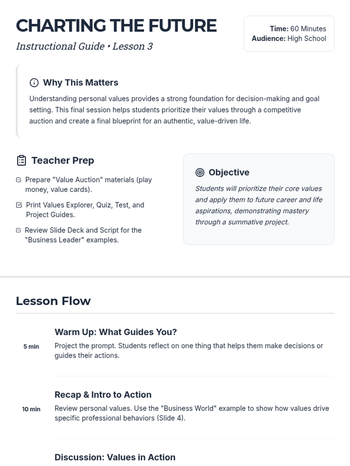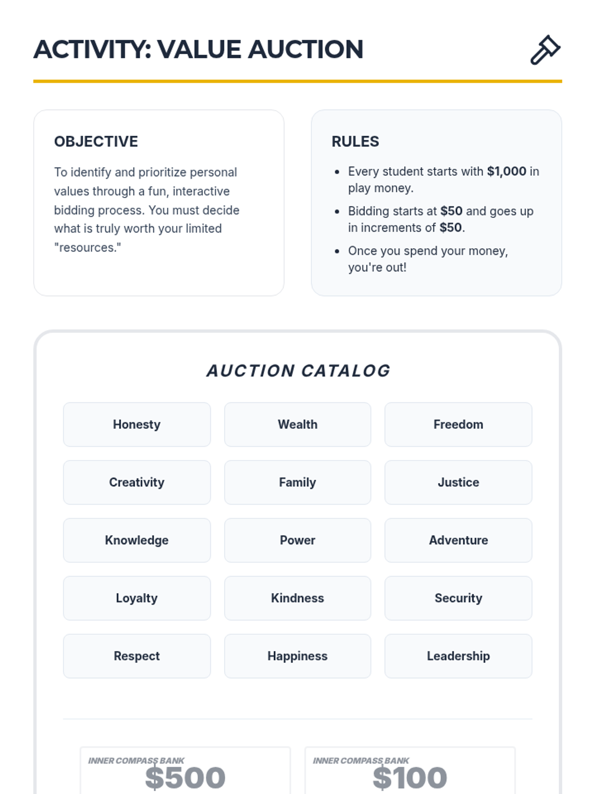 The final stage where students prioritize their values through a 'Value Auction' and create a personal blueprint for the future.