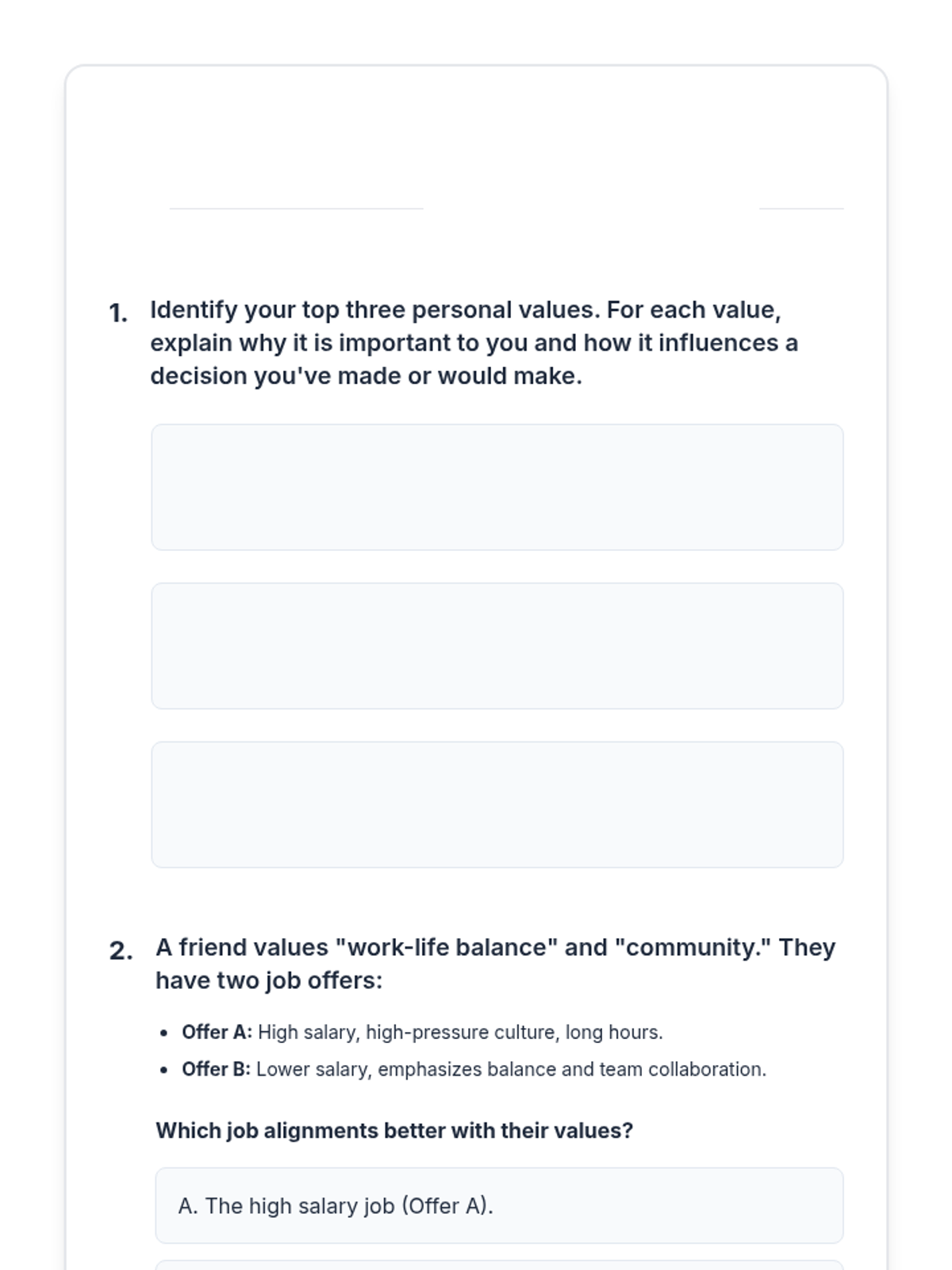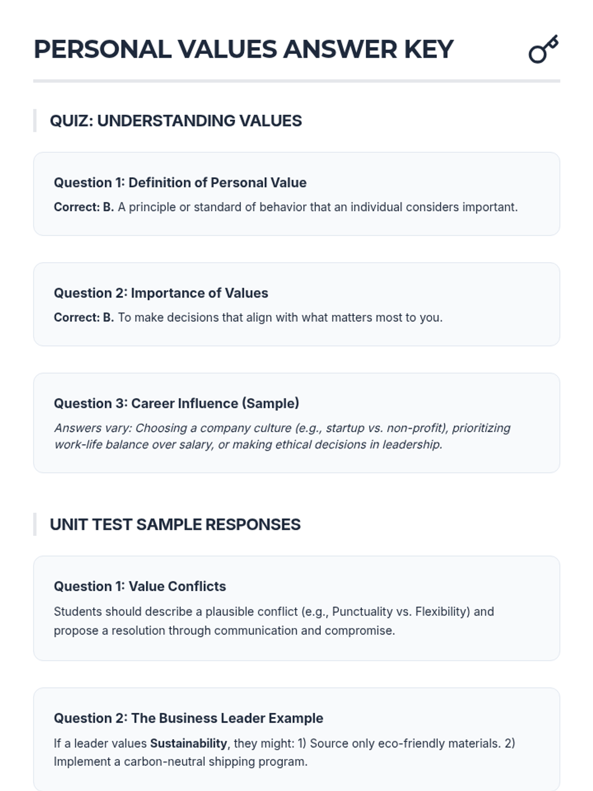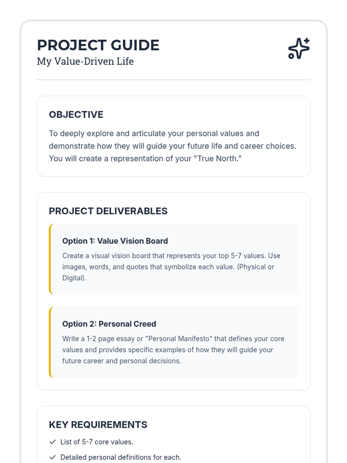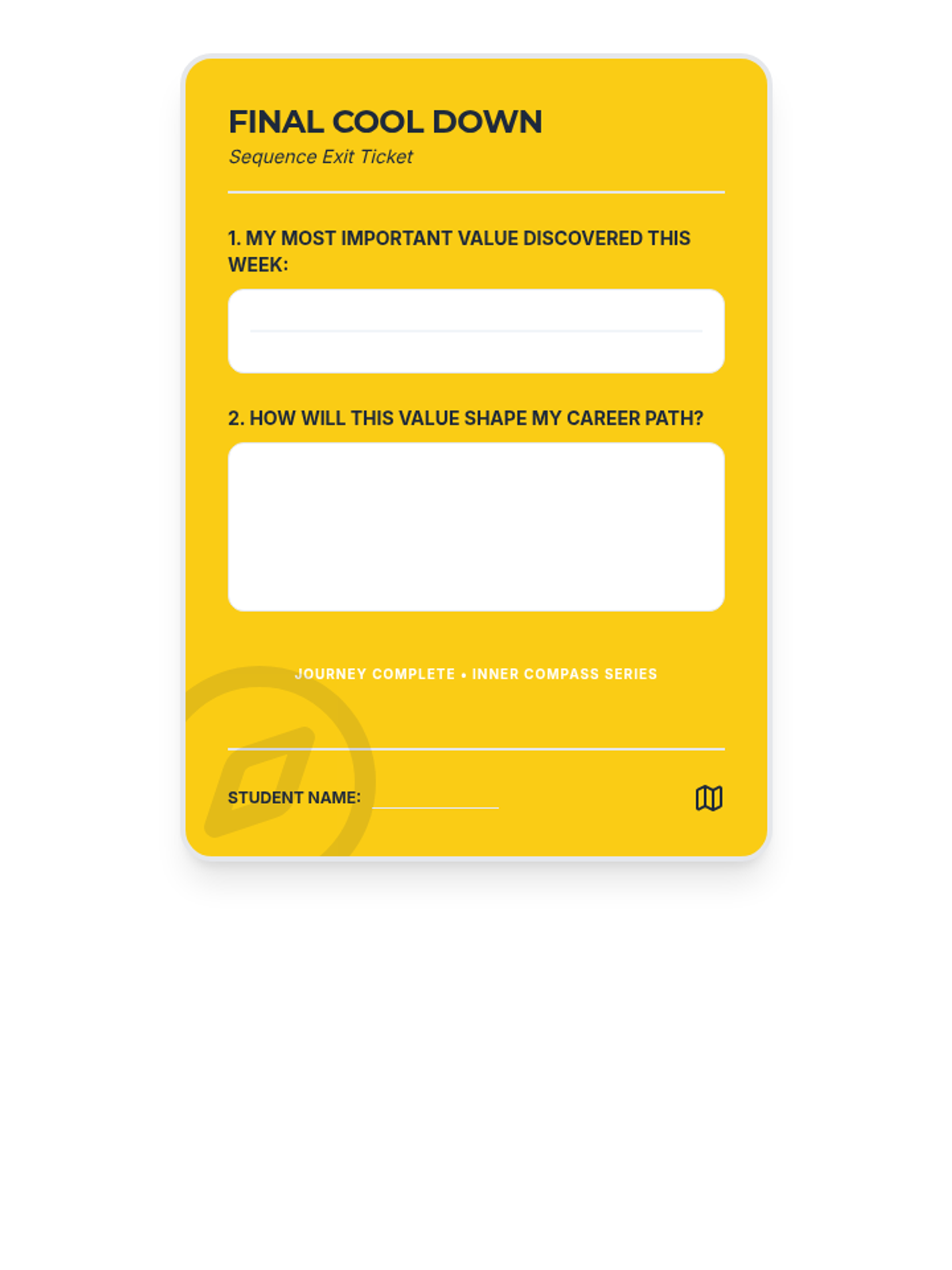 The final stage where students prioritize their values through a 'Value Auction' and create a personal blueprint for the future.