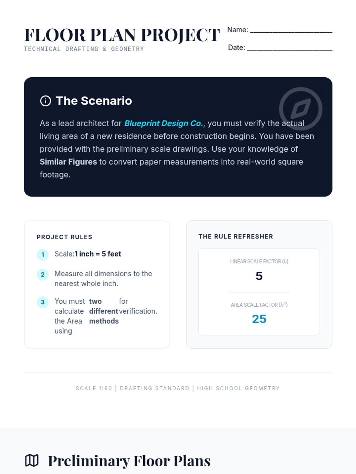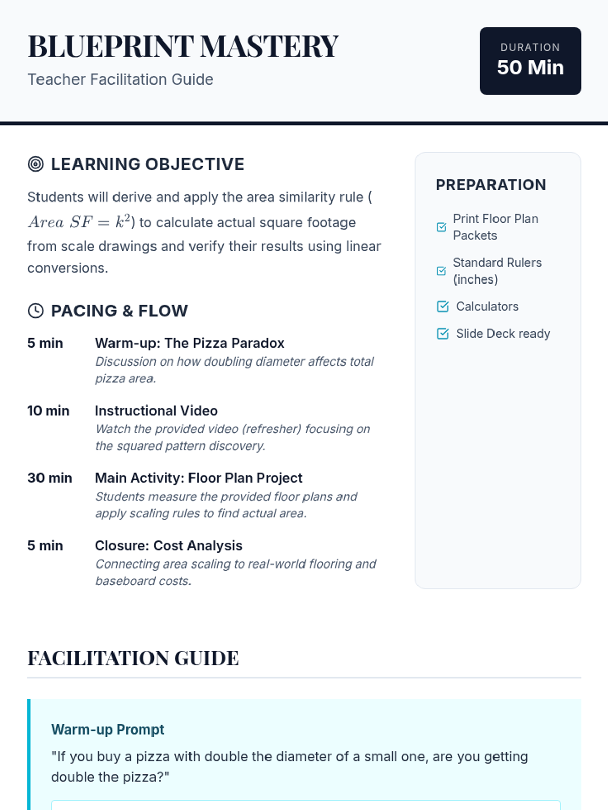 A High School Geometry lesson exploring the relationship between linear scale factors and area scale factors. Students apply the rule that the area of similar figures scales by the square of the side scale factor through a real-world architectural floor plan project.