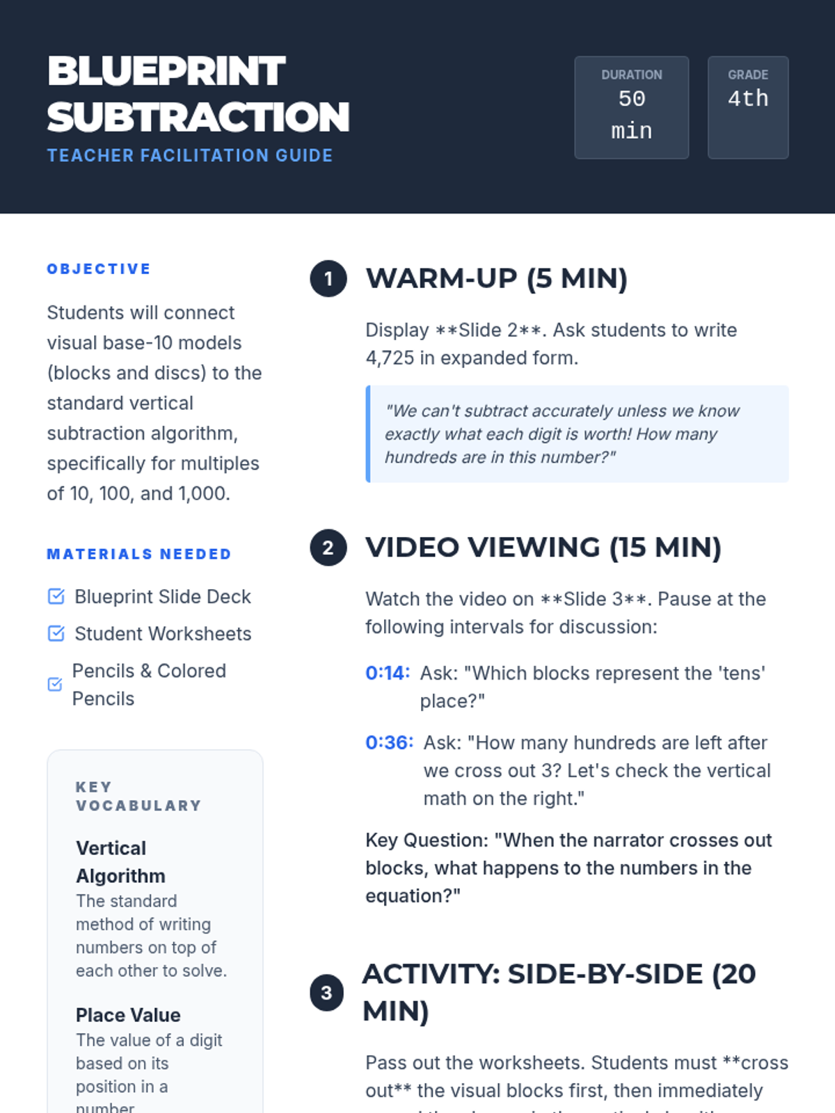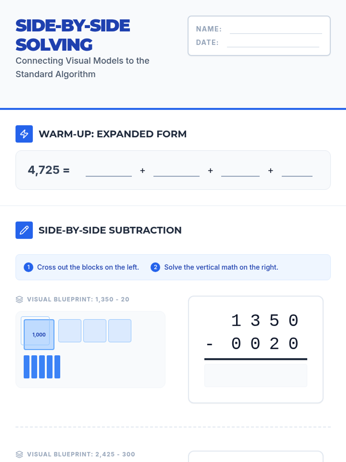 Students will learn to connect visual base-10 models with the standard vertical subtraction algorithm, focusing on subtracting multiples of 10, 100, and 1,000.