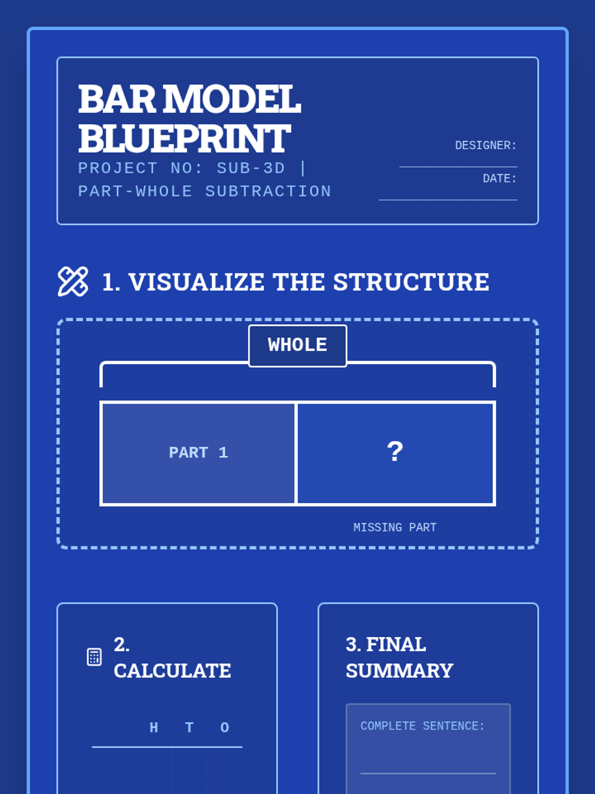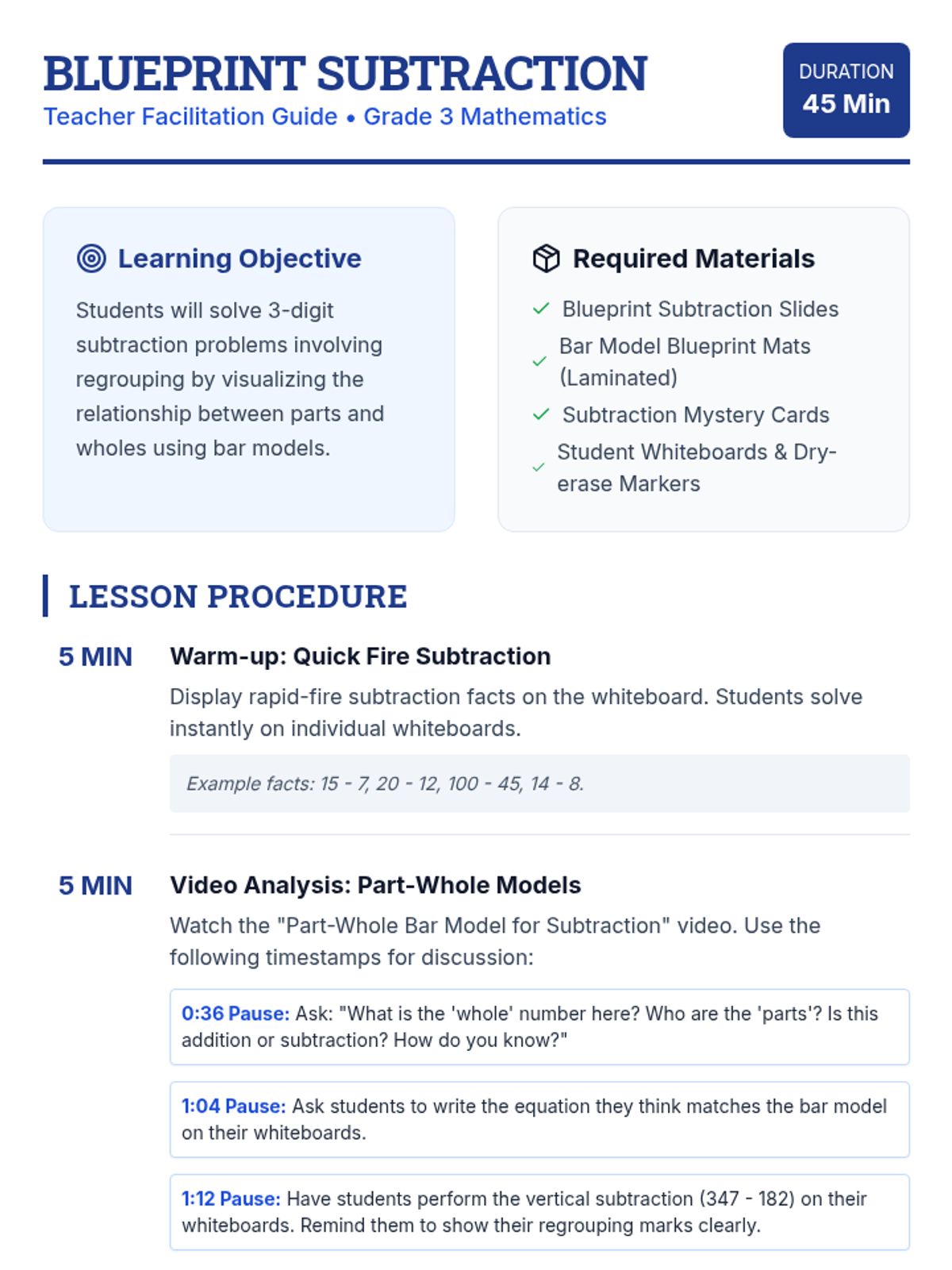 A 3rd-grade math lesson focused on solving 3-digit subtraction problems using the part-whole bar model strategy, including a video analysis and hands-on collaborative practice.