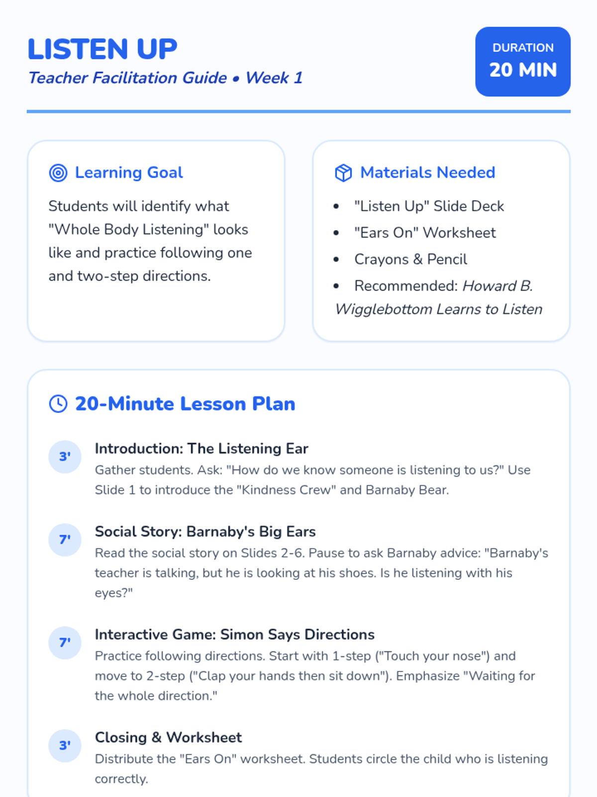 Students learn the importance of active listening and following one-step and two-step directions through the story of Barnaby Bear.