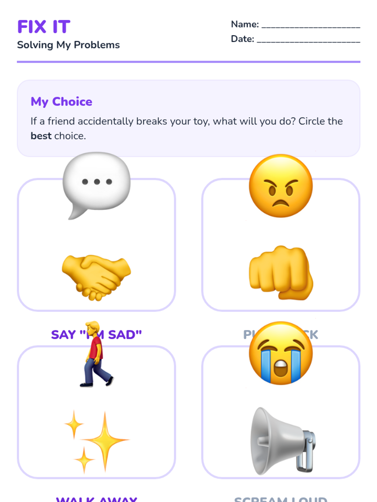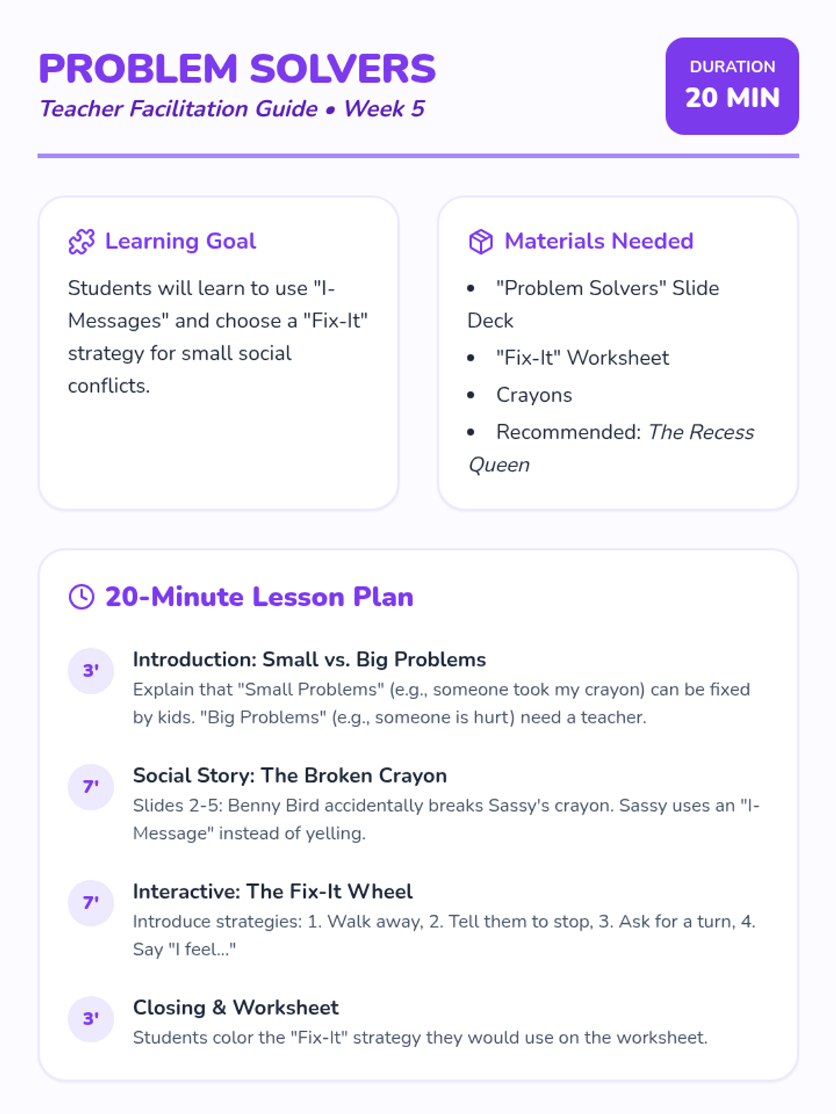 Teaches simple strategies for resolving small conflicts independently using 'I' messages and the 'Fix-It' wheel.