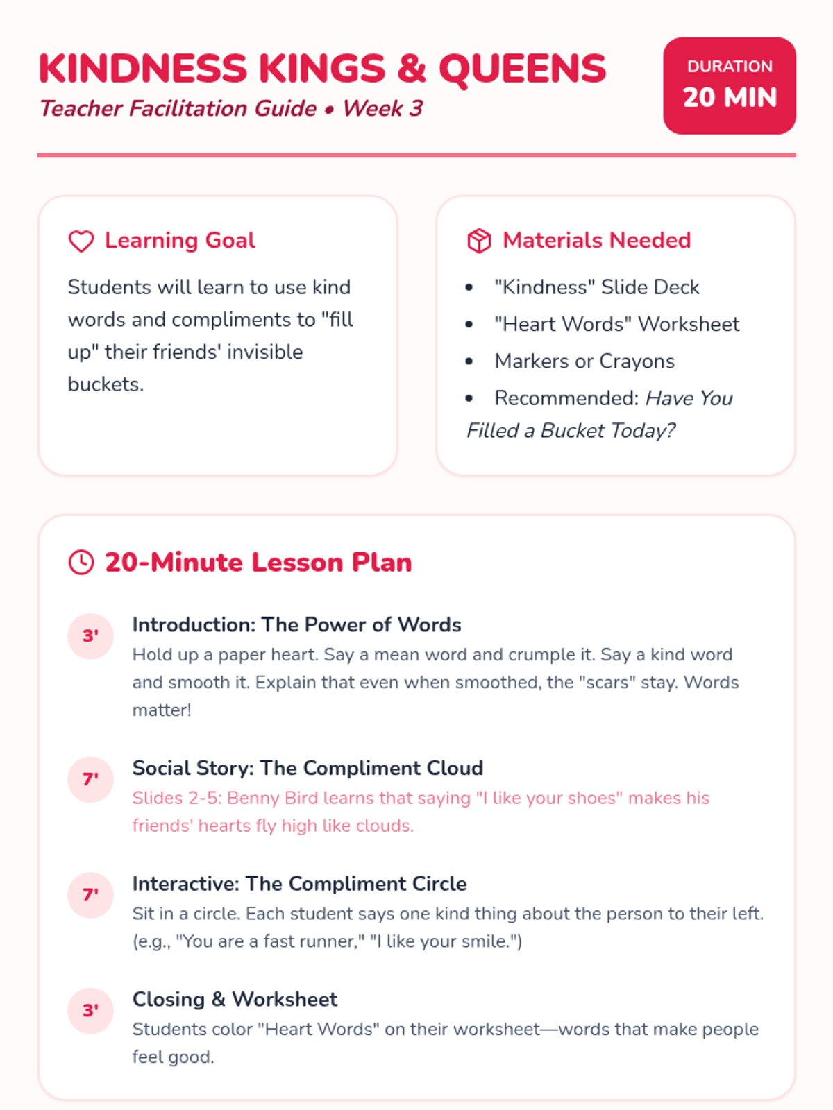 Students explore the power of kind words and compliments, learning how their speech affects others' feelings.