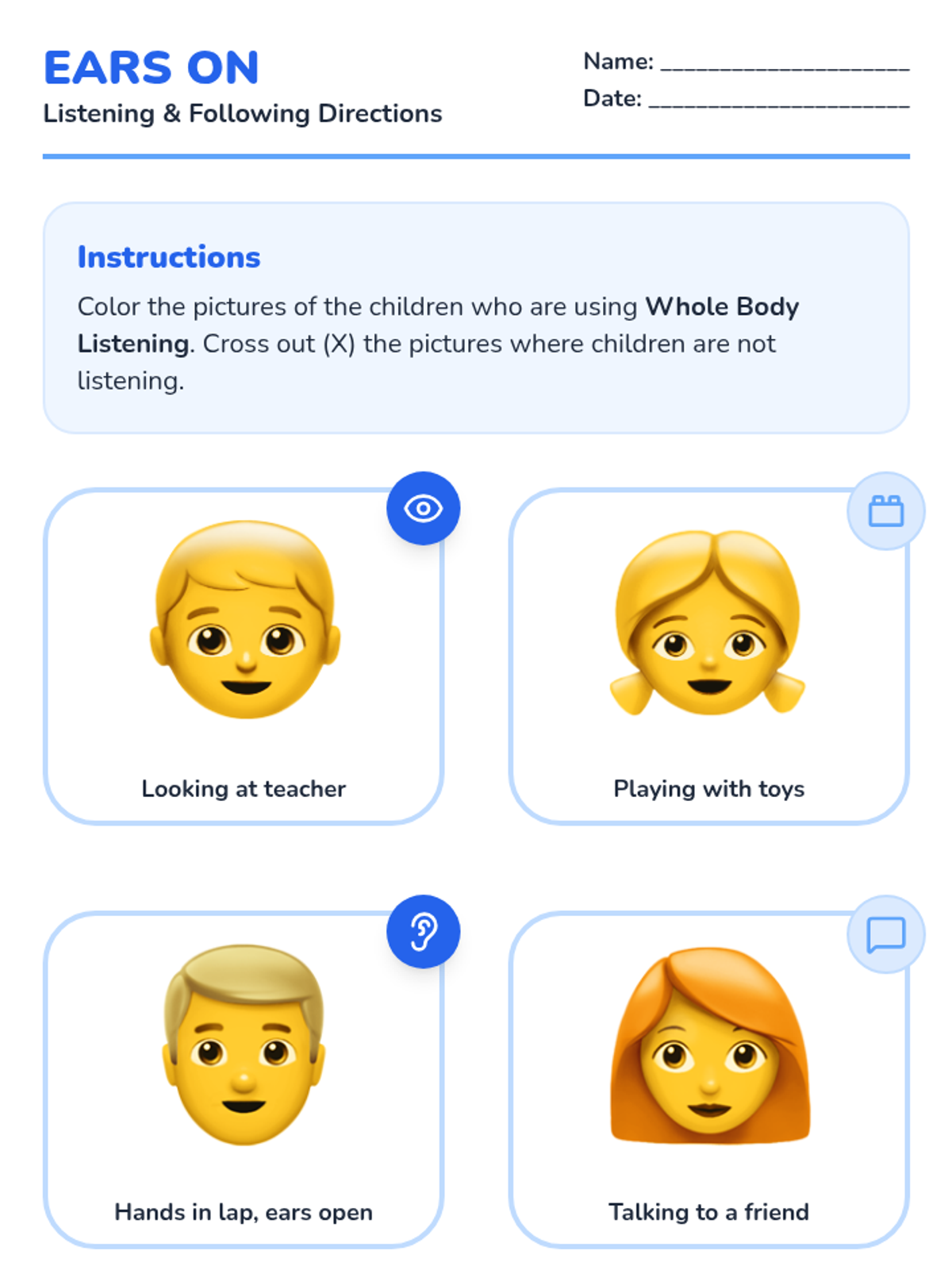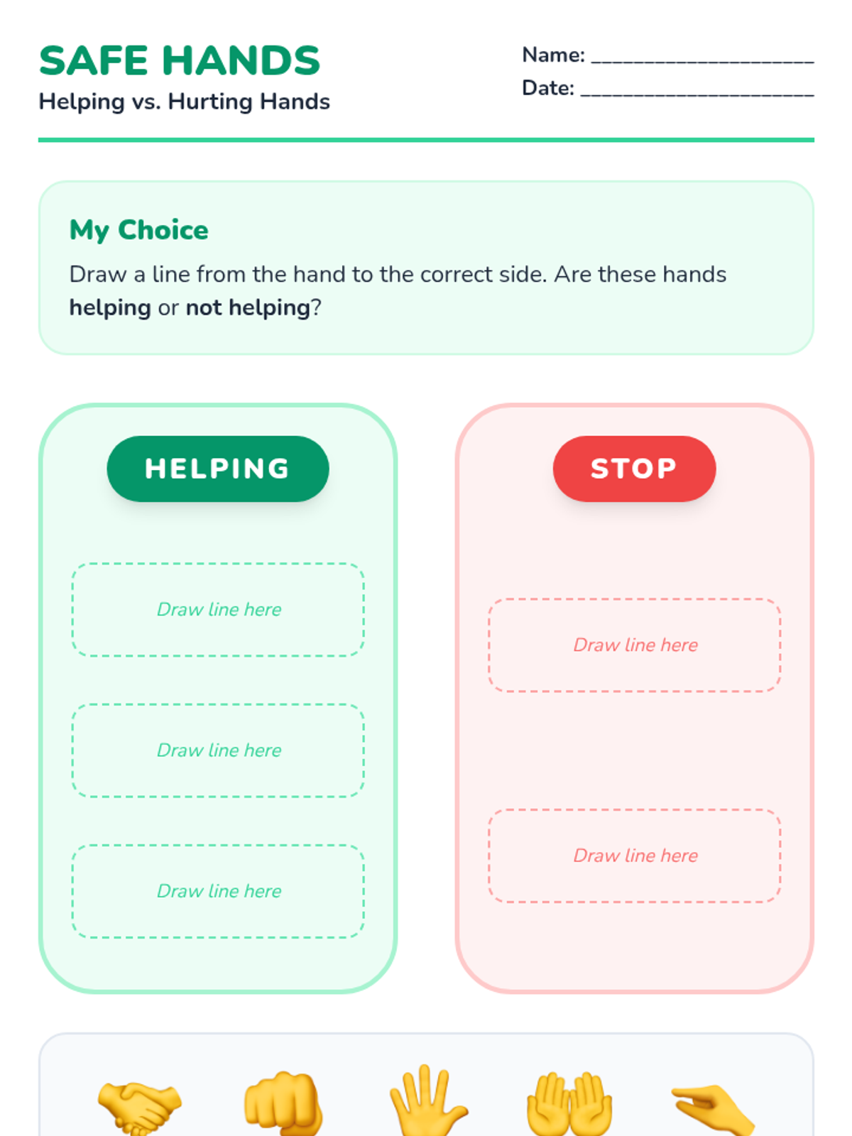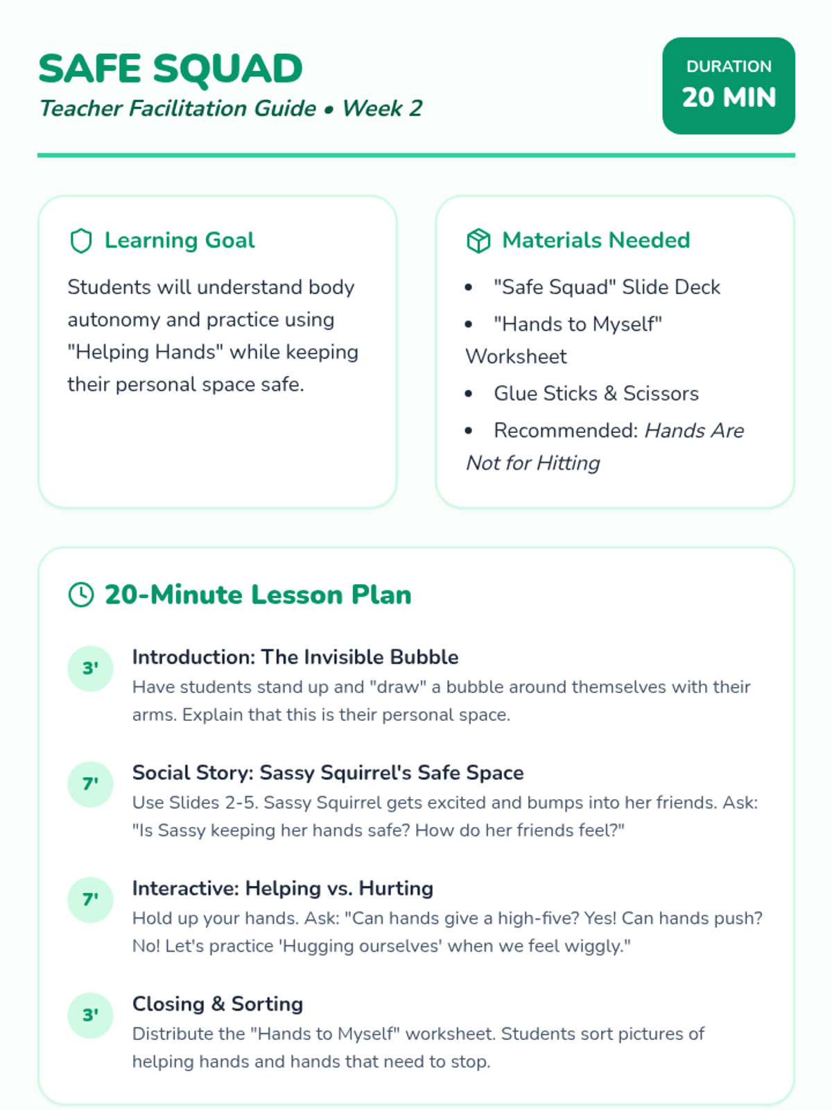 Focuses on body autonomy and safety, teaching students how to keep their hands and feet to themselves and use 'helping hands'.