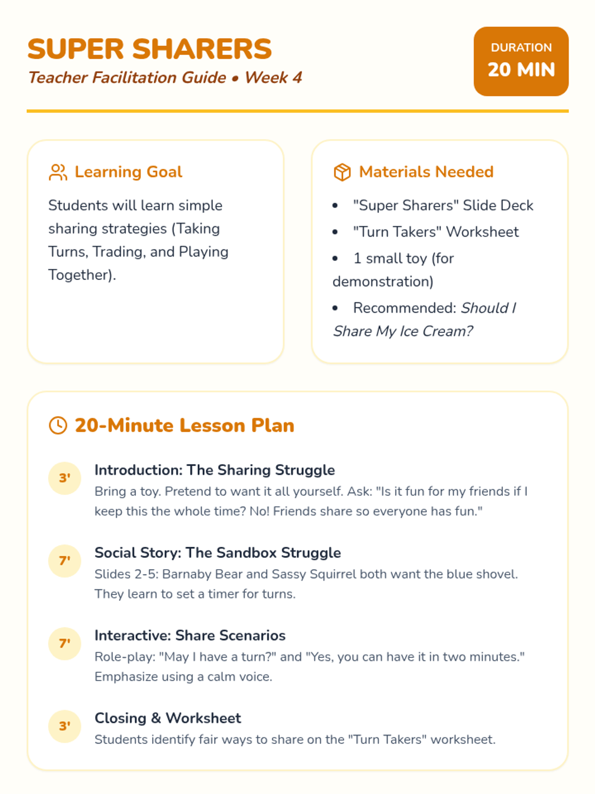 Covers the fundamentals of sharing toys and taking turns, emphasizing empathy and patience in play.