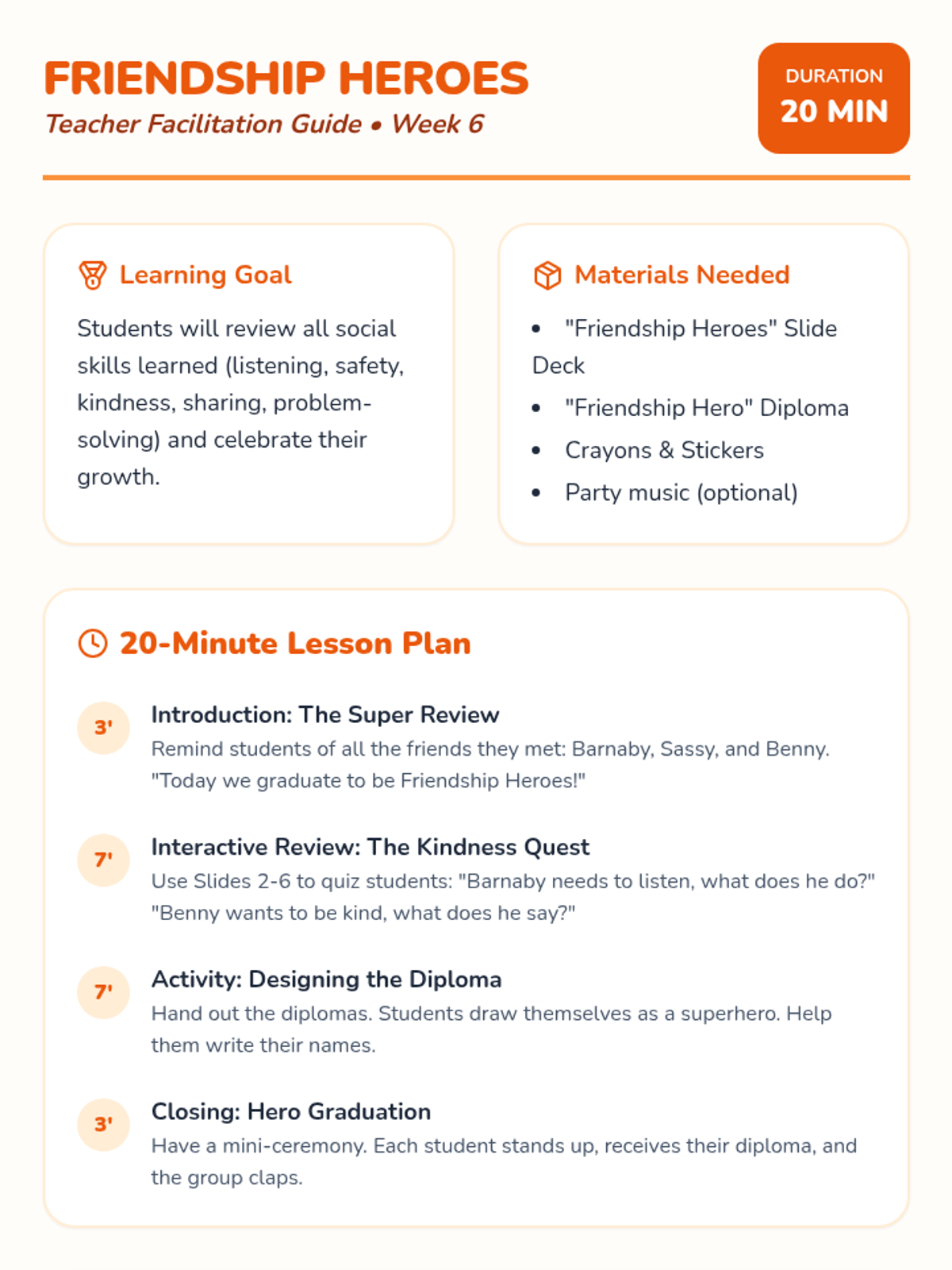 A cumulative review of all social skills learned, celebrating students' growth as 'Friendship Heroes'.