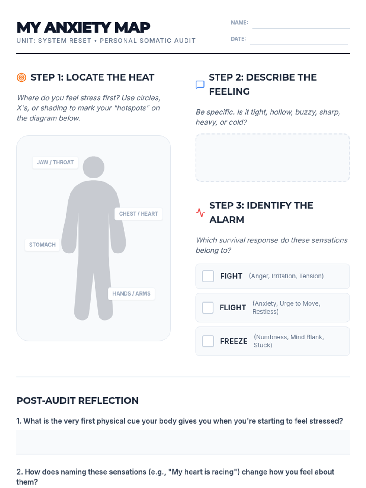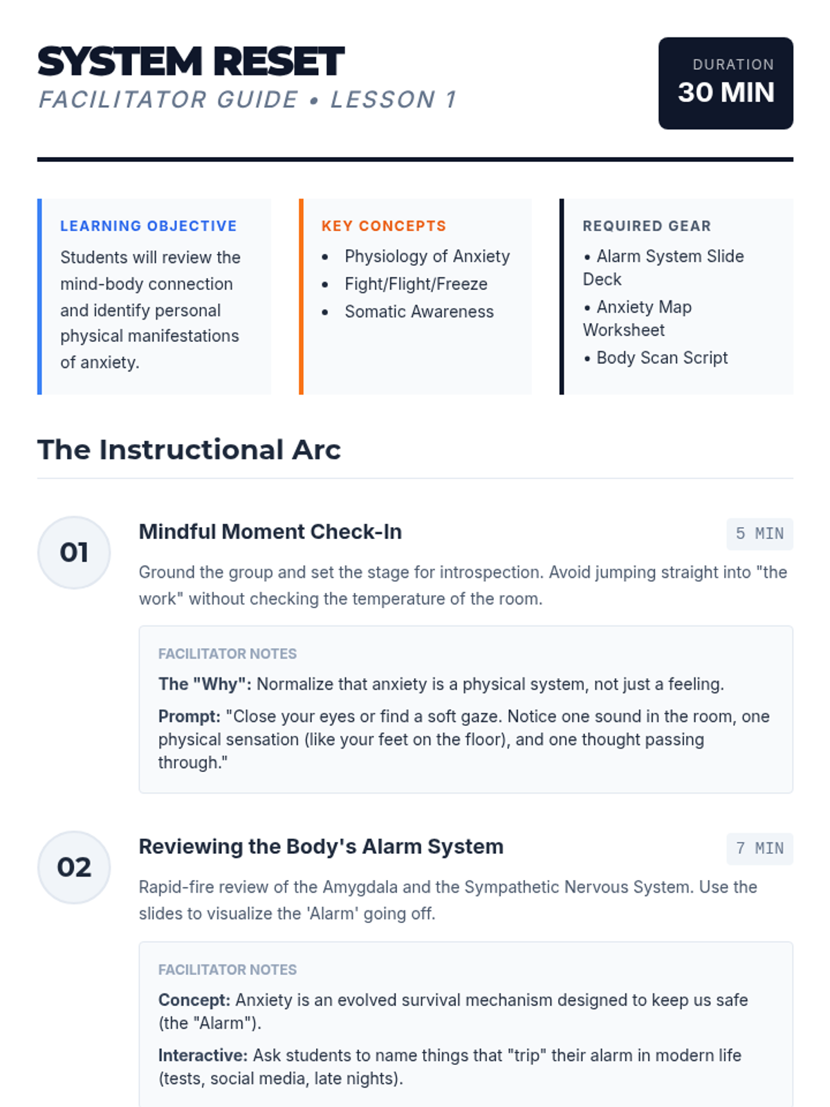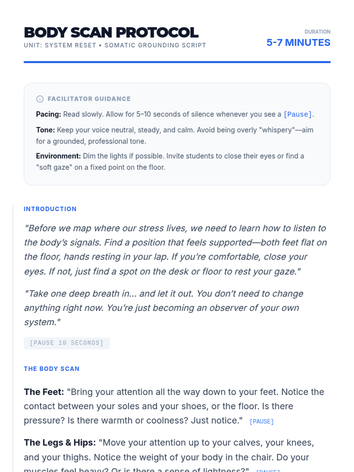 A 30-minute refresher lesson for 10th graders on the physiology of anxiety, the mind-body connection, and somatic awareness. Students identify physical manifestations of stress and practice a mindful body scan.