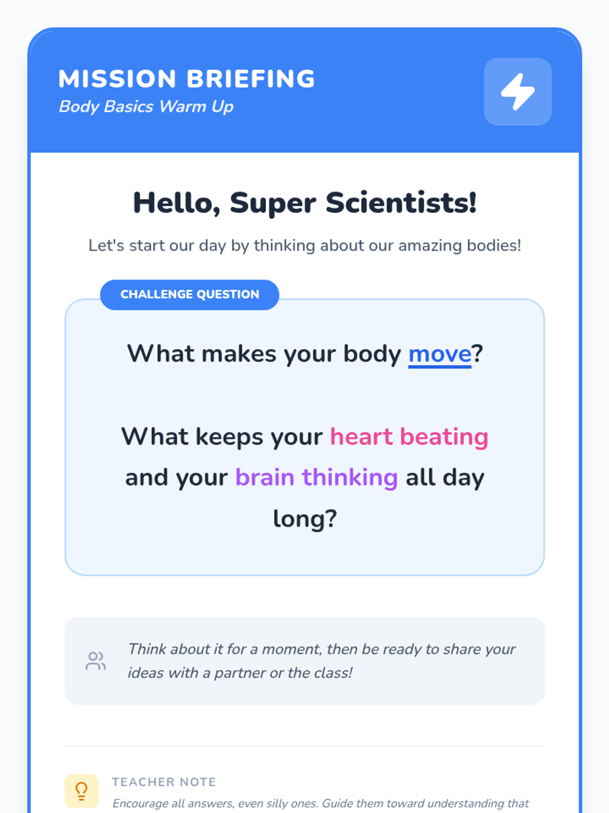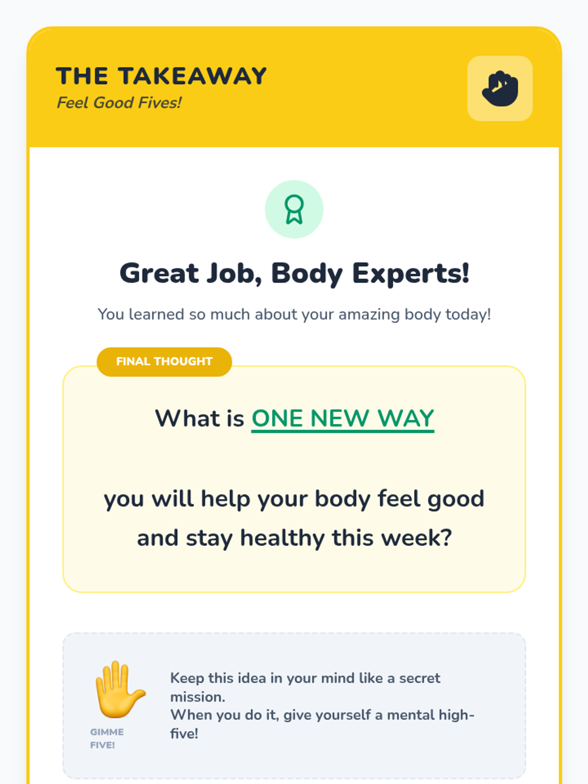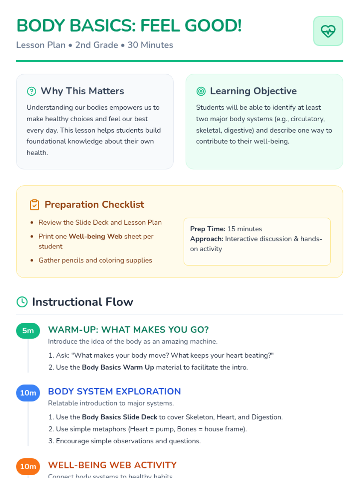 A 30-minute lesson for 2nd graders to understand major body systems and how to contribute to their own well-being through healthy habits.