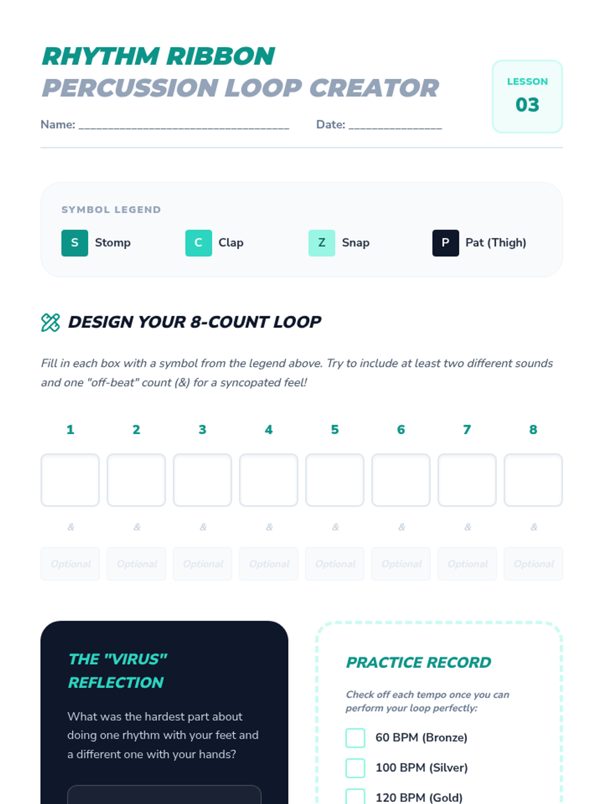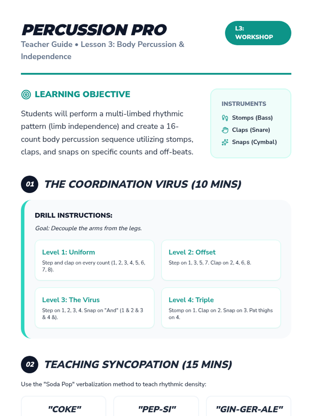 Developing limb independence and coordination by using the body as a percussion instrument with complex rhythmic patterns.