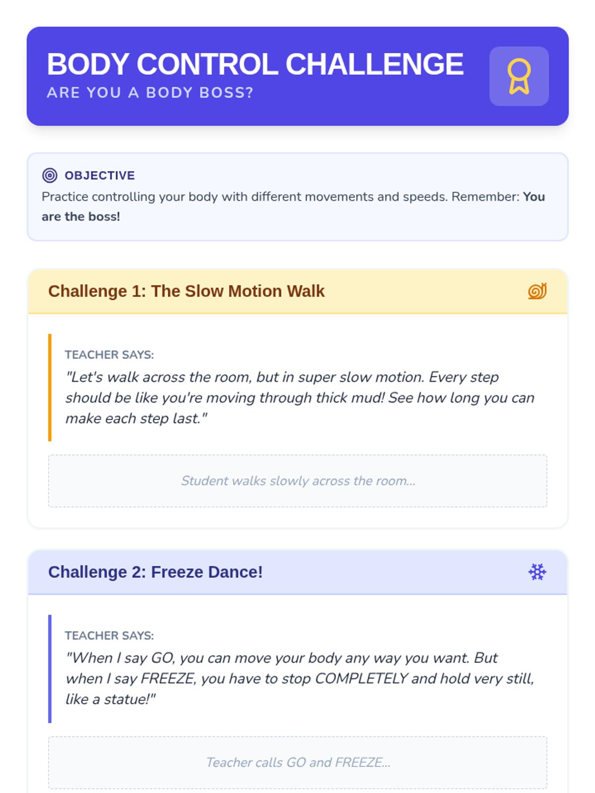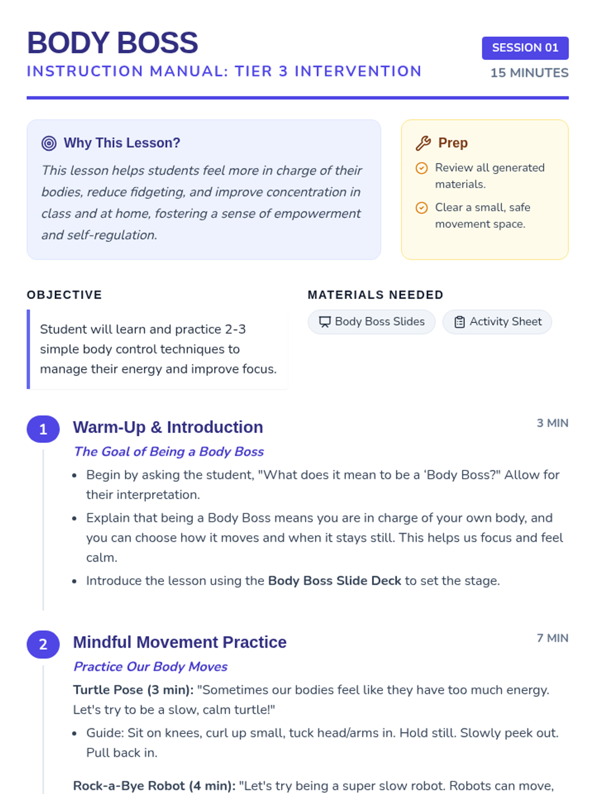 A 15-minute Tier 3 intervention for 1st-grade students with ADHD, focusing on developing body awareness and self-control through mindful movement and 'Body Boss' techniques.