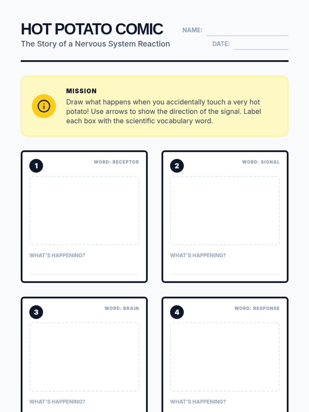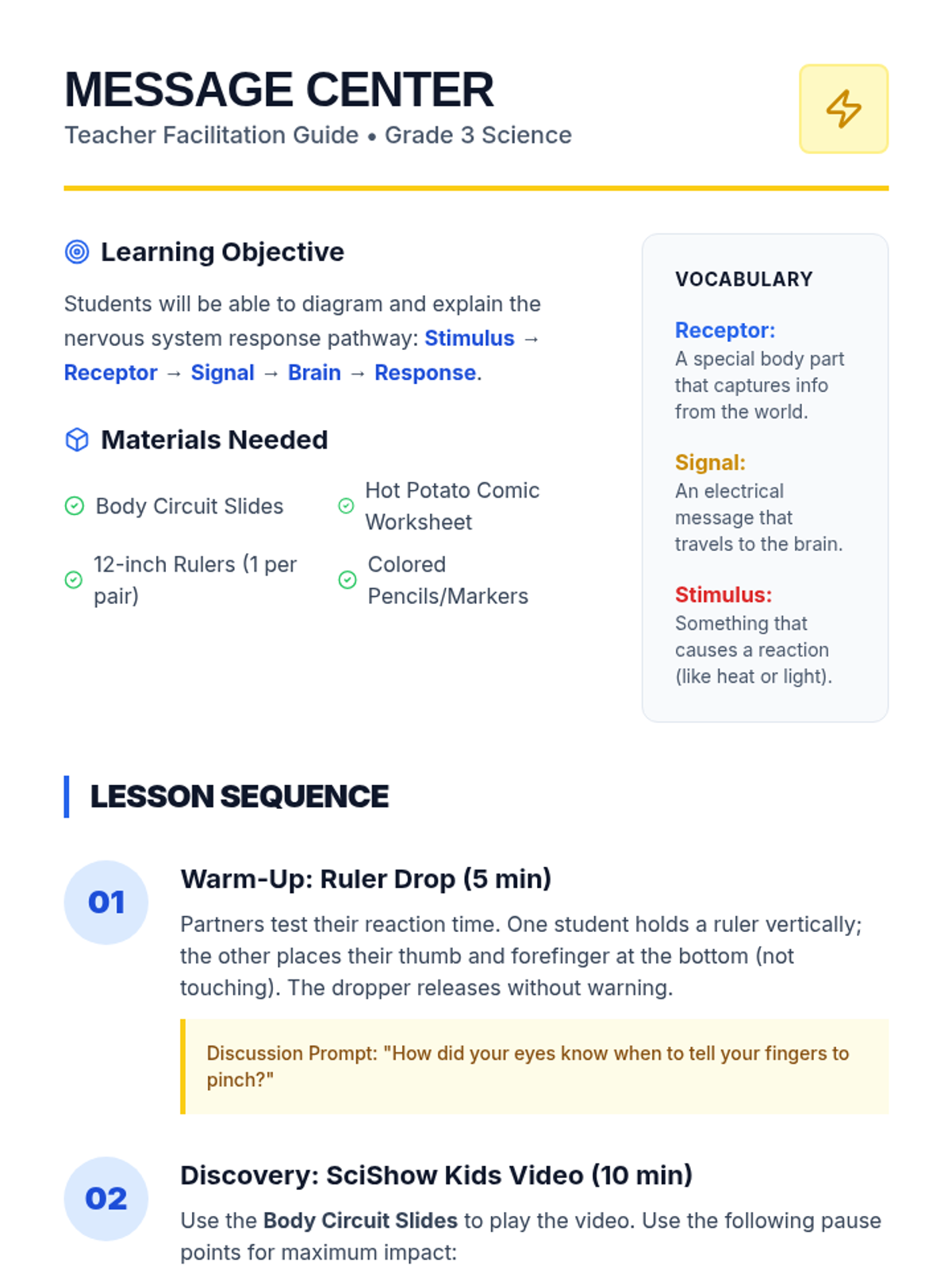 Students explore how the nervous system processes information by tracing the path from a stimulus to a response. Through a hands-on reaction game, a guided video exploration, and a creative comic strip project, students learn the roles of receptors, signals, and the brain.