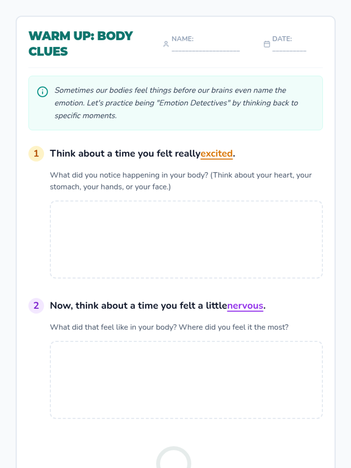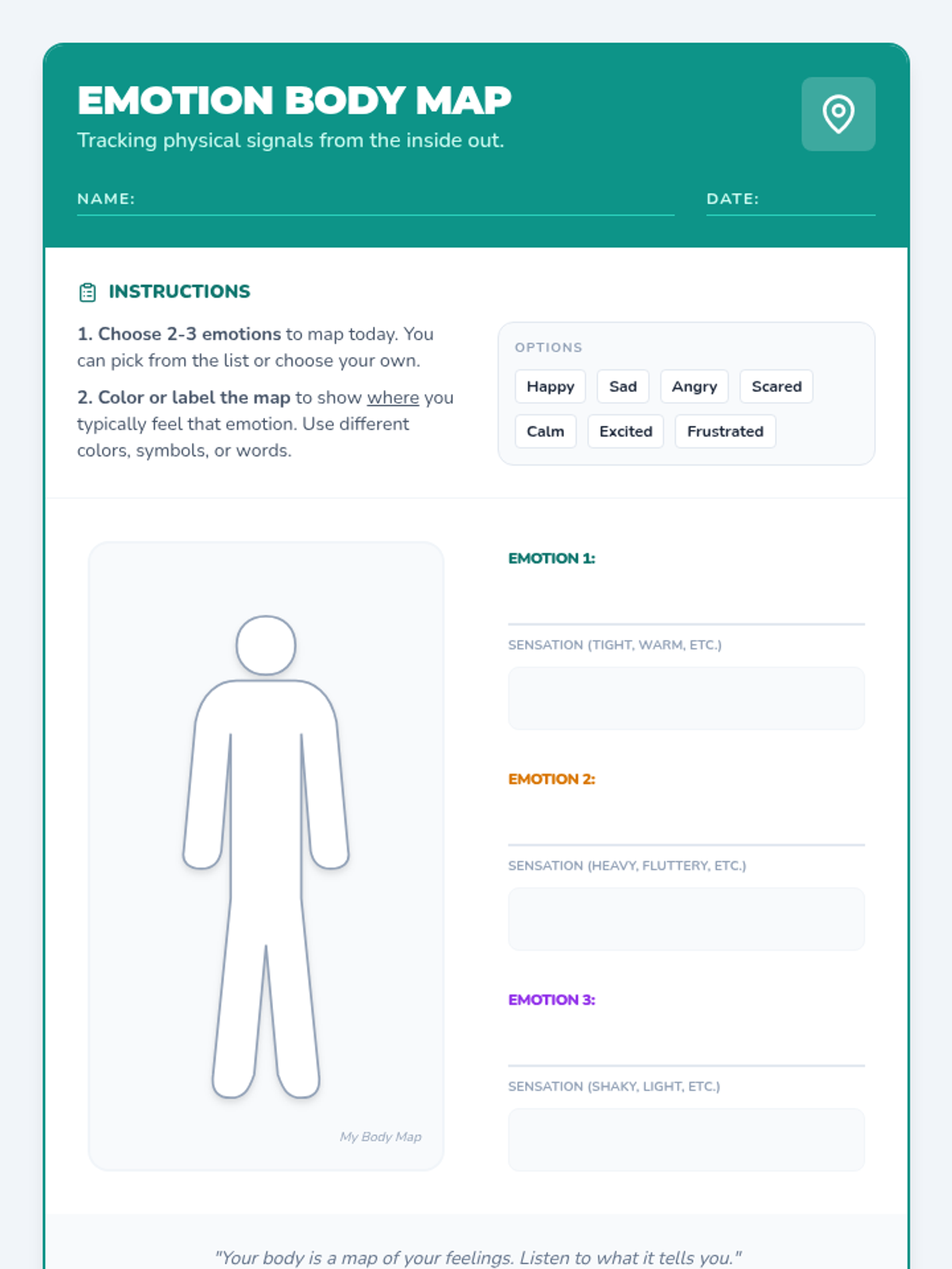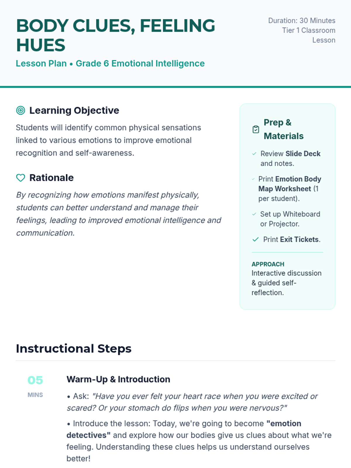 This lesson helps 6th-grade students recognize physical sensations associated with different emotions, fostering greater self-awareness and emotional intelligence. Students explore how their bodies provide important clues about what they are feeling through interactive discussion and a body mapping activity.