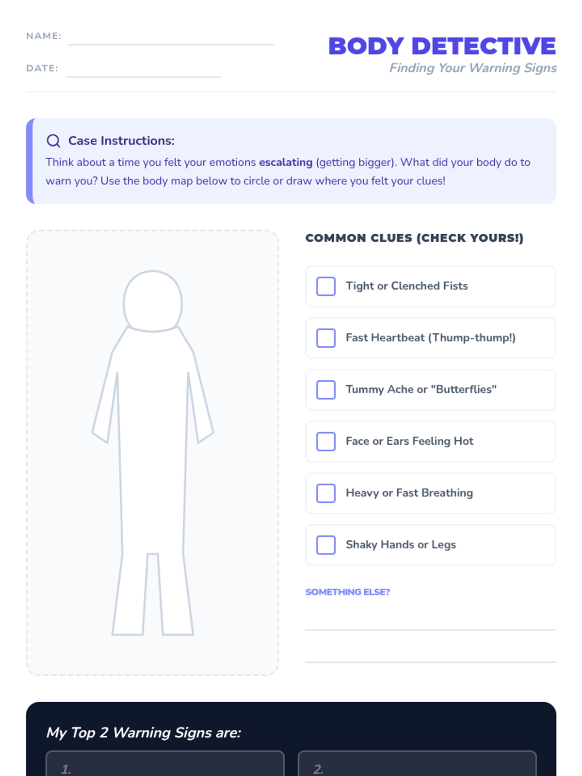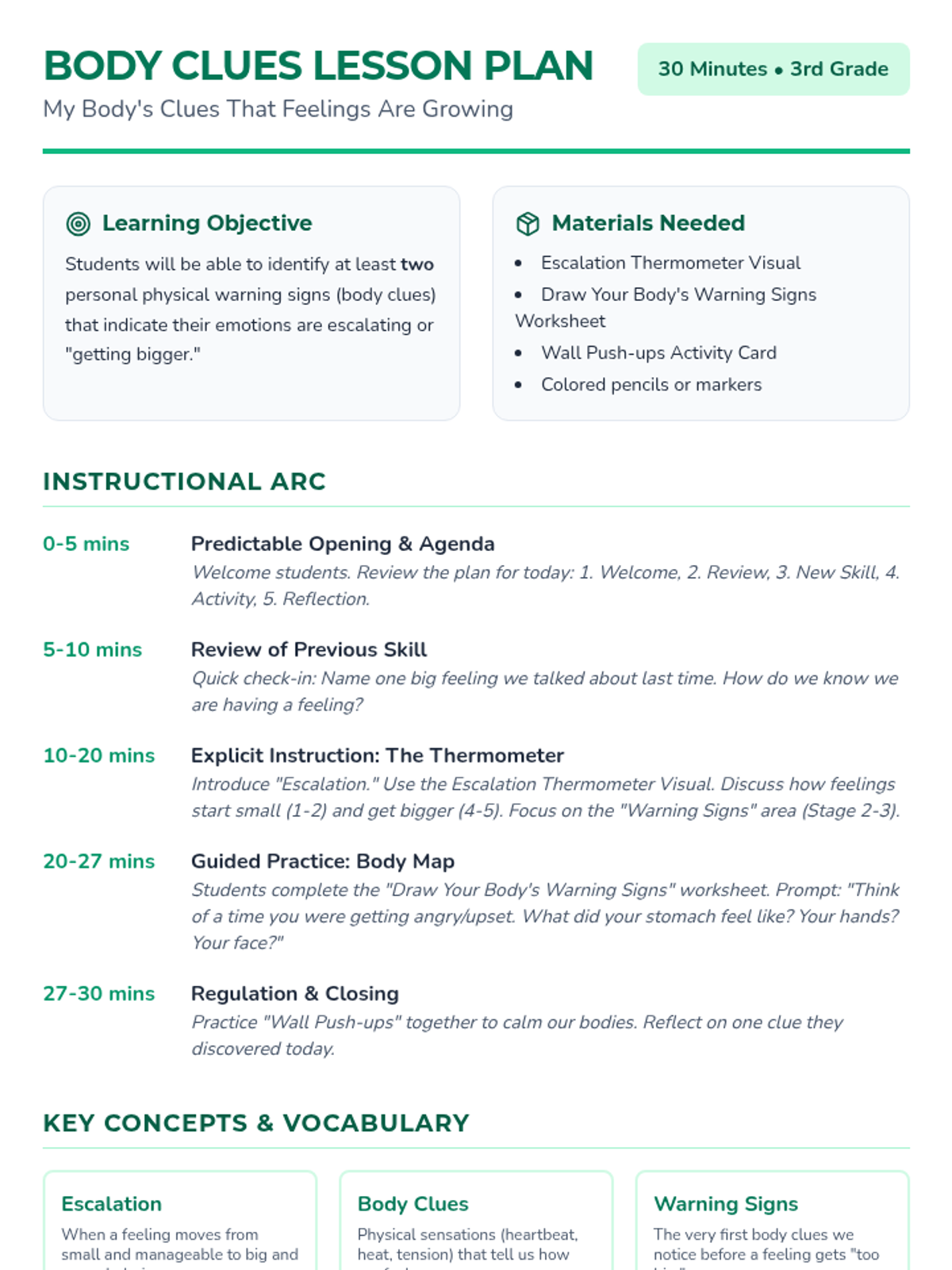 A 30-minute lesson helping 3rd graders identify the physical sensations that signal their emotions are escalating. Students explore the concept of early warning signs and create a personal body map of these clues.