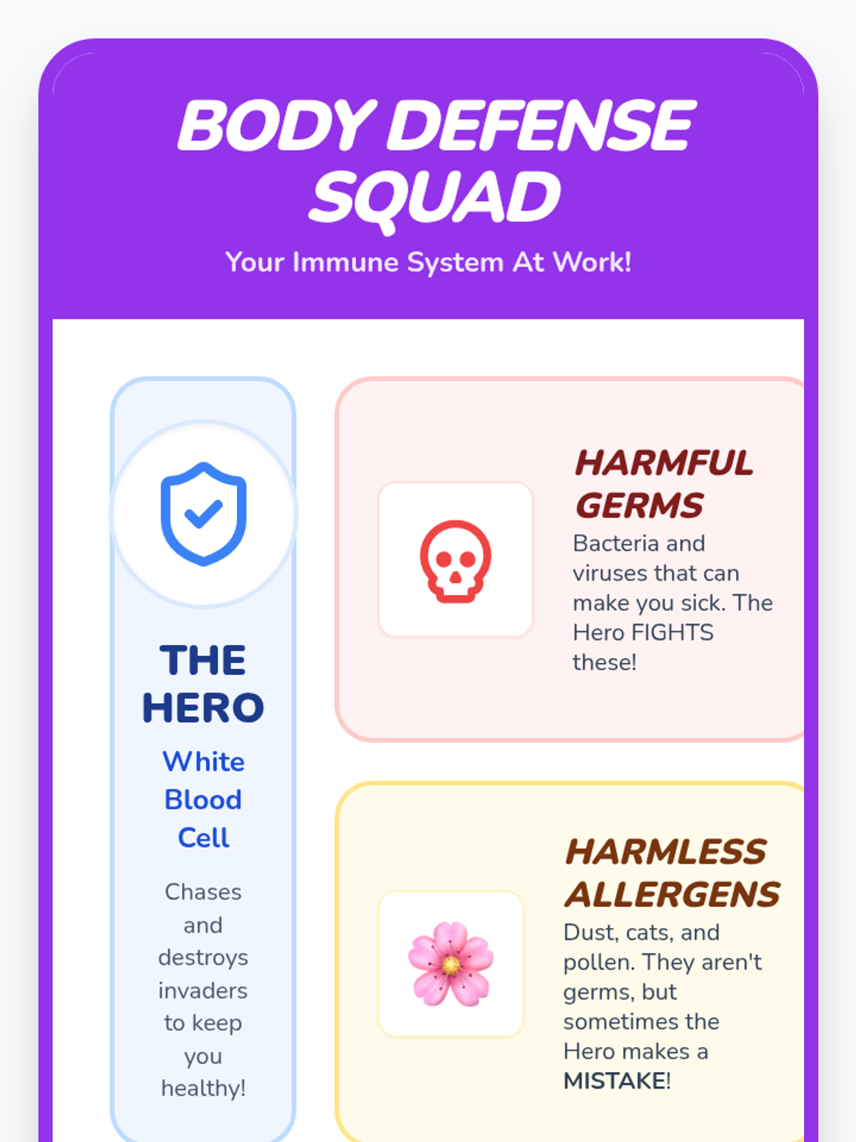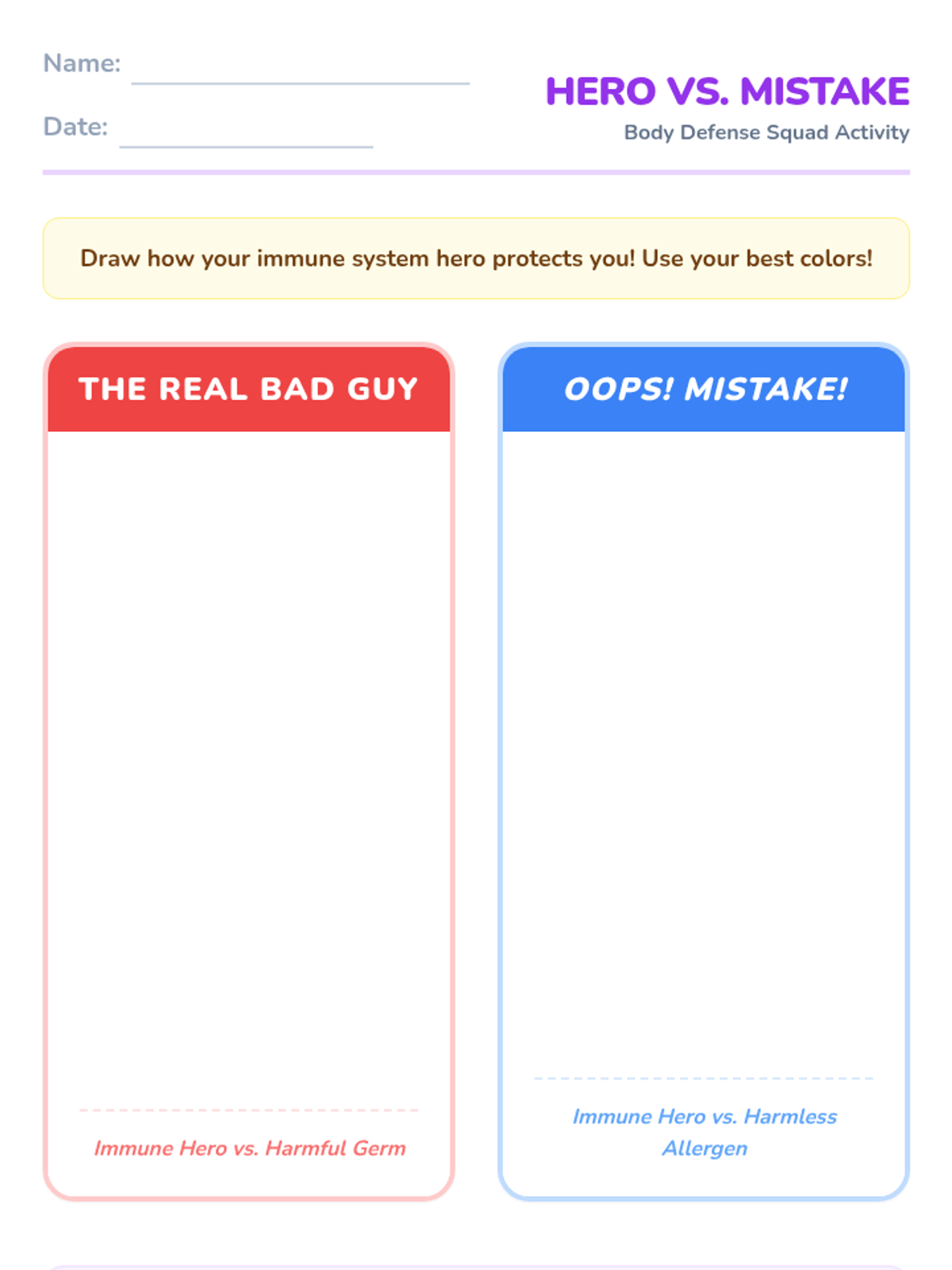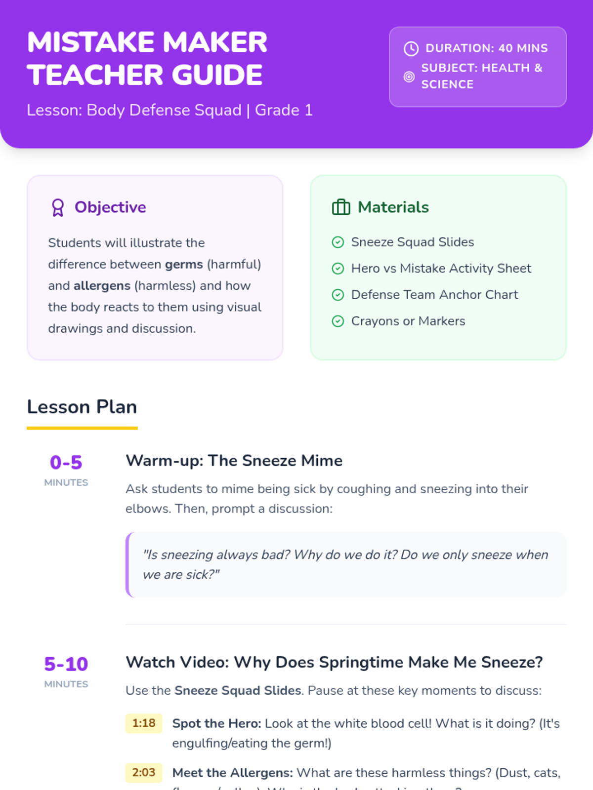 Students explore how the immune system works, distinguishing between its response to harmful germs and its "mistaken" response to harmless allergens. The lesson uses a SciShow Kids video to ground concepts in relatable symptoms like sneezing and runny noses.