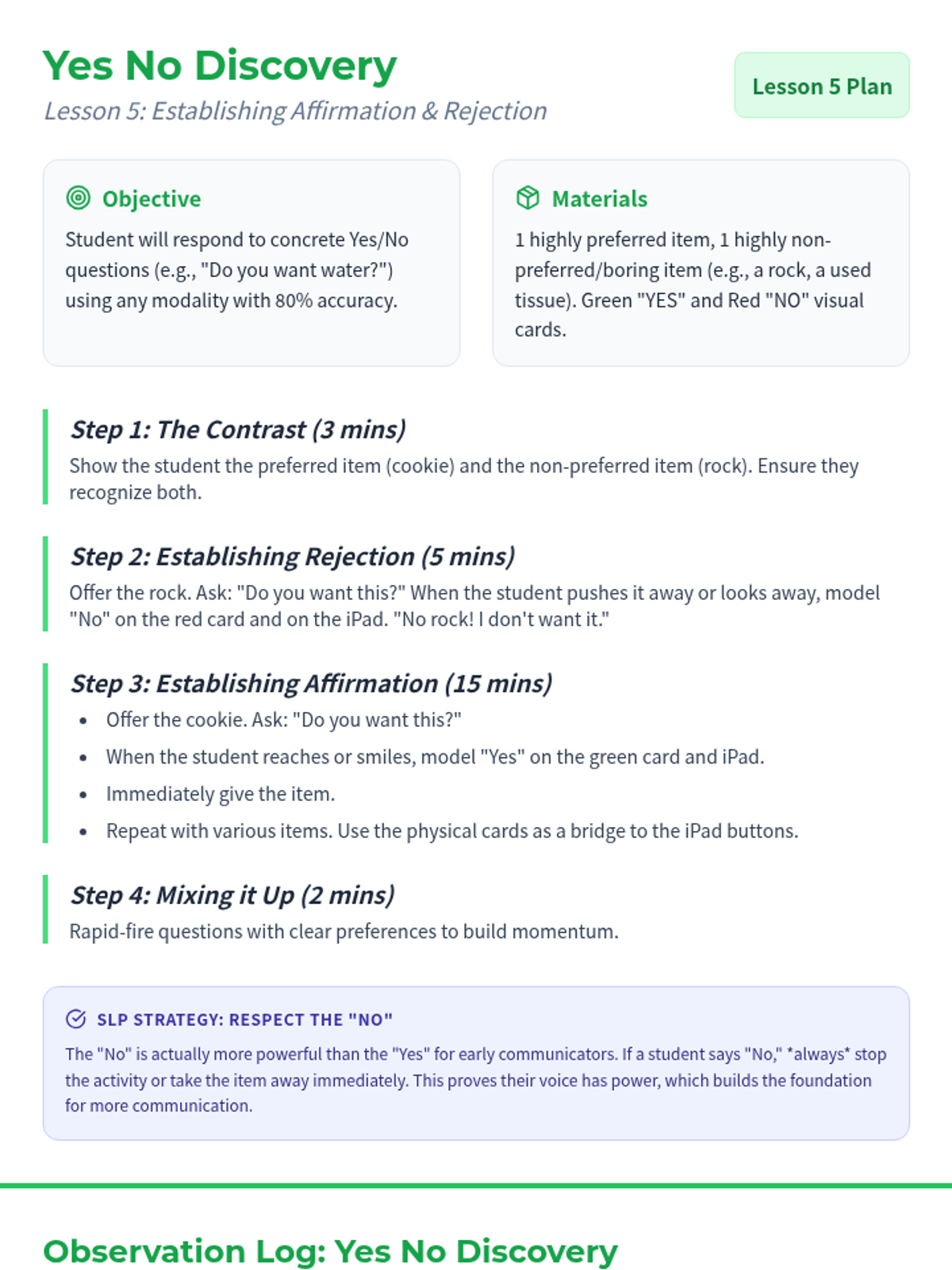 Establishing basic Yes and No responses using visual aids and AAC buttons.