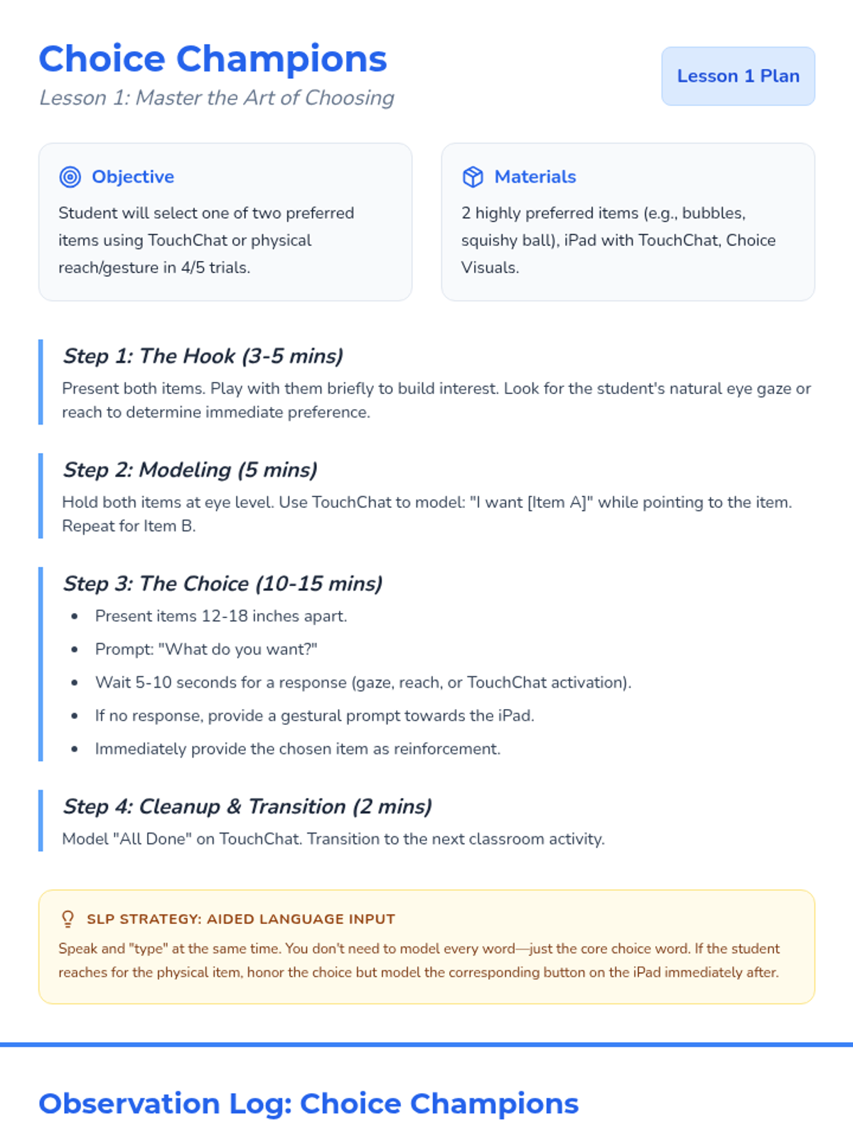 Introduction to making a choice between two highly preferred items using TouchChat and physical indicators.