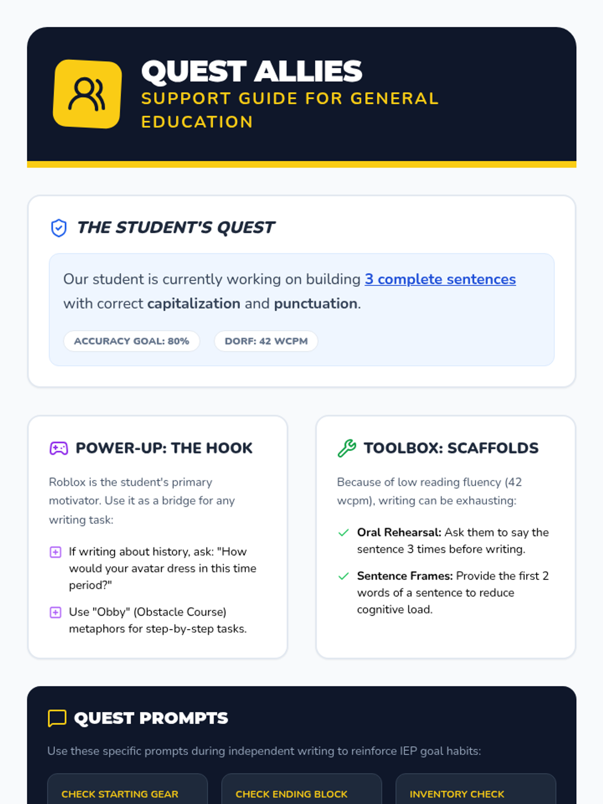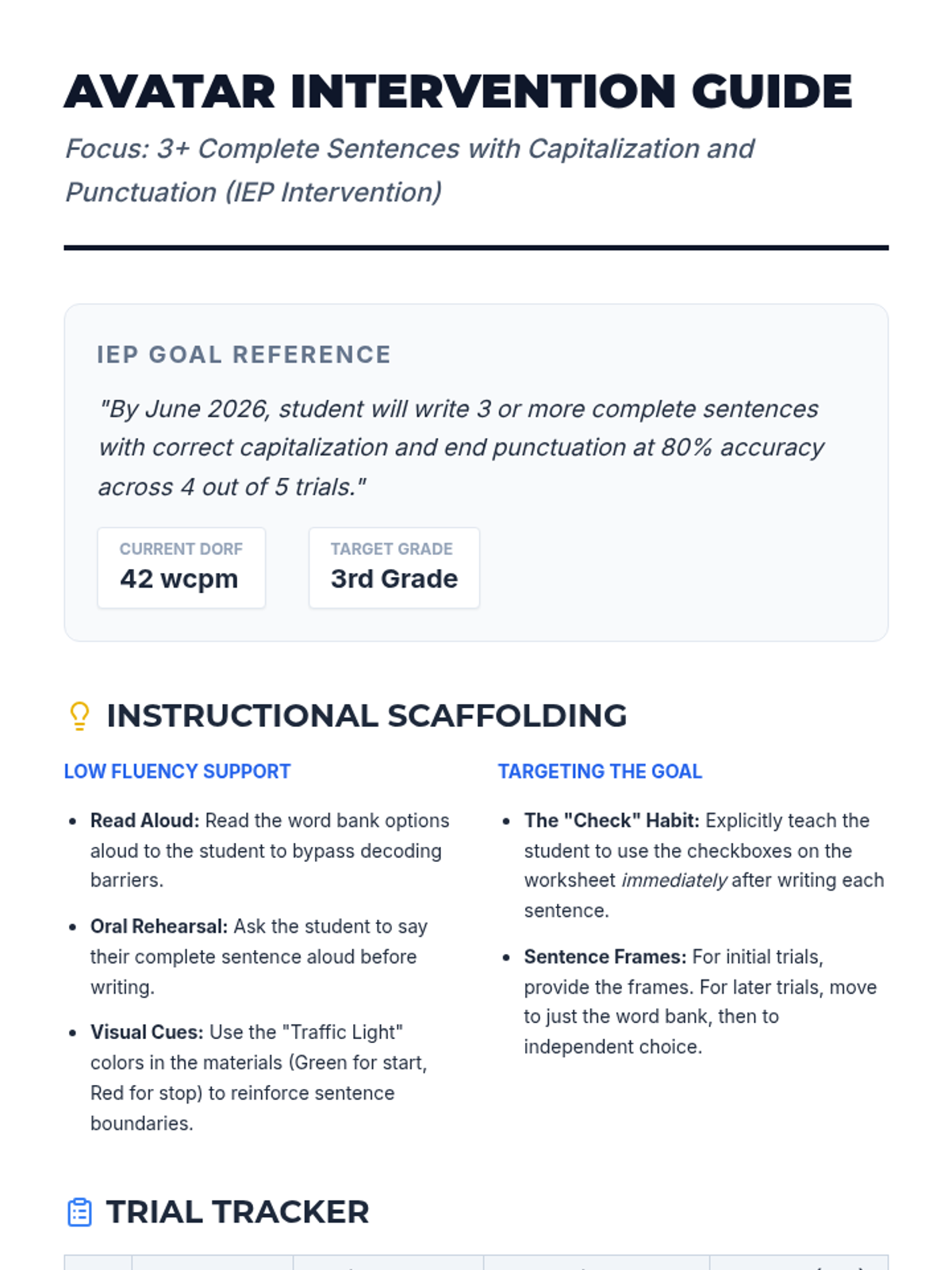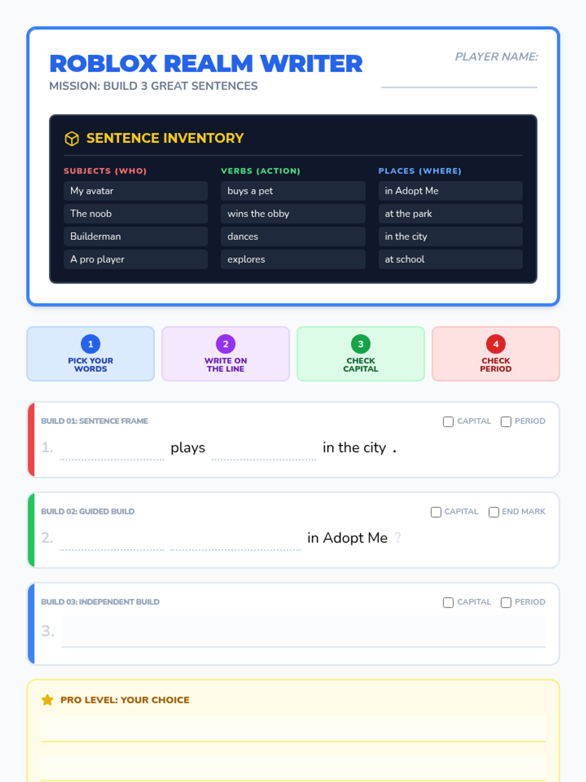 A specialized writing intervention lesson using Roblox themes to help students master basic sentence structure, capitalization, and punctuation through sentence frames and word banks.