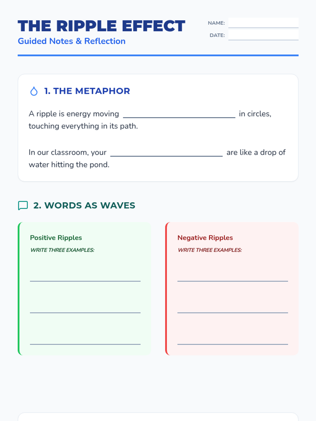 A Social Emotional Learning lesson exploring the concept of the ripple effect, helping students understand how their individual choices and behaviors impact their peers and the overall classroom environment.