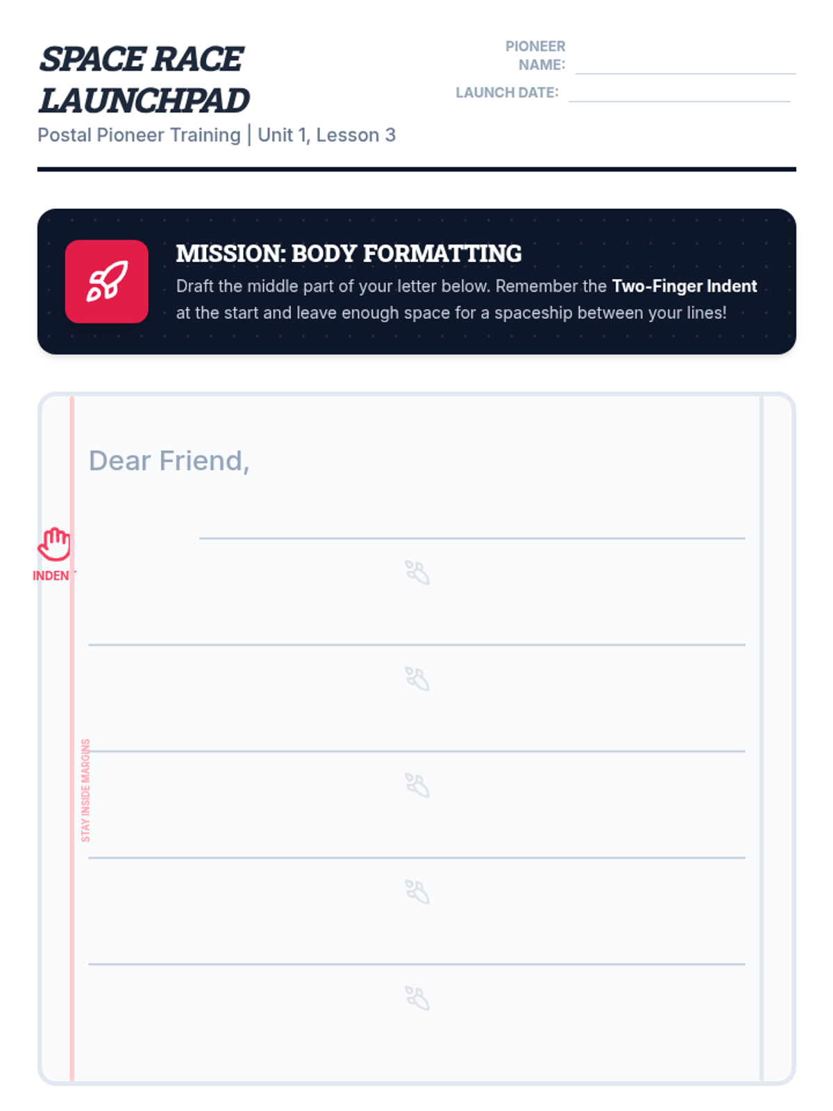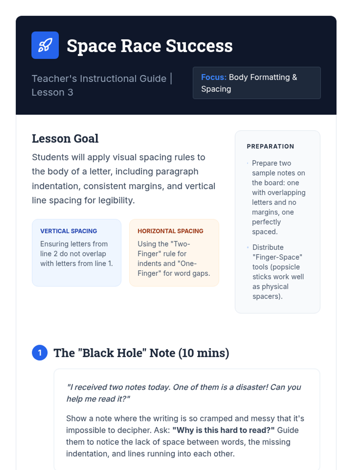 Students learn how to align the body of the letter and maintain consistent spacing. They contrast messy and clear writing to understand the importance of legibility.
