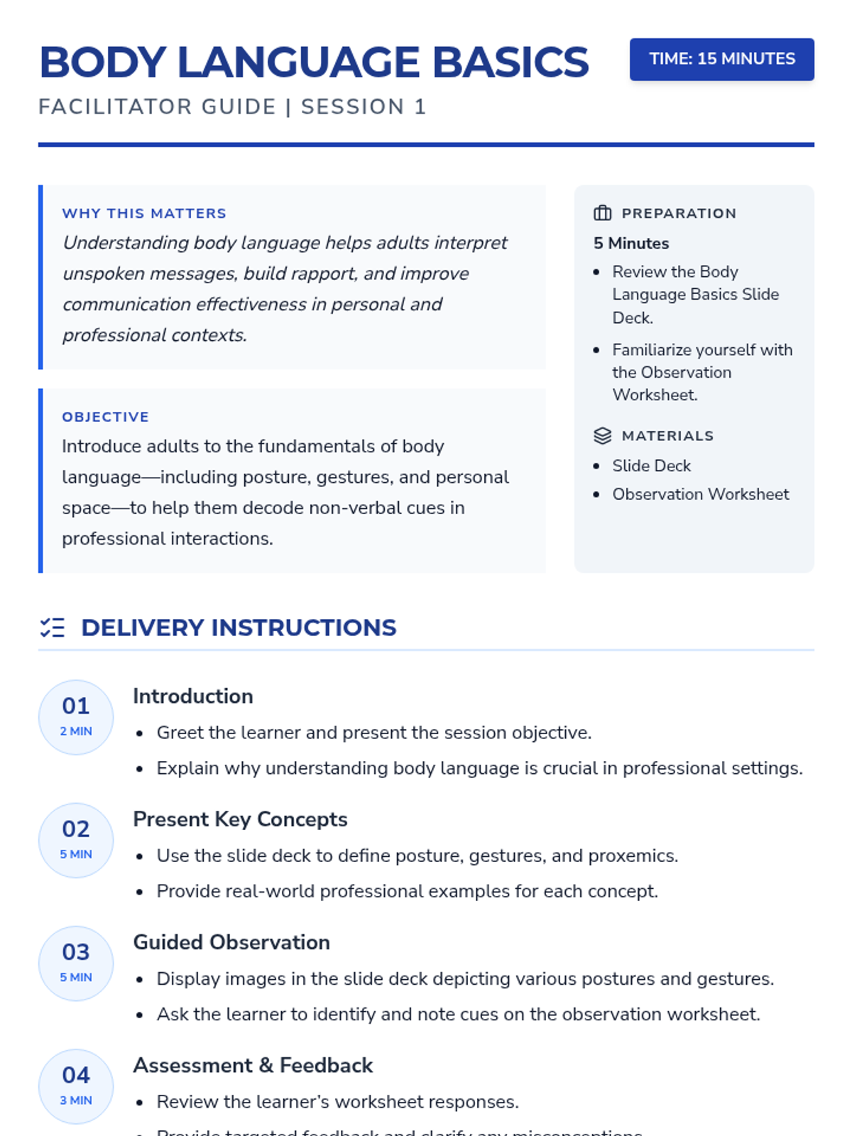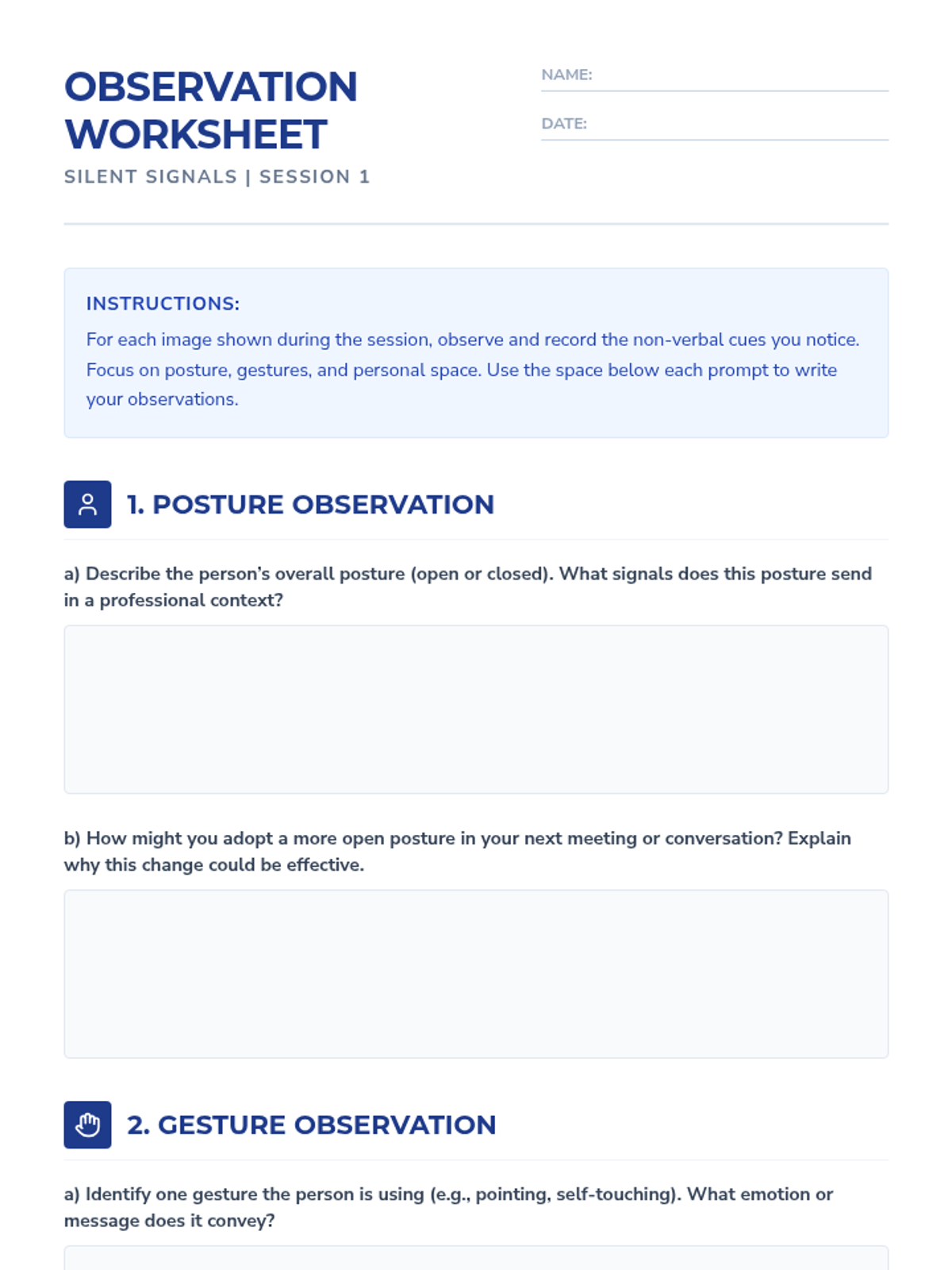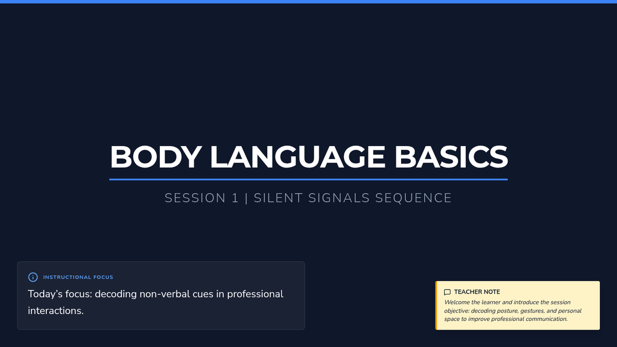 Introduces the fundamentals of body language, including posture, gestures, and personal space (proxemics), in a professional context.